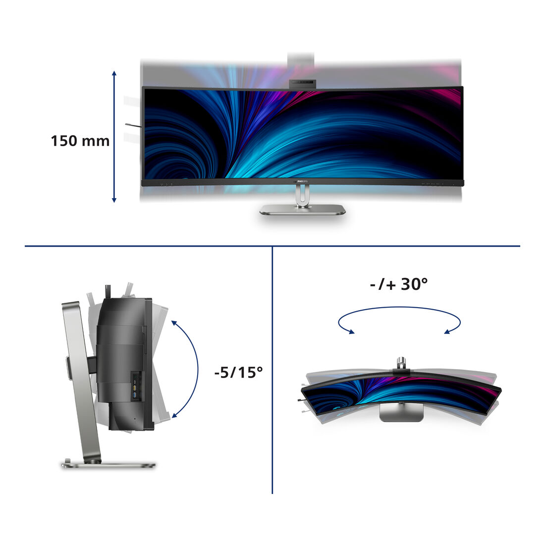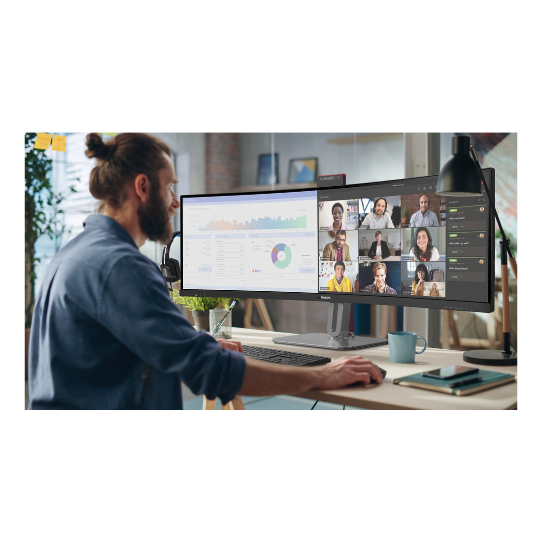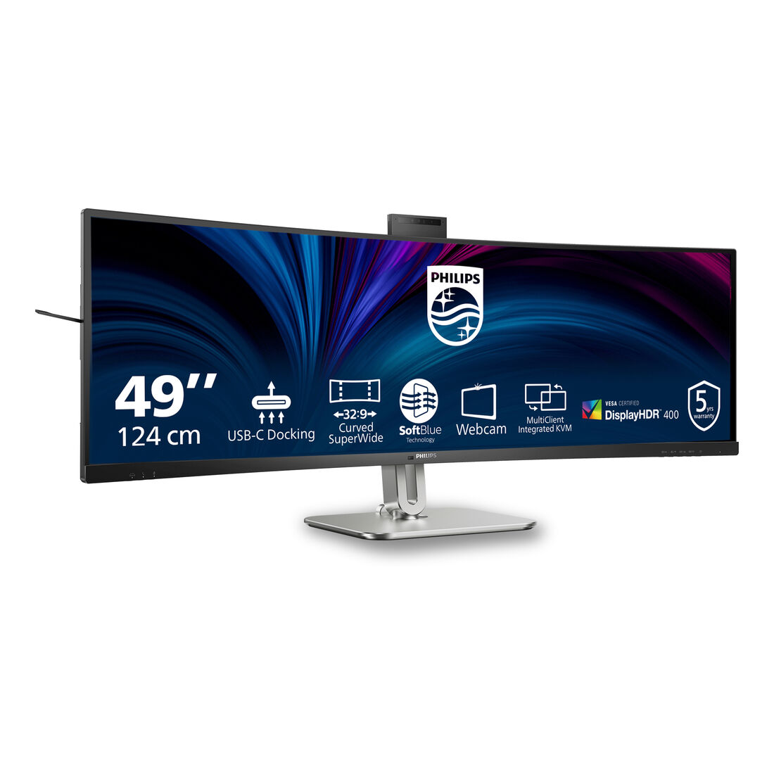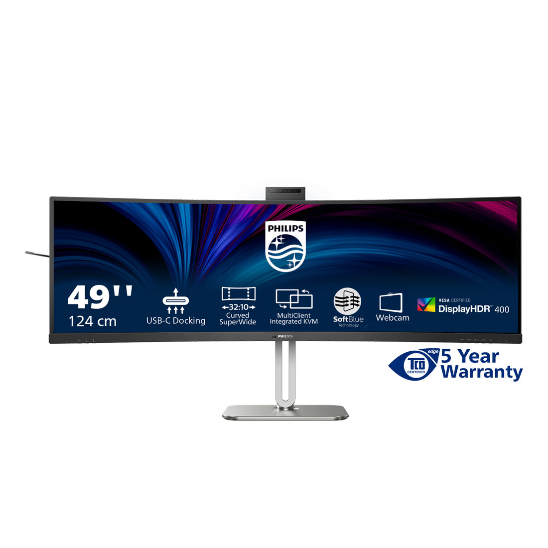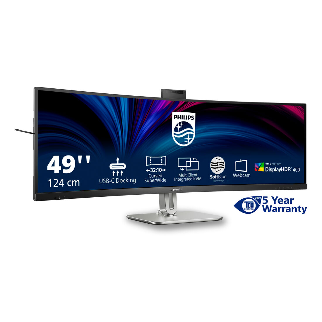 Philips 49B2U6900CH/00. Dimensioni diagonale schermo: 124 cm (48.8″), Risoluzione del display: 5120 x 1440 Pixel, Tipologia HD: Dual QHD, Tecnologia display: LCD, Tempo di risposta: 4 ms, Rapporto d’aspetto nativo: 32:9, Angolo di visualizzazione (orizzontale): 178°, Angolo di visualizzazione (verticale): 178°. Altoparlanti incorporati. Hub USB integrato, Versione dell’hub USB: 3.2 Gen 2 (3.1 Gen 2). Montaggio standard VESA, Regolazione altezza. Colore del prodotto: Nero