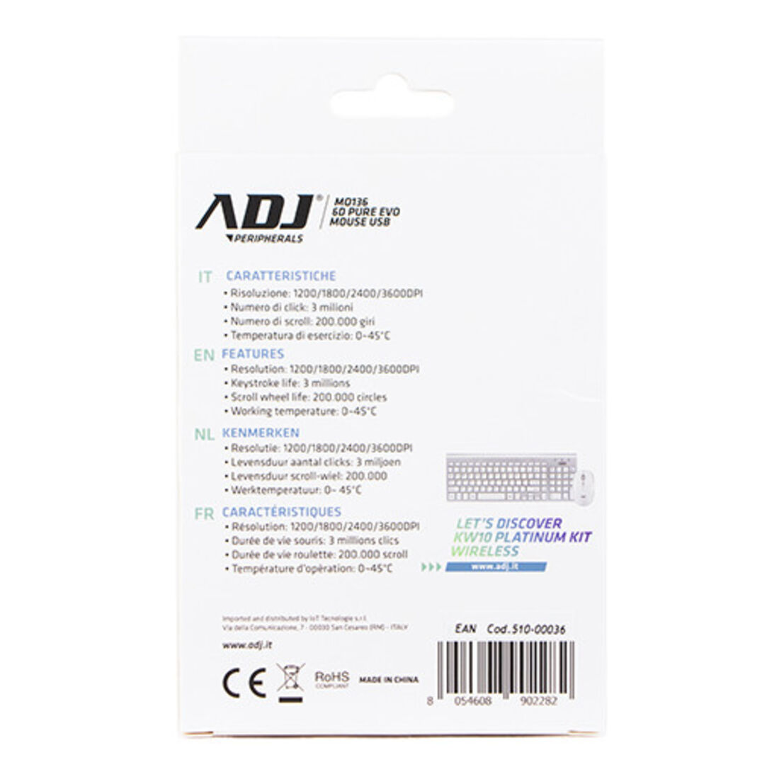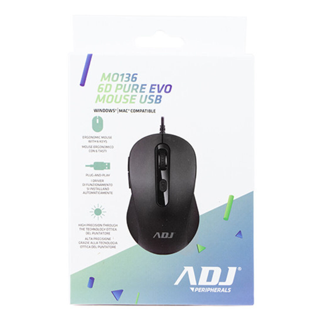 Adj Pure Evo MO136. Fattore di forma: Mano destra. Tecnologia di rilevamento del movimento: Ottico, Interfaccia dispositivo: USB tipo A, Risoluzione movimento: 3600 DPI, Tipo di pulsanti: Tasti premuti, Numero di tasti: 3, Tipo di scorimmento: Rotella. Alimentazione: Cavo. Colore del prodotto: Nero