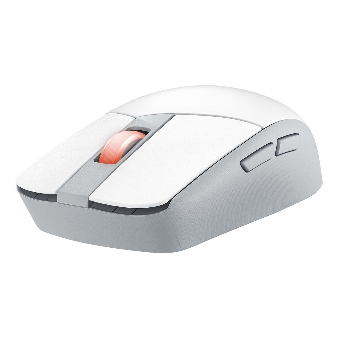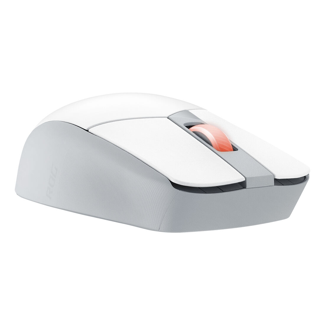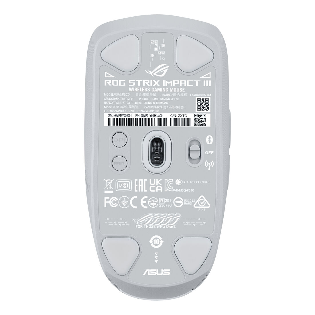ASUS ROG Strix Impact III Wireless. Fattore di forma: Ambidestro. Tecnologia di rilevamento del movimento: Ottico, Interfaccia dispositivo: RF senza fili + Bluetooth, Risoluzione movimento: 36000 DPI, Tipo di scorimmento: Rotella, Accelerazione (max): 50 G. Alimentazione: Batterie. Colore del prodotto: Bianco