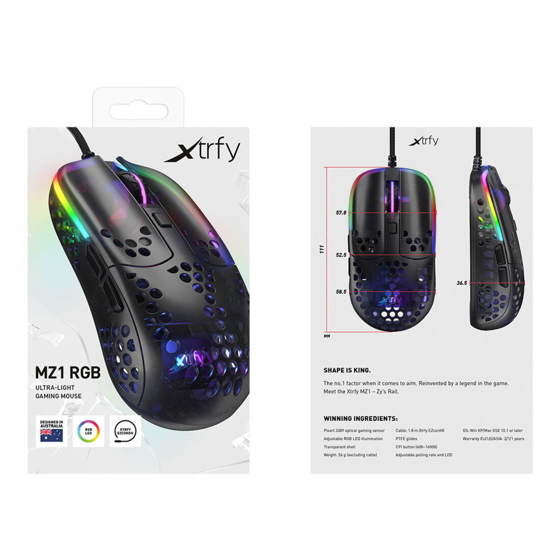 CHERRY XTRFY MZ1 Gaming Maus – schwarz – Maus – Optisc. Fattore di forma: Ambidestro. Tecnologia di rilevamento del movimento: Ottico, Interfaccia dispositivo: USB tipo A, Risoluzione movimento: 16000 DPI, Tipo di pulsanti: Tasti premuti, Tipo di scorimmento: Rotella, Accelerazione (max): 50 G. colore d’illuminazione: Multi. Alimentazione: Cavo. Colore del prodotto: Nero