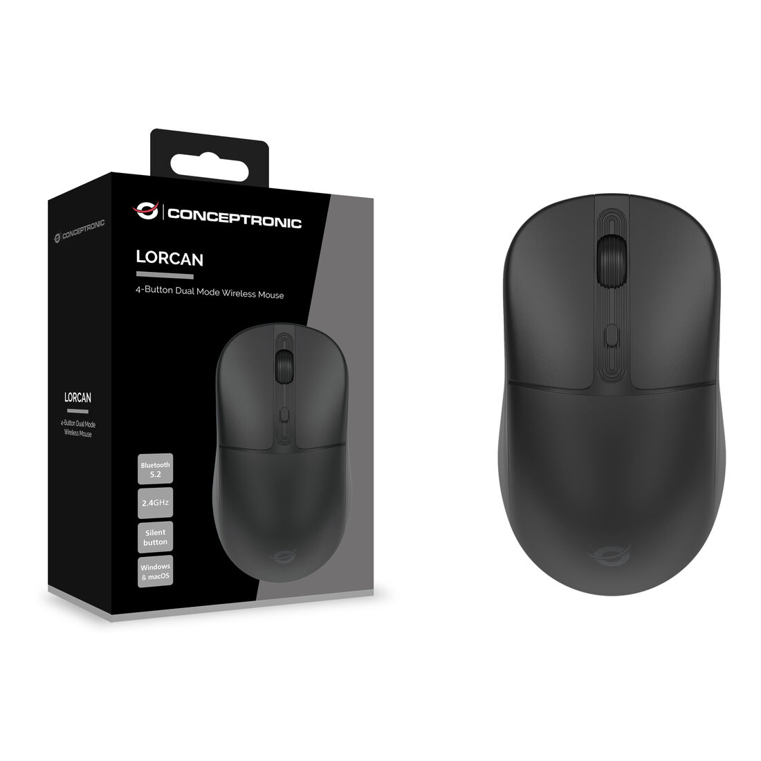 Conceptronic LORCAN04B. Fattore di forma: Ambidestro. Tecnologia di rilevamento del movimento: Ottico, Interfaccia dispositivo: RF senza fili + Bluetooth, Risoluzione movimento: 1600 DPI, Tipo di pulsanti: Tasti premuti, Numero di tasti: 4, Tipo di scorimmento: Rotella. Alimentazione: Batterie. Colore del prodotto: Nero