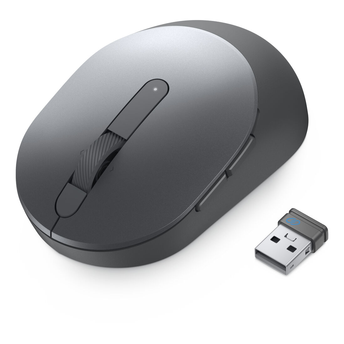 DELL Mouse compatto Pro Plus – MS5120W – Titan Gray (grigio). Fattore di forma: Ambidestro. Tecnologia di rilevamento del movimento: Ottico, Interfaccia dispositivo: RF senza fili + Bluetooth, Risoluzione movimento: 1600 DPI, Tipo di pulsanti: Tasti premuti, Numero di tasti: 7, Tipo di scorimmento: Rotella. Alimentazione: Batterie. Colore del prodotto: Grigio, Titanio
