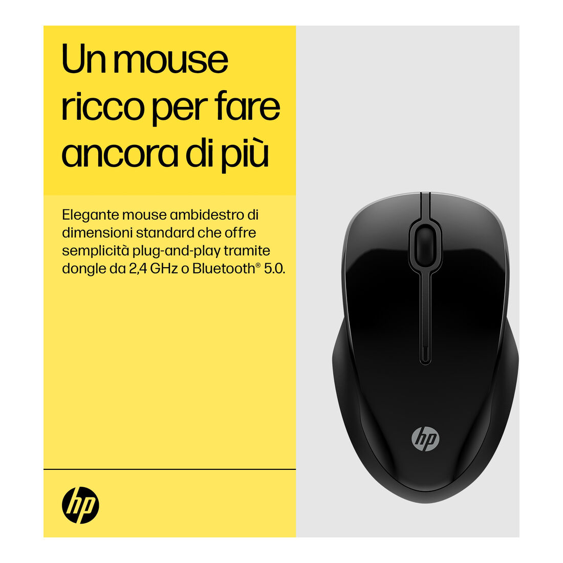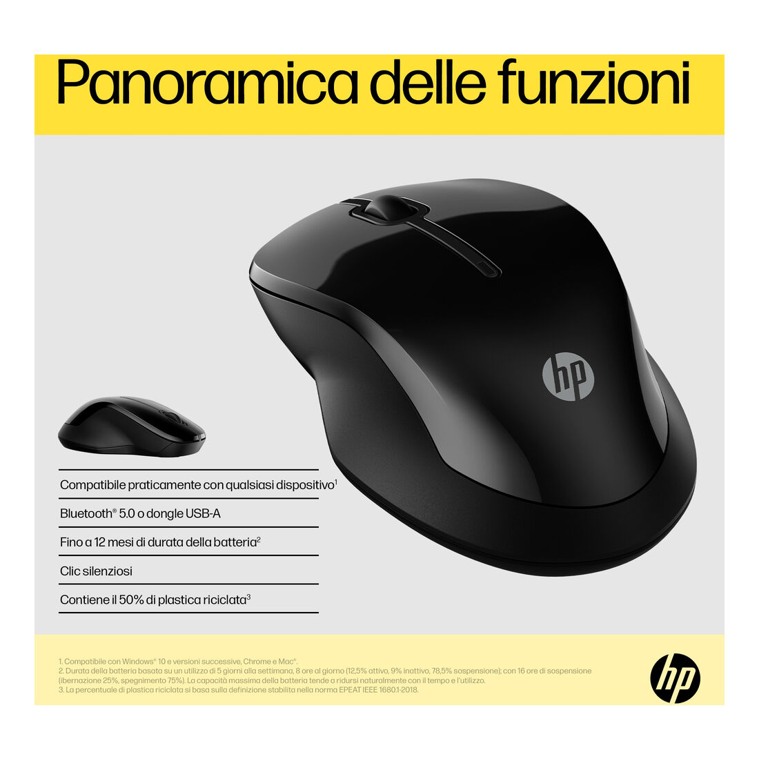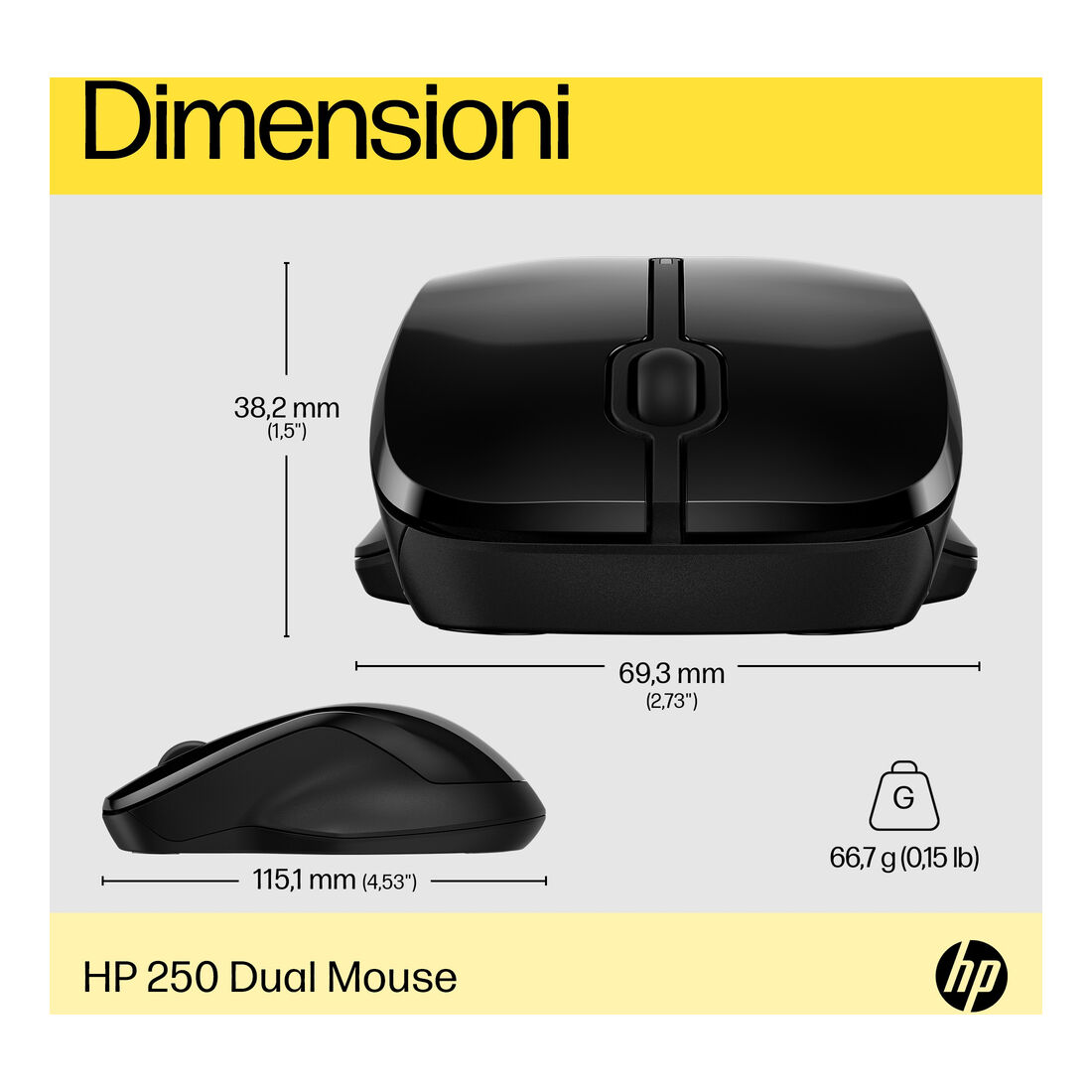 HP 250 Dual Mouse. Fattore di forma: Ambidestro. Interfaccia dispositivo: Bluetooth + USB Type-A, Risoluzione movimento: 1600 DPI, Numero di tasti: 3, Tipo di scorimmento: Rotella. Alimentazione: Batterie. Colore del prodotto: Nero