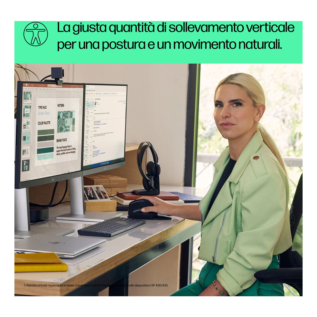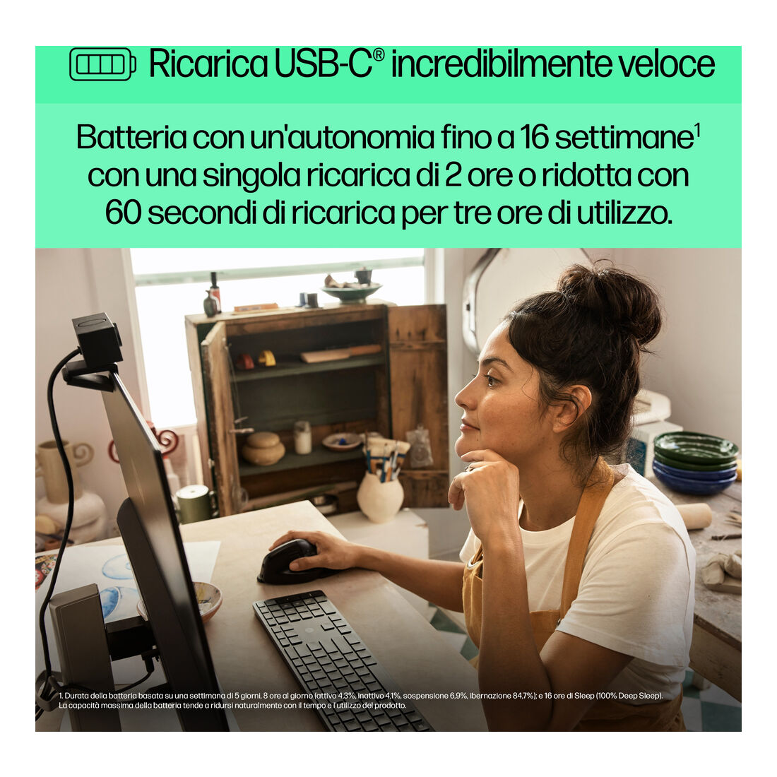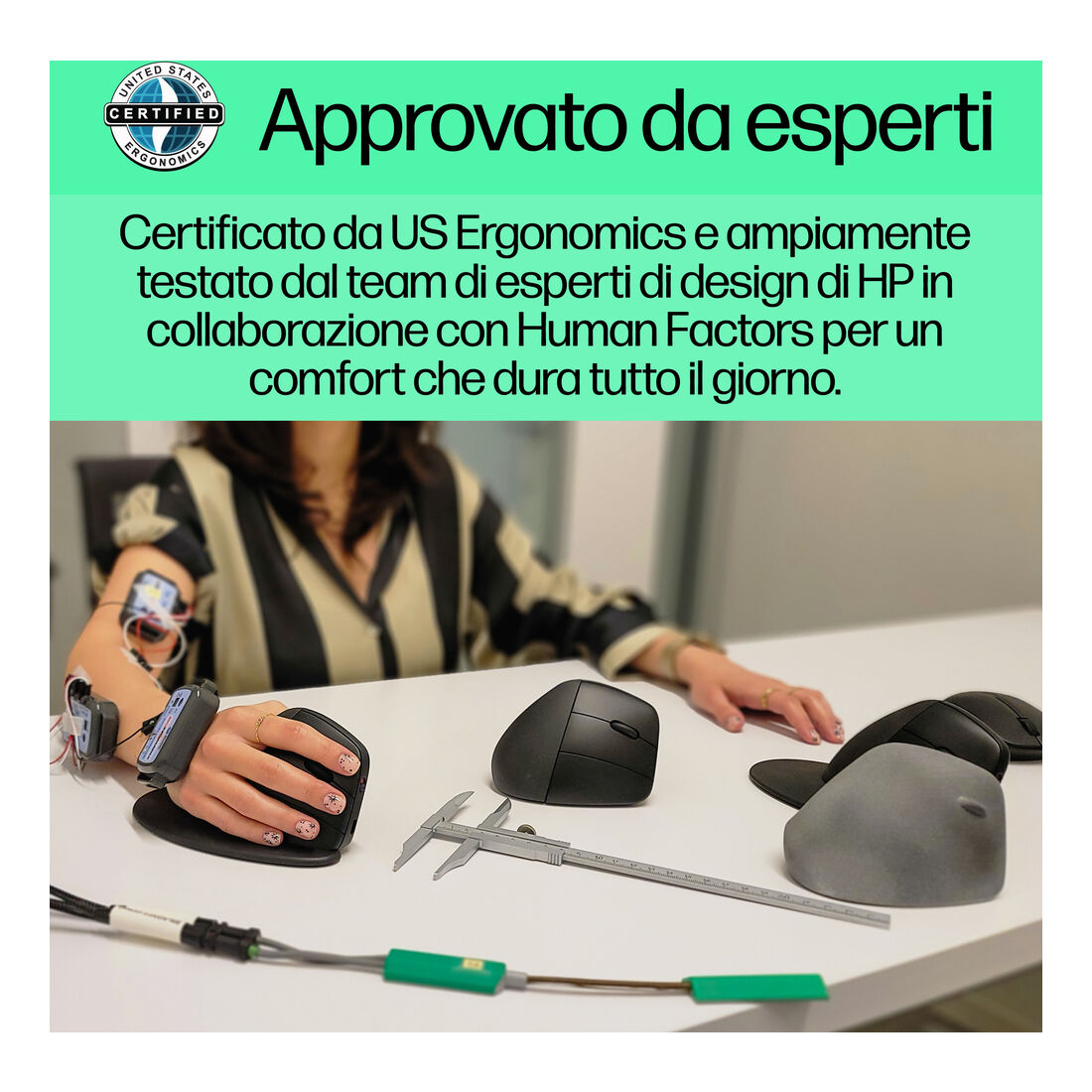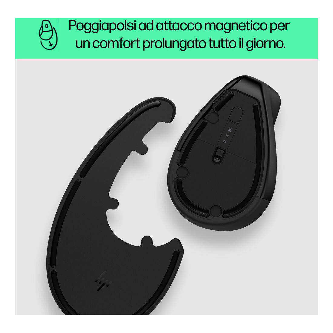HP Mouse wireless ergonomico 920. Fattore di forma: Mano destra, Design verticale. Interfaccia dispositivo: Bluetooth + USB Type-A, Risoluzione movimento: 4000 DPI, Numero di tasti: 5, Tipo di scorimmento: Rotella. Alimentazione: Batterie. Colore del prodotto: Nero