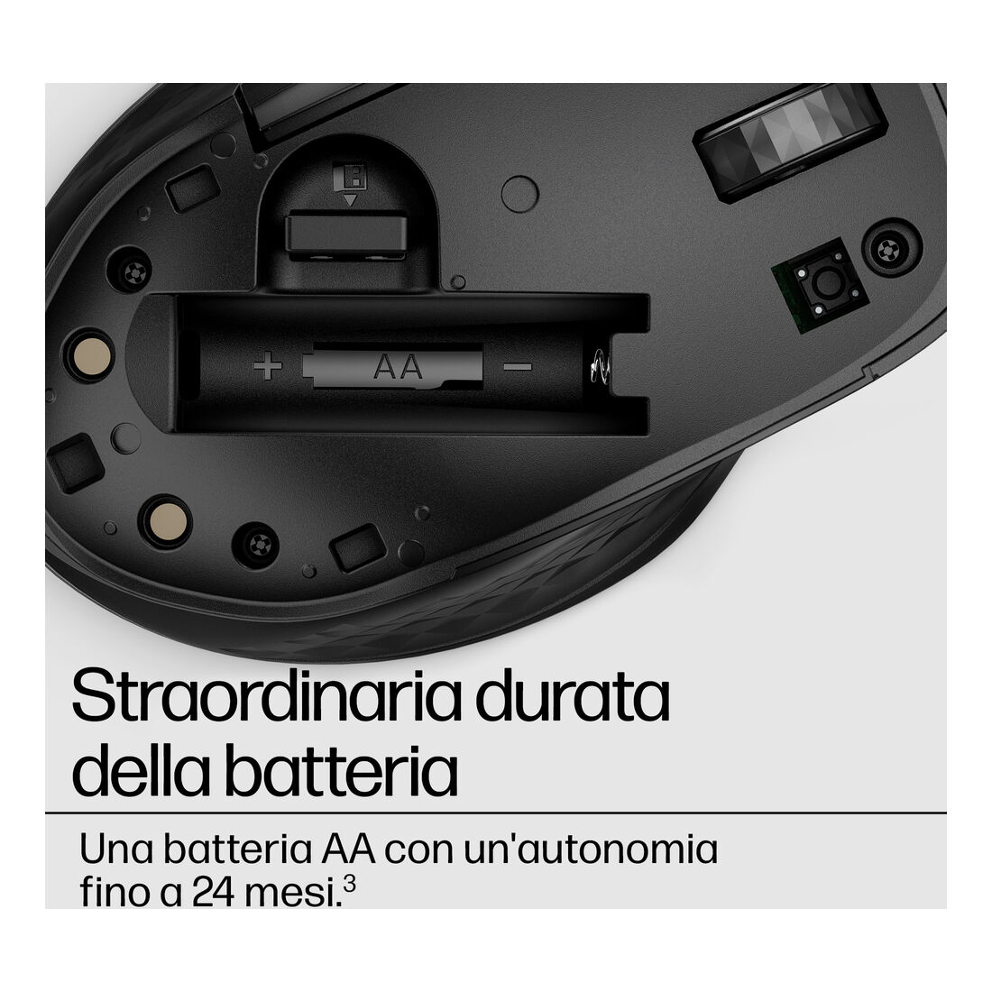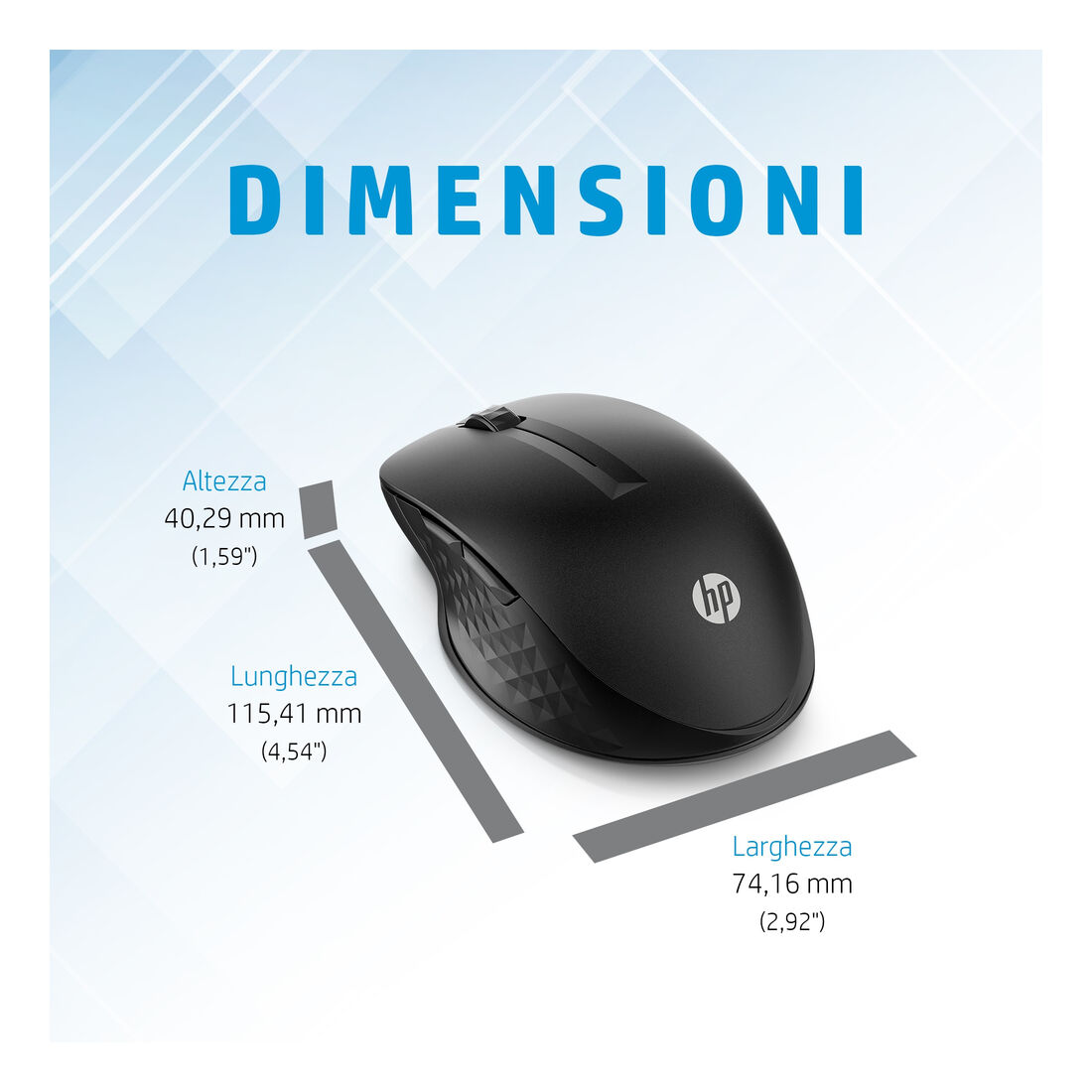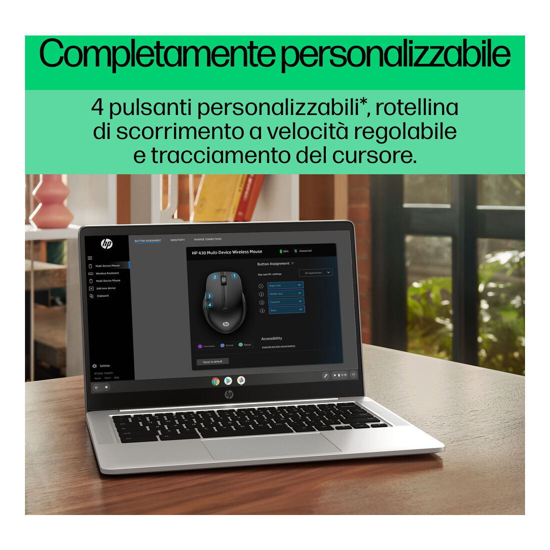 HP Mouse wireless multi-dispositivo 430. Fattore di forma: Ambidestro. Tecnologia di rilevamento del movimento: Ottico, Interfaccia dispositivo: RF senza fili + Bluetooth, Risoluzione movimento: 1200 DPI, Tipo di pulsanti: Tasti premuti, Numero di tasti: 5, Tipo di scorimmento: Rotella. Alimentazione: Batterie. Colore del prodotto: Nero