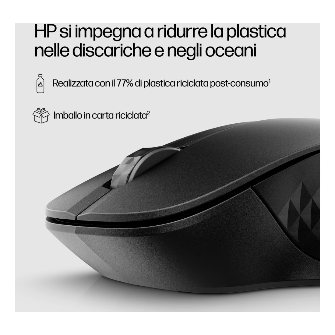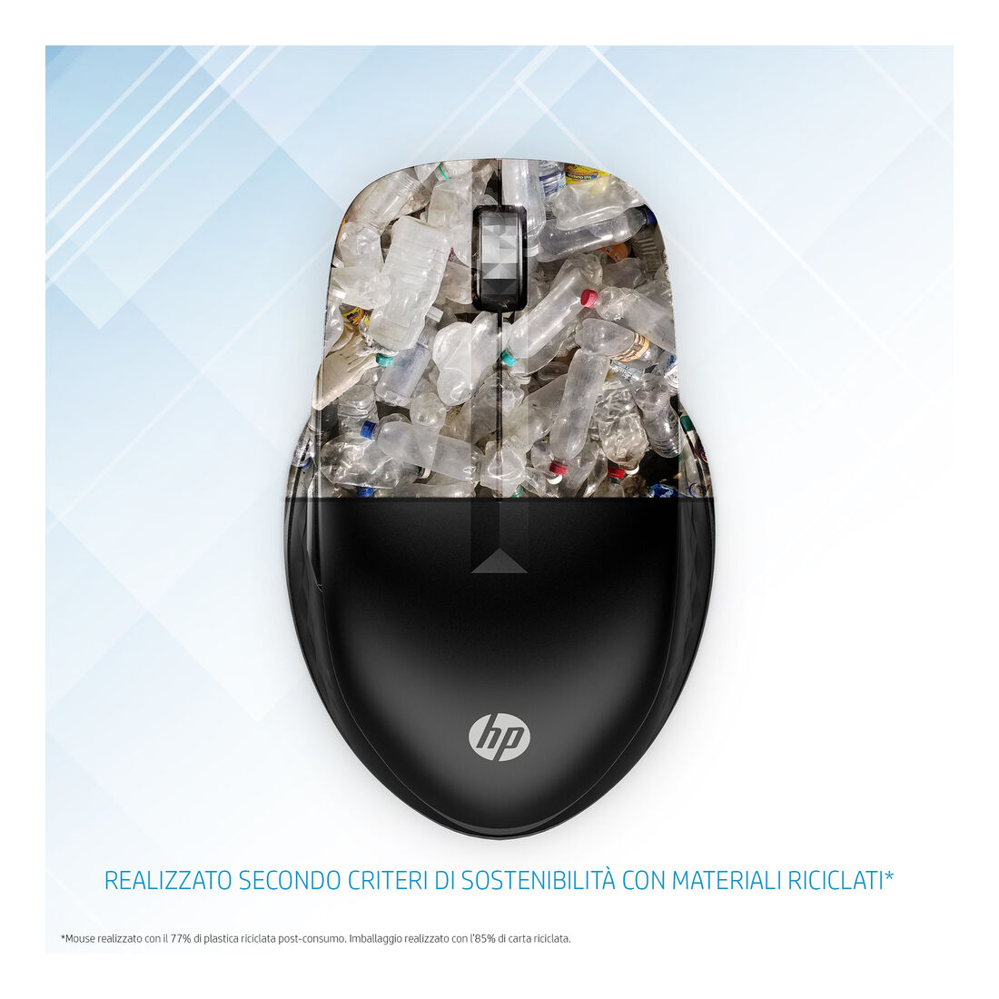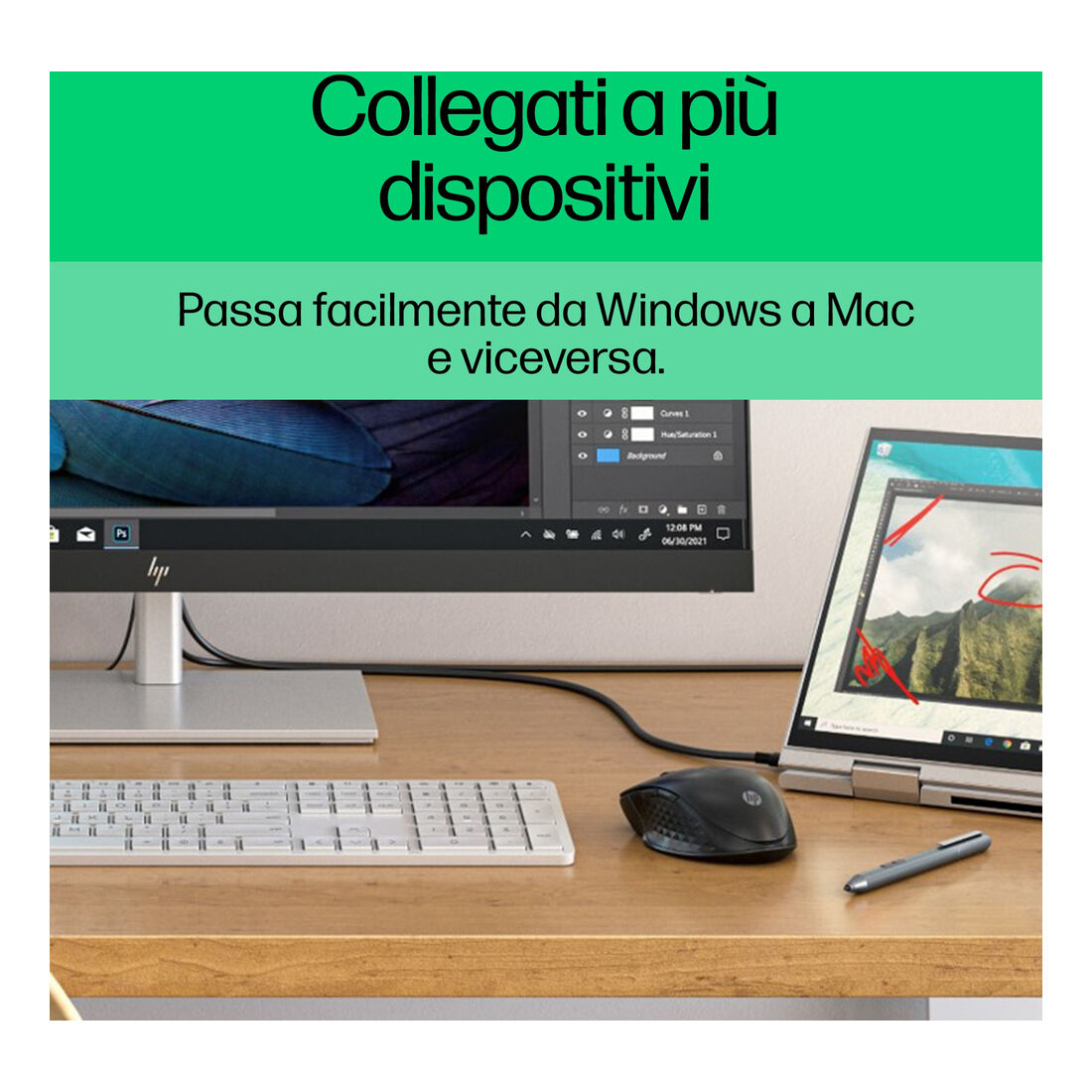 HP Mouse wireless multi-dispositivo 430. Fattore di forma: Ambidestro. Tecnologia di rilevamento del movimento: Ottico, Interfaccia dispositivo: RF senza fili + Bluetooth, Risoluzione movimento: 1200 DPI, Tipo di pulsanti: Tasti premuti, Numero di tasti: 5, Tipo di scorimmento: Rotella. Alimentazione: Batterie. Colore del prodotto: Nero