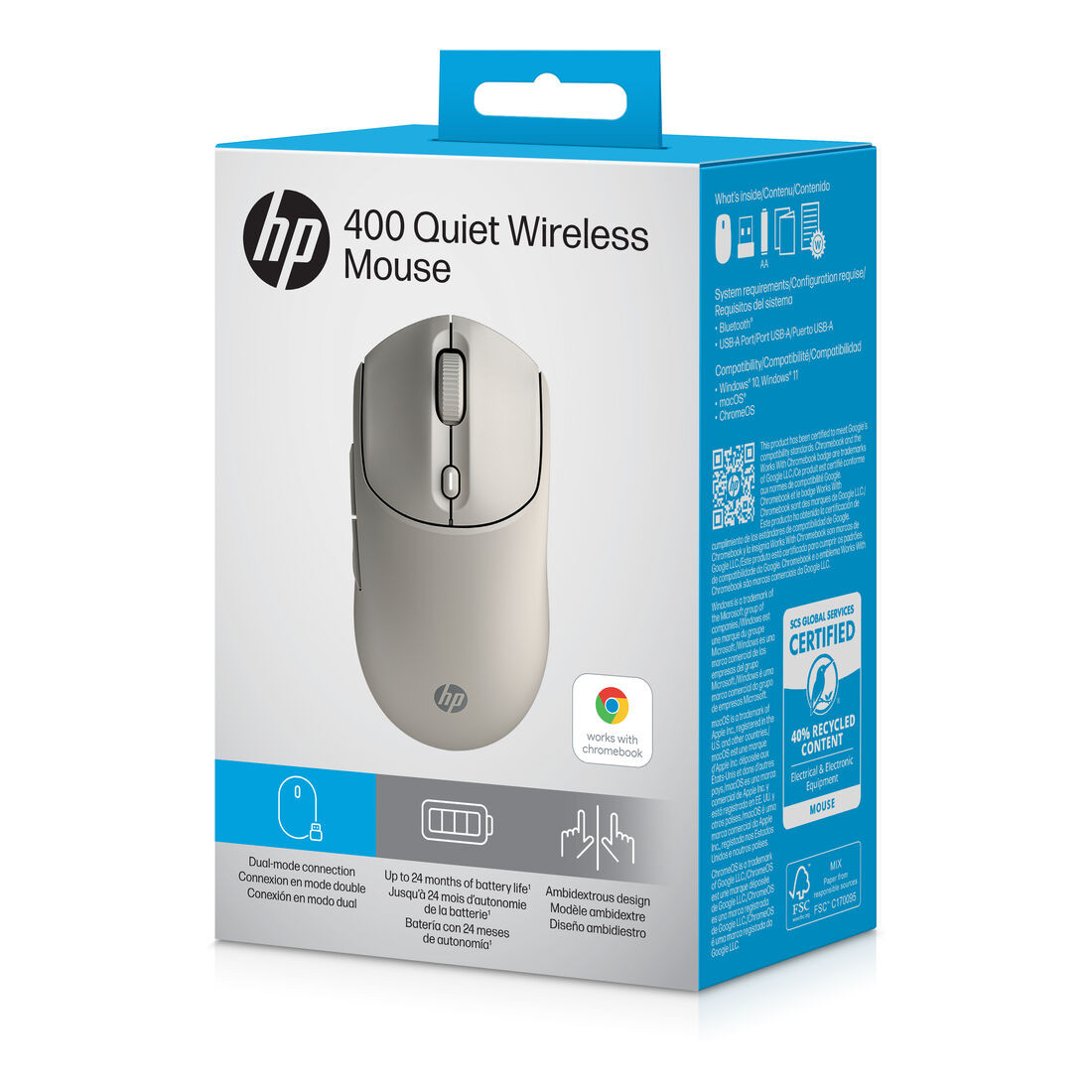 HP Mouse wireless silenzioso 400. Fattore di forma: Ambidestro. Interfaccia dispositivo: RF senza fili + Bluetooth, Risoluzione movimento: 6000 DPI, Numero di tasti: 5, Tipo di scorimmento: Rotella. Alimentazione: Batterie. Funziona su tutte le superfici. Colore del prodotto: Beige