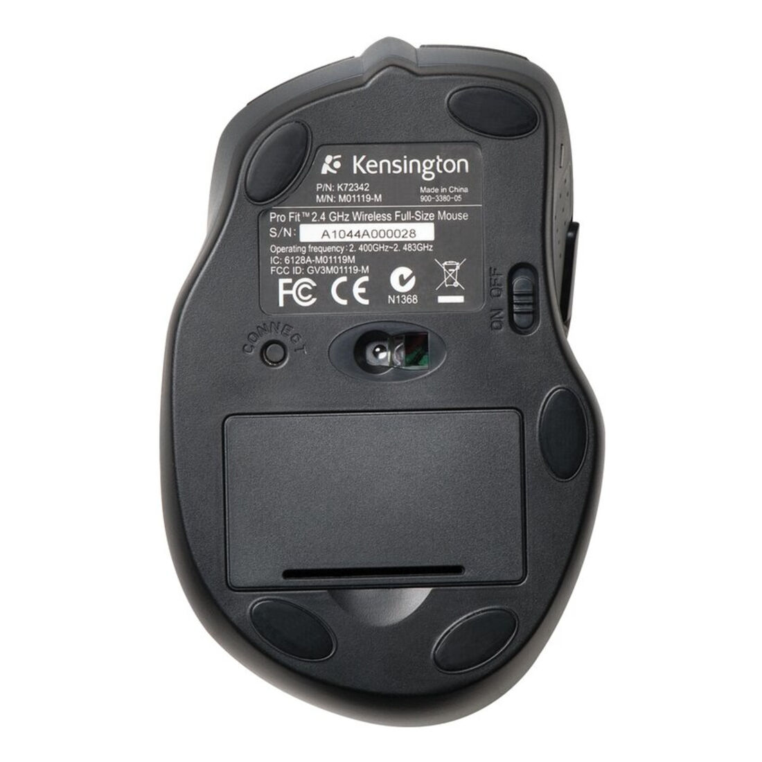 Kensington Mouse Pro Fit™ wireless di dimensioni standard. Fattore di forma: Ambidestro. Tecnologia di rilevamento del movimento: Ottico, Interfaccia dispositivo: RF Wireless, Risoluzione movimento: 1600 DPI, Tipo di pulsanti: Tasti premuti, Numero di tasti: 6, Tipo di scorimmento: Rotella. Alimentazione: Batterie. Colore del prodotto: Nero