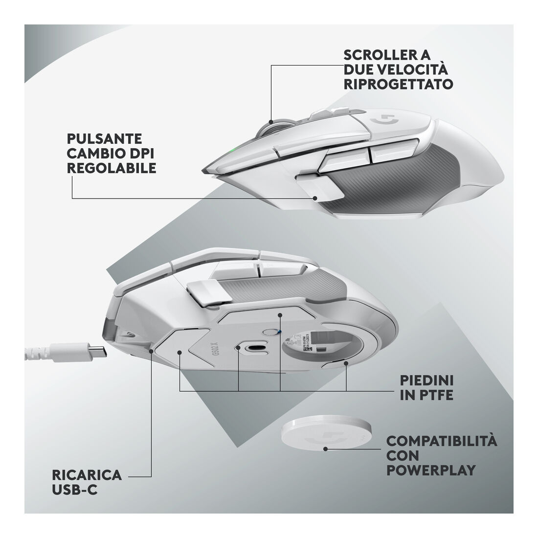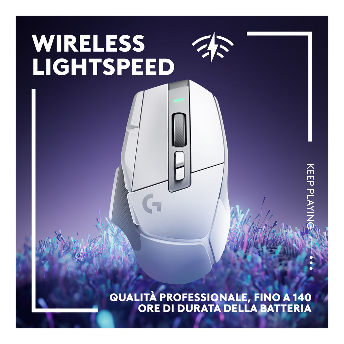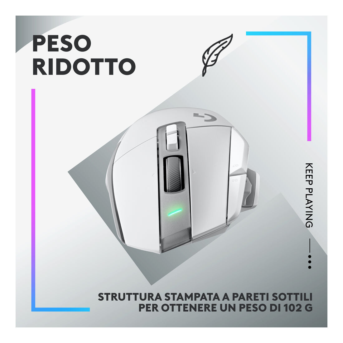 Logitech G G502 X LIGHTSPEED. Fattore di forma: Mano destra. Tecnologia di rilevamento del movimento: Ottico, Interfaccia dispositivo: RF Wireless, Risoluzione movimento: 25600 DPI, Tipo di pulsanti: Tasti premuti, Numero di tasti: 13, Tipo di scorimmento: Rotella, Accelerazione (max): 40 G. Alimentazione: Batterie. Colore del prodotto: Bianco