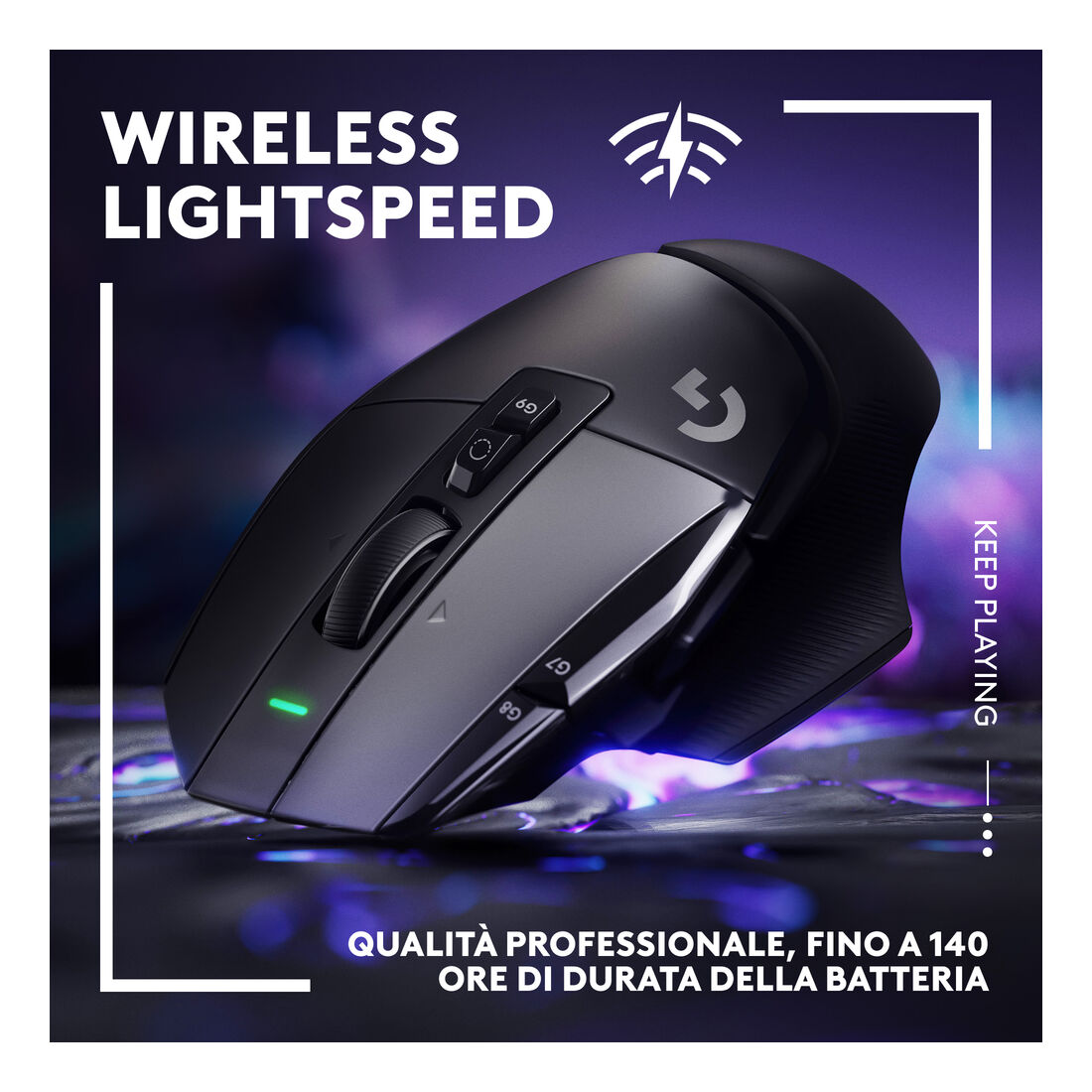 Logitech G G502 X LIGHTSPEED. Fattore di forma: Mano destra. Tecnologia di rilevamento del movimento: Ottico, Interfaccia dispositivo: RF Wireless, Risoluzione movimento: 25600 DPI, Tipo di pulsanti: Tasti premuti, Numero di tasti: 13, Tipo di scorimmento: Rotella, Accelerazione (max): 40 G. Alimentazione: Batterie. Colore del prodotto: Nero
