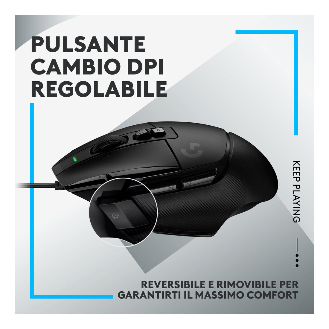Logitech G G502 X. Fattore di forma: Mano destra. Tecnologia di rilevamento del movimento: Ottico, Interfaccia dispositivo: USB tipo A, Risoluzione movimento: 25600 DPI, Tipo di pulsanti: Tasti premuti, Numero di tasti: 13, Tipo di scorimmento: Rotella, Accelerazione (max): 40 G. Alimentazione: Cavo. Colore del prodotto: Nero