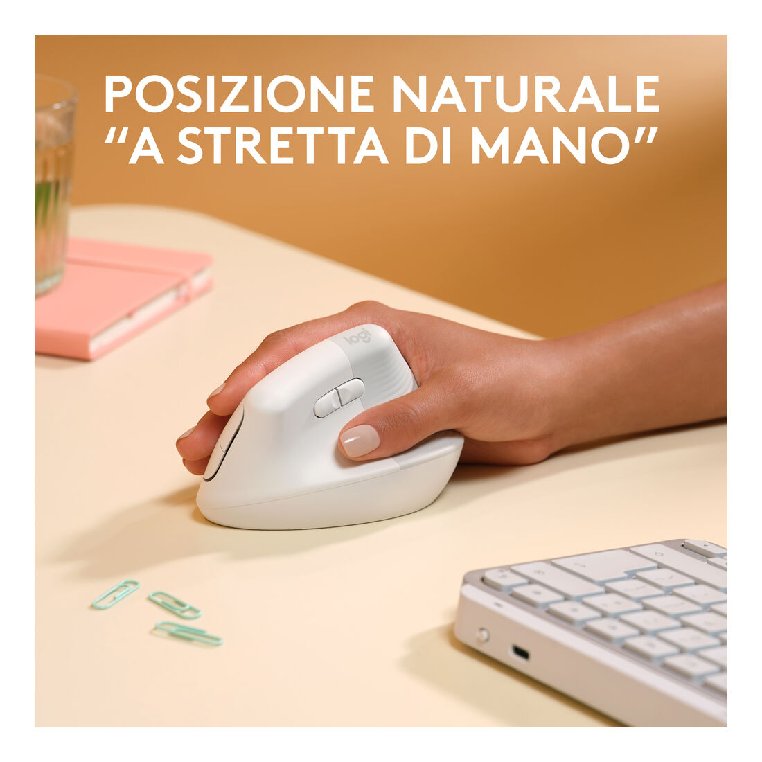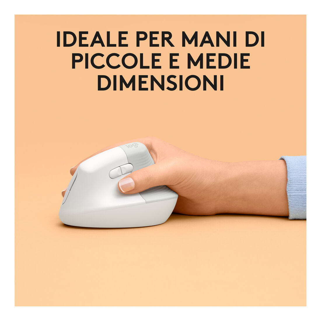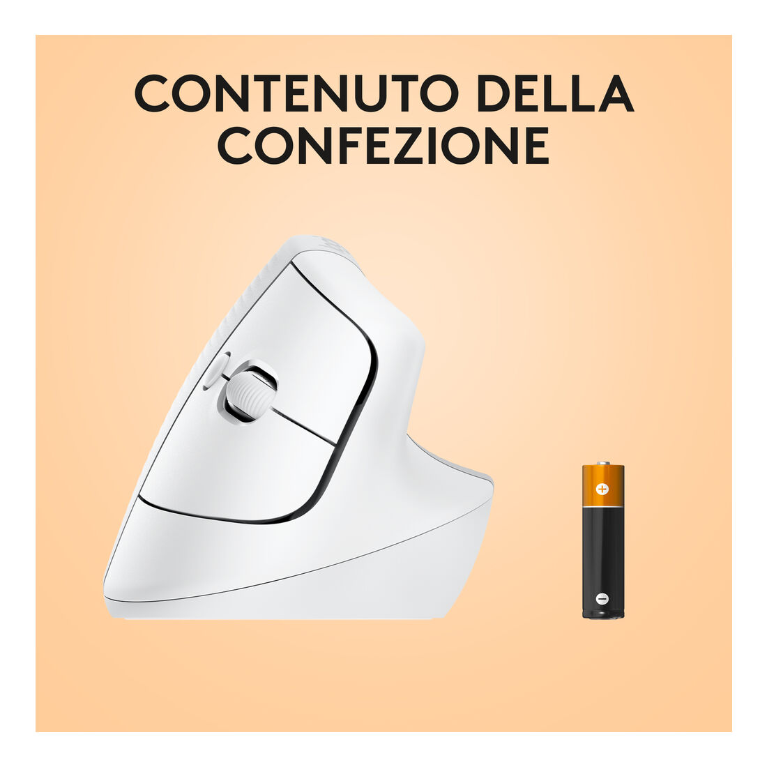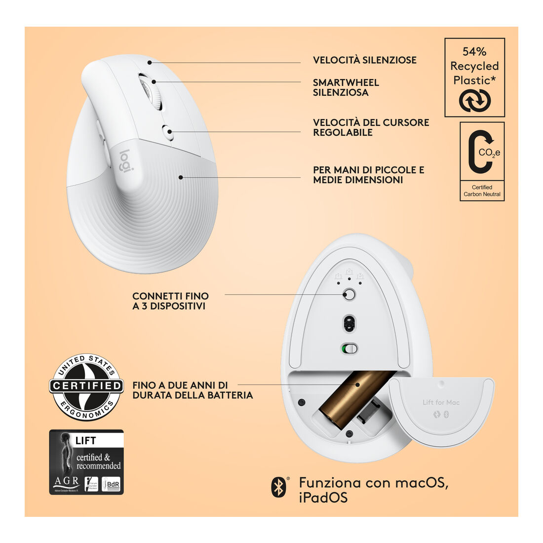 Logitech Lift for Mac. Fattore di forma: Mano destra, Design verticale. Tecnologia di rilevamento del movimento: Ottico, Interfaccia dispositivo: RF senza fili + Bluetooth, Risoluzione movimento: 4000 DPI, Tipo di pulsanti: Tasti premuti, Numero di tasti: 6, Tipo di scorimmento: Rotella. Alimentazione: Batterie. Colore del prodotto: Bianco