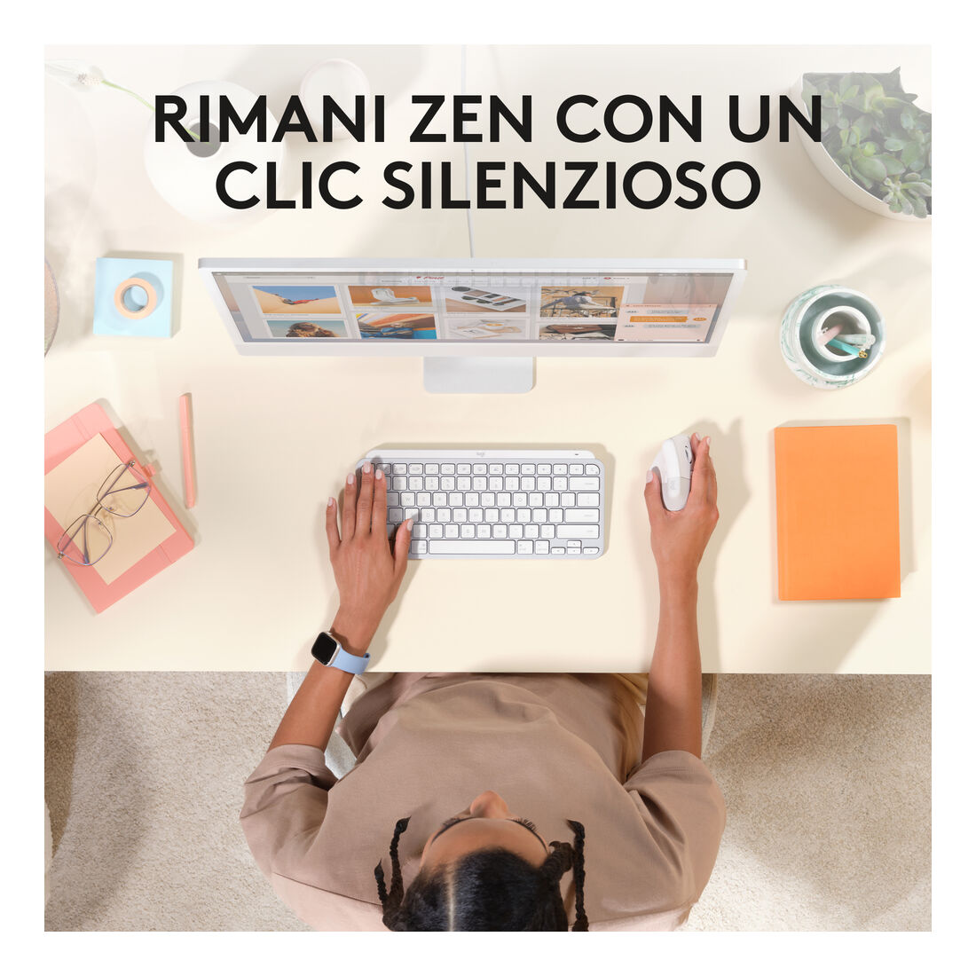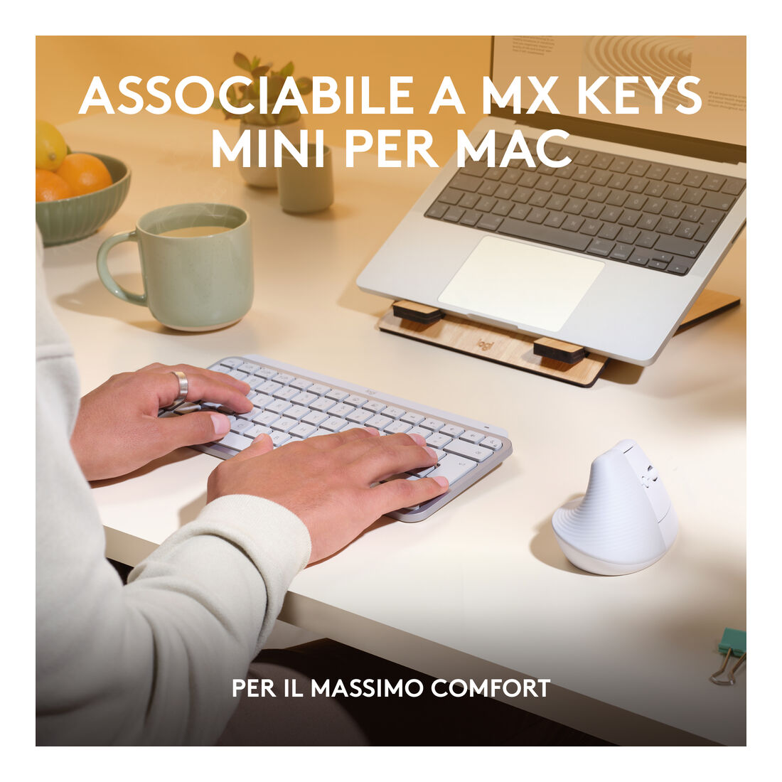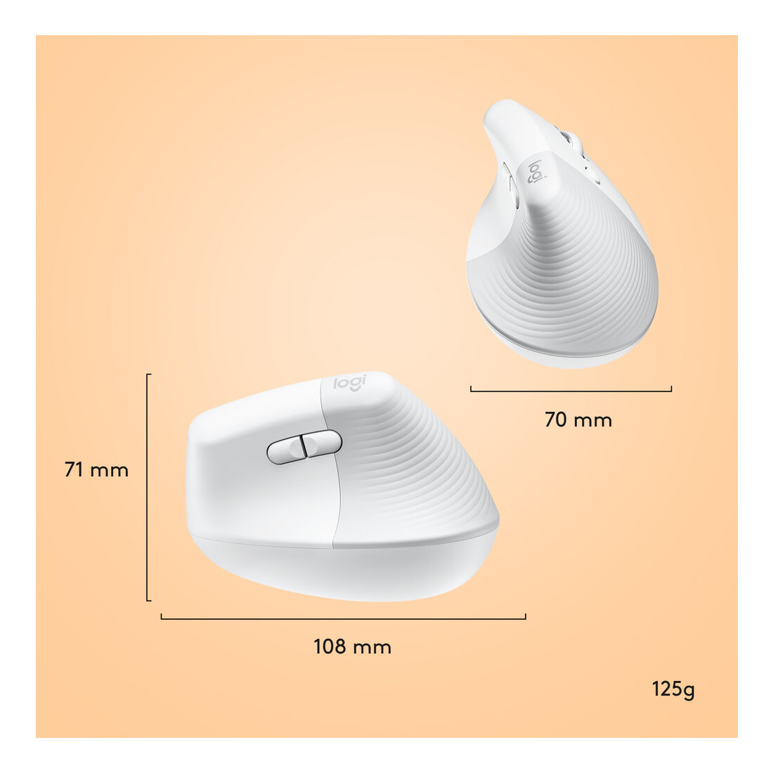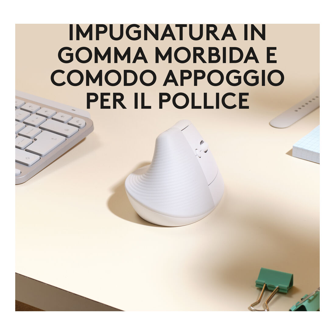 Logitech Lift for Mac. Fattore di forma: Mano destra, Design verticale. Tecnologia di rilevamento del movimento: Ottico, Interfaccia dispositivo: RF senza fili + Bluetooth, Risoluzione movimento: 4000 DPI, Tipo di pulsanti: Tasti premuti, Numero di tasti: 6, Tipo di scorimmento: Rotella. Alimentazione: Batterie. Colore del prodotto: Bianco