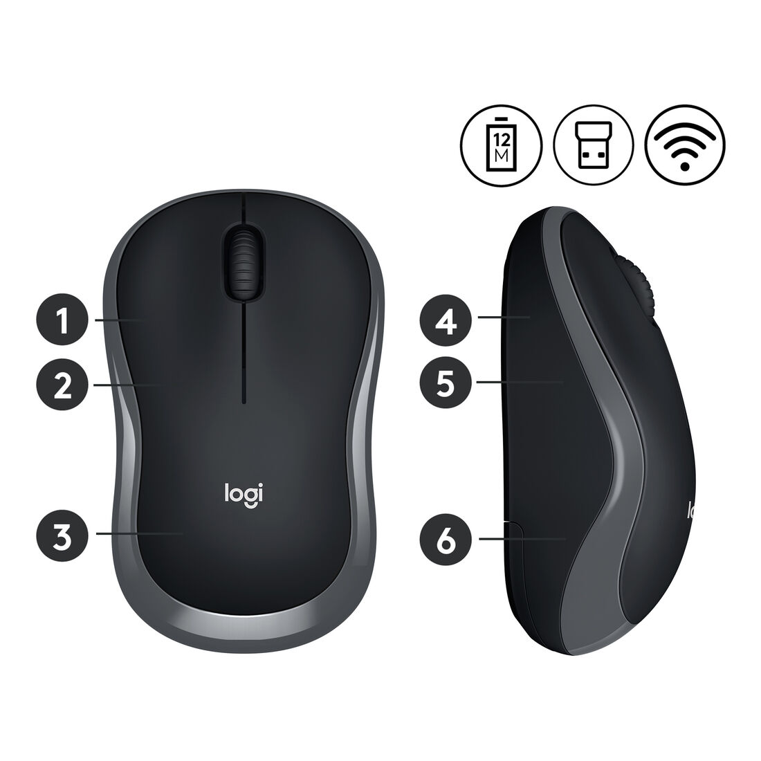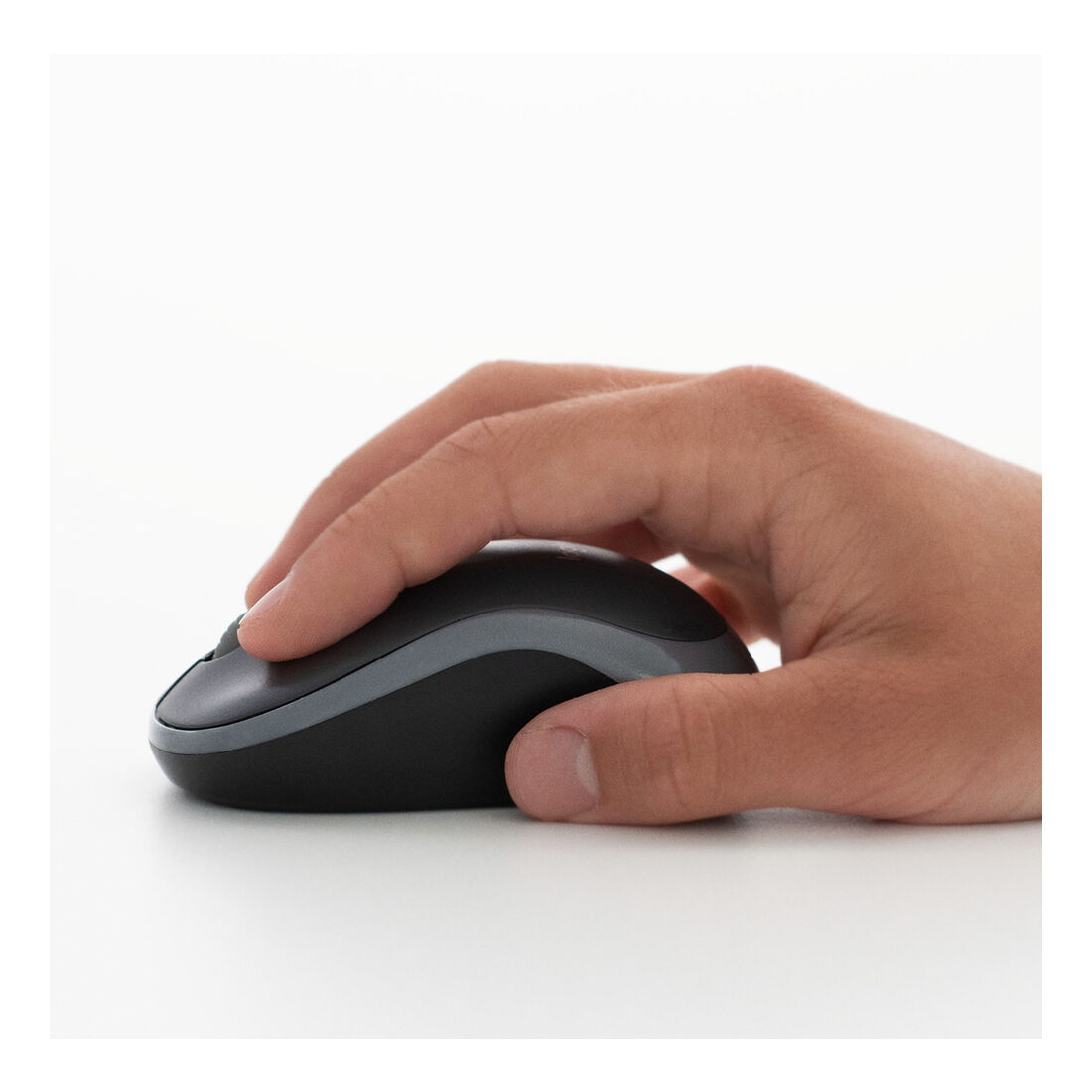 Logitech M185. Fattore di forma: Ambidestro. Tecnologia di rilevamento del movimento: Ottico, Interfaccia dispositivo: RF Wireless, Risoluzione movimento: 1000 DPI, Tipo di pulsanti: Tasti premuti, Numero di tasti: 2, Tipo di scorimmento: Rotella. Alimentazione: Batterie. Colore del prodotto: Grigio