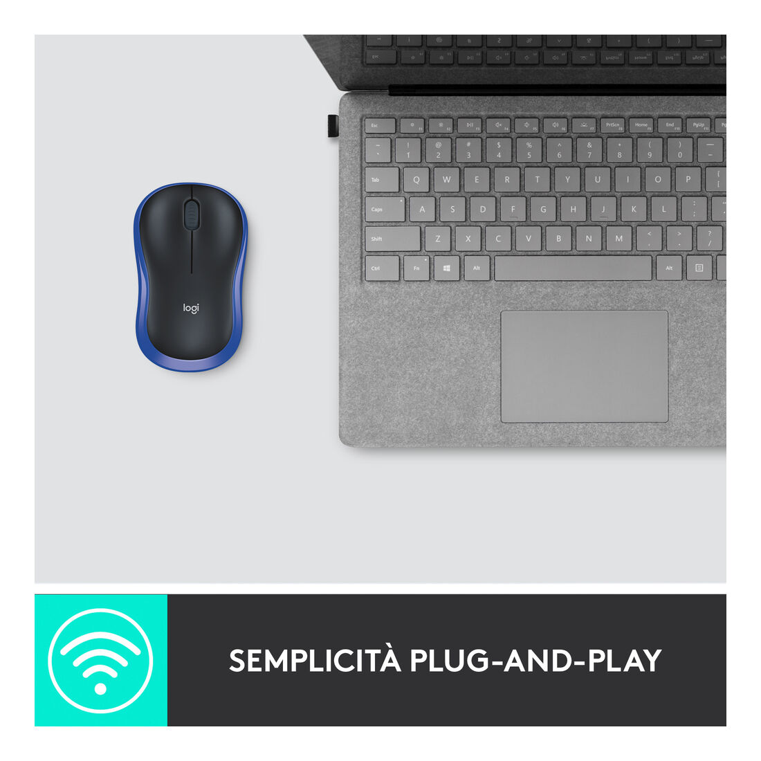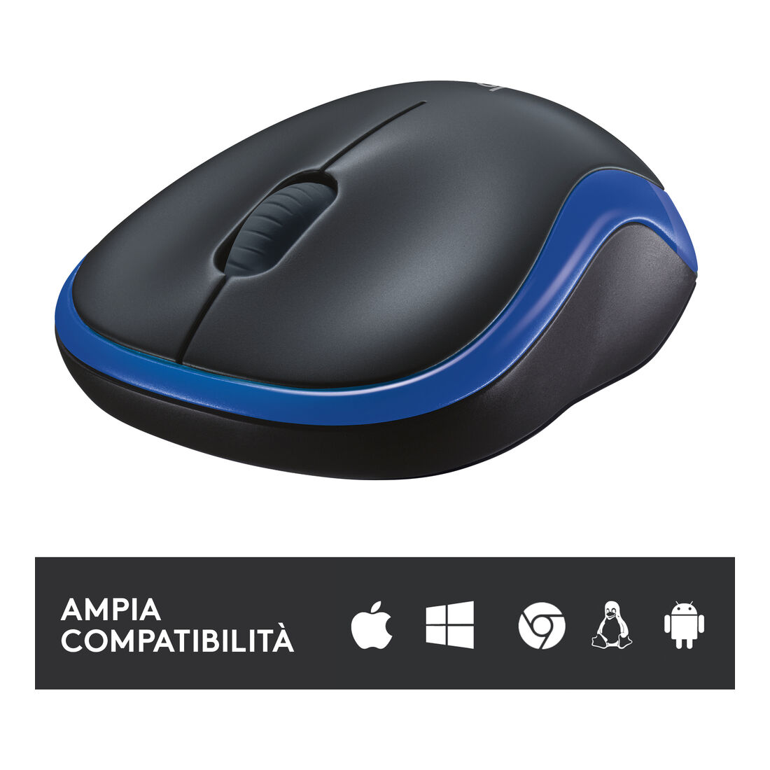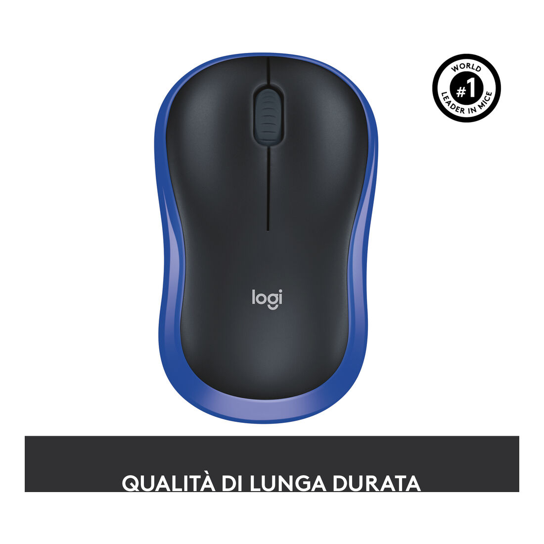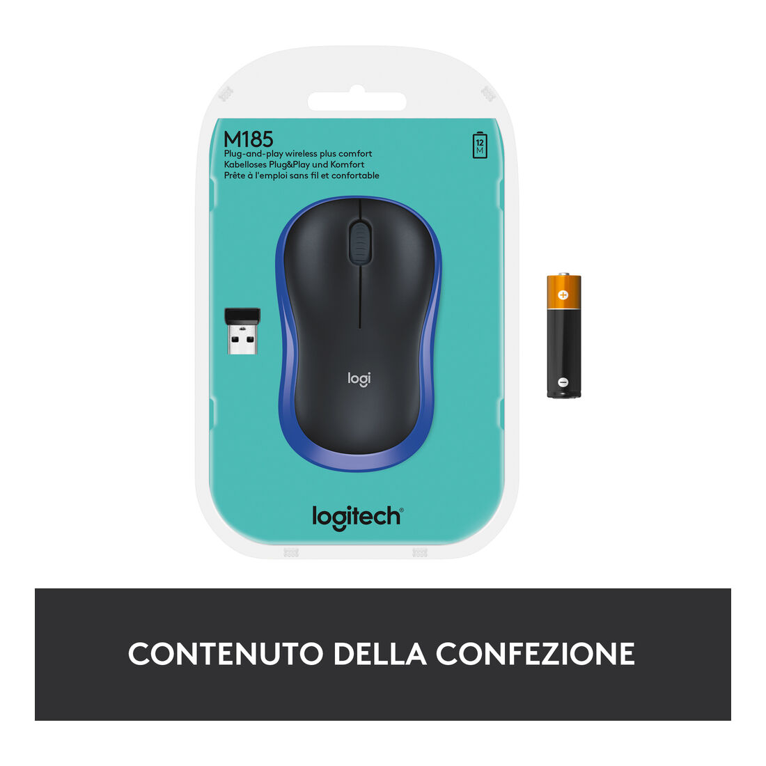 Logitech M185. Fattore di forma: Ambidestro. Tecnologia di rilevamento del movimento: Ottico, Interfaccia dispositivo: RF Wireless, Risoluzione movimento: 1000 DPI, Tipo di pulsanti: Tasti premuti, Numero di tasti: 3, Tipo di scorimmento: Rotella. Alimentazione: Batterie. Colore del prodotto: Blu
