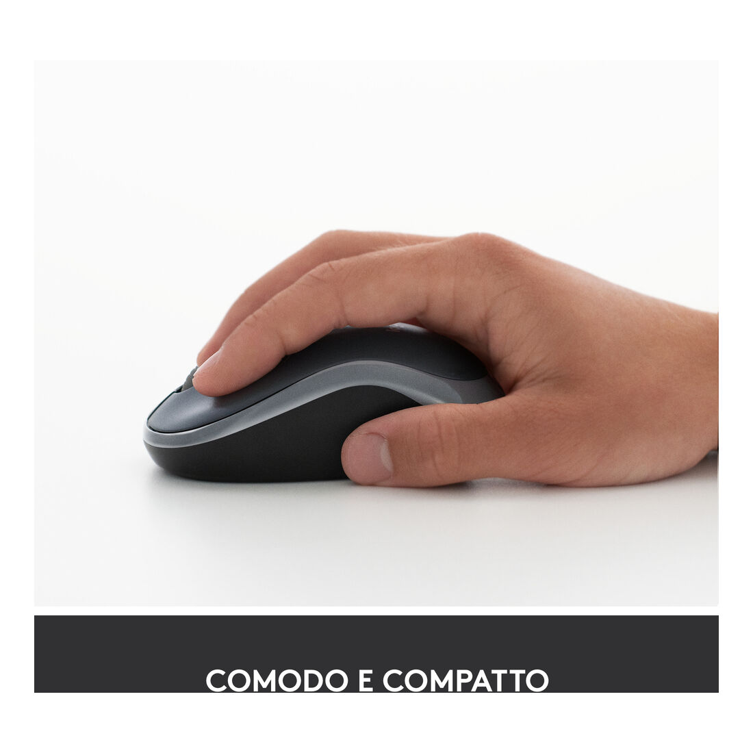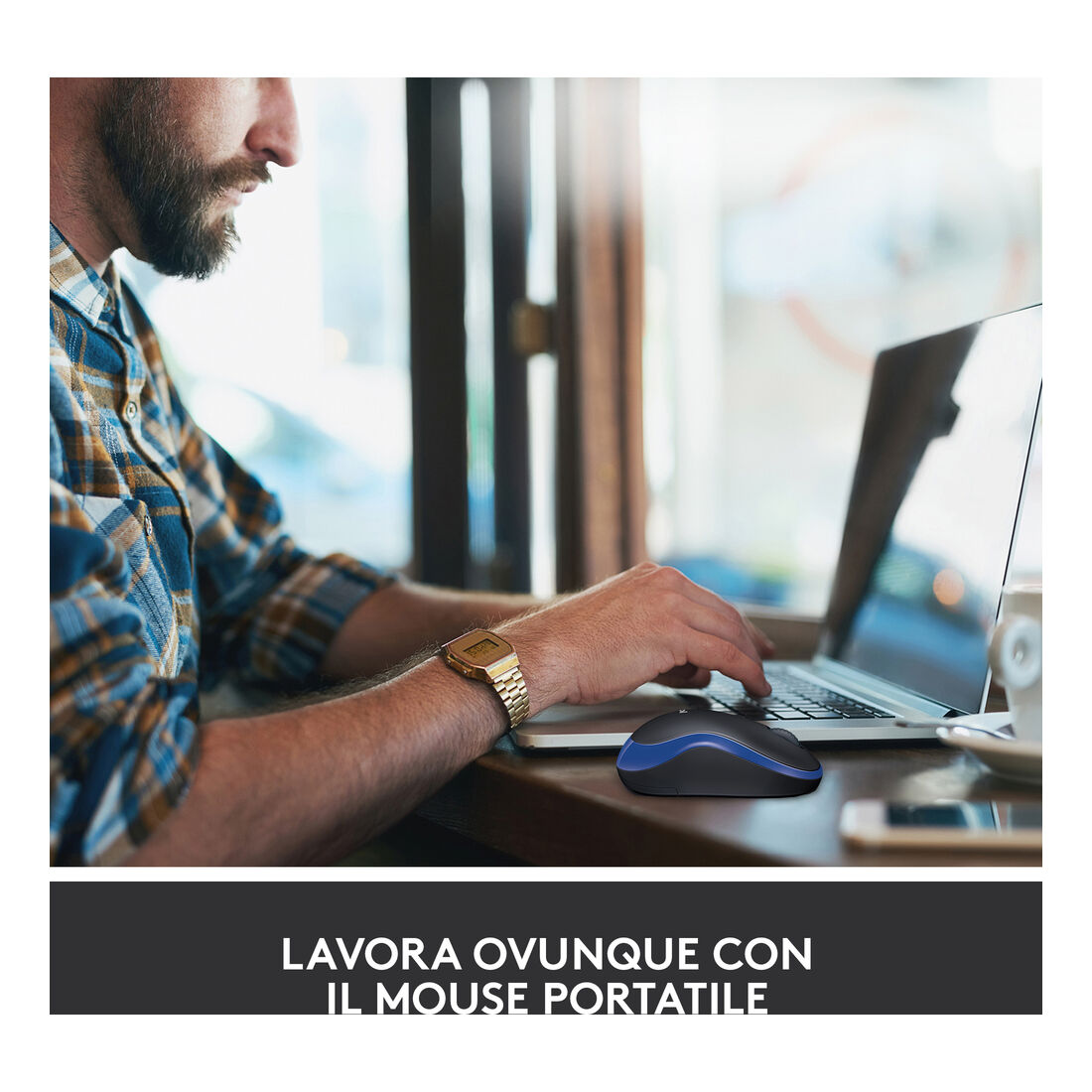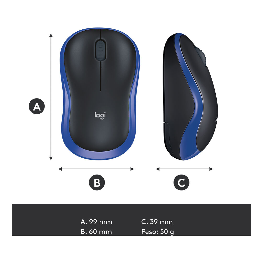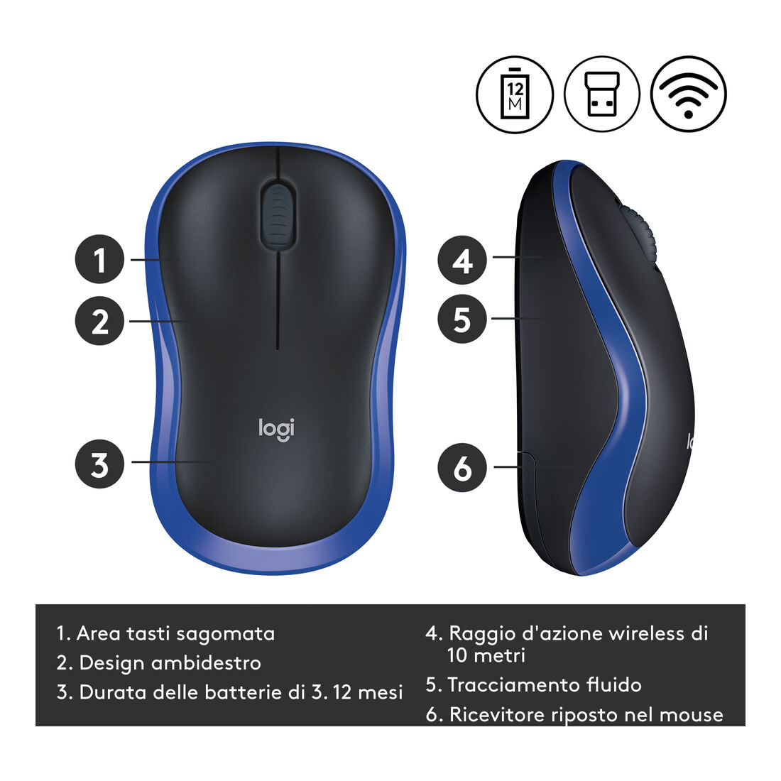 Logitech M185. Fattore di forma: Ambidestro. Tecnologia di rilevamento del movimento: Ottico, Interfaccia dispositivo: RF Wireless, Risoluzione movimento: 1000 DPI, Tipo di pulsanti: Tasti premuti, Numero di tasti: 3, Tipo di scorimmento: Rotella. Alimentazione: Batterie. Colore del prodotto: Blu