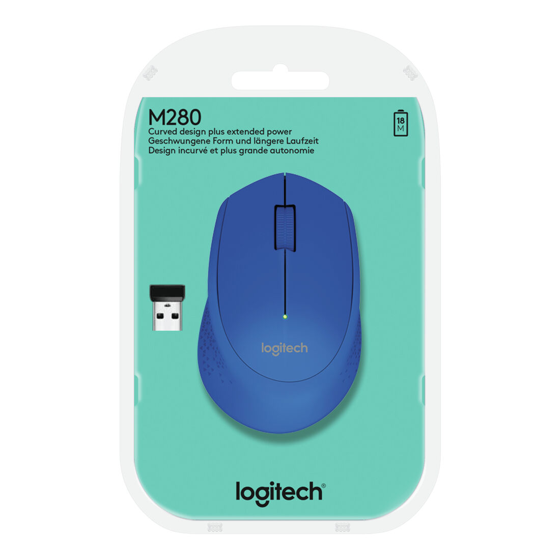 Logitech M280. Fattore di forma: Ambidestro. Tecnologia di rilevamento del movimento: Ottico, Interfaccia dispositivo: RF Wireless, Risoluzione movimento: 1000 DPI, Tipo di pulsanti: Tasti premuti, Numero di tasti: 3, Tipo di scorimmento: Rotella. Alimentazione: Batterie. Colore del prodotto: Blu