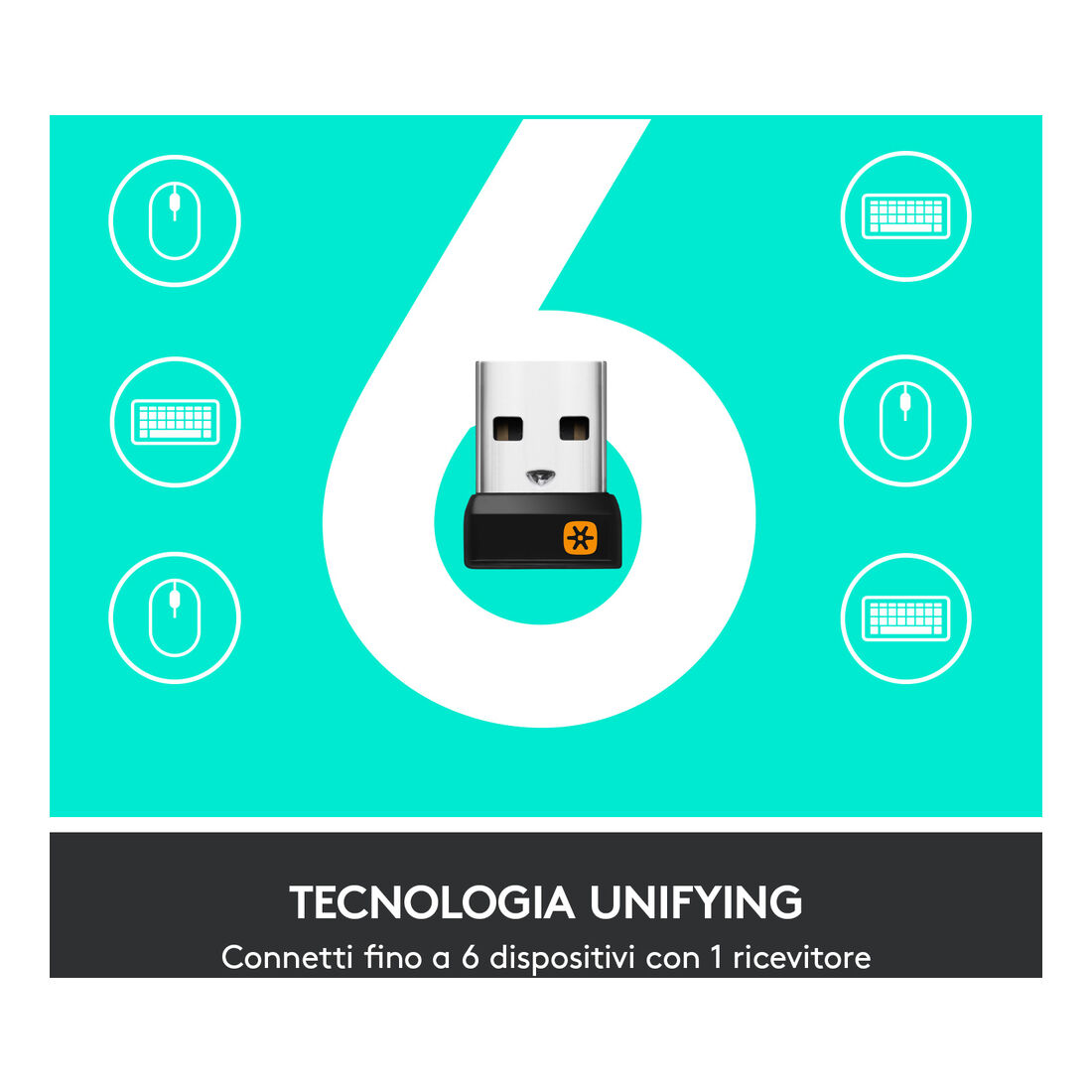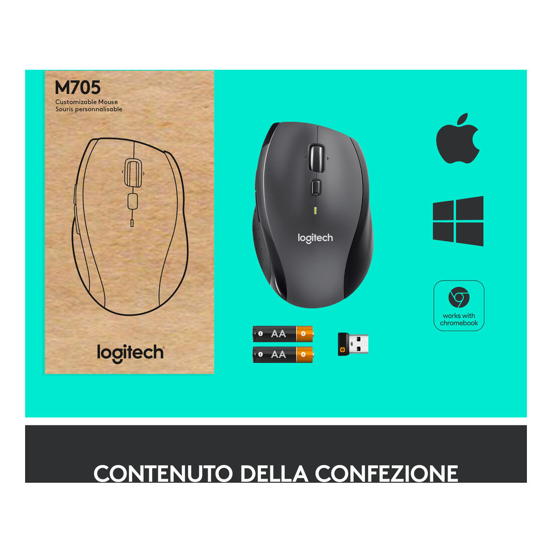 Logitech M705 Marathon Mouse Wireless, Ricevitore USB Unifying 2,4 GHz, 1000 DPI, 5 Pulsanti Programmabili, Durata Batteria di 3 Anni, Compatibile con PC, Mac, Laptop, Chromebook. Fattore di forma: Mano destra. Tecnologia di rilevamento del movimento: Ottico, Interfaccia dispositivo: RF Wireless, Risoluzione movimento: 1000 DPI, Tipo di pulsanti: Tasti premuti, Numero di tasti: 7, Tipo di scorimmento: Rotella. Alimentazione: Batterie. Colore del prodotto: Antracite