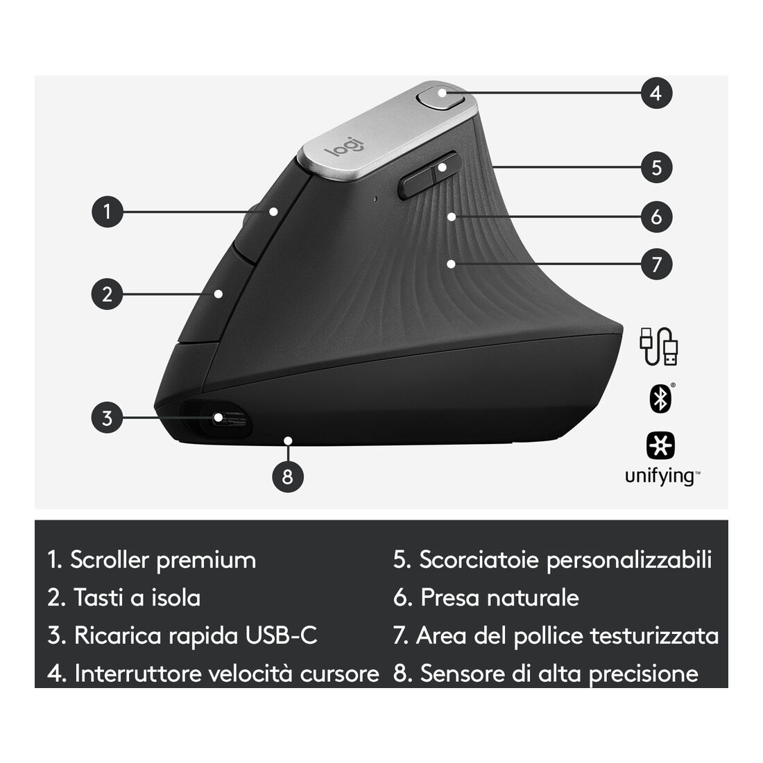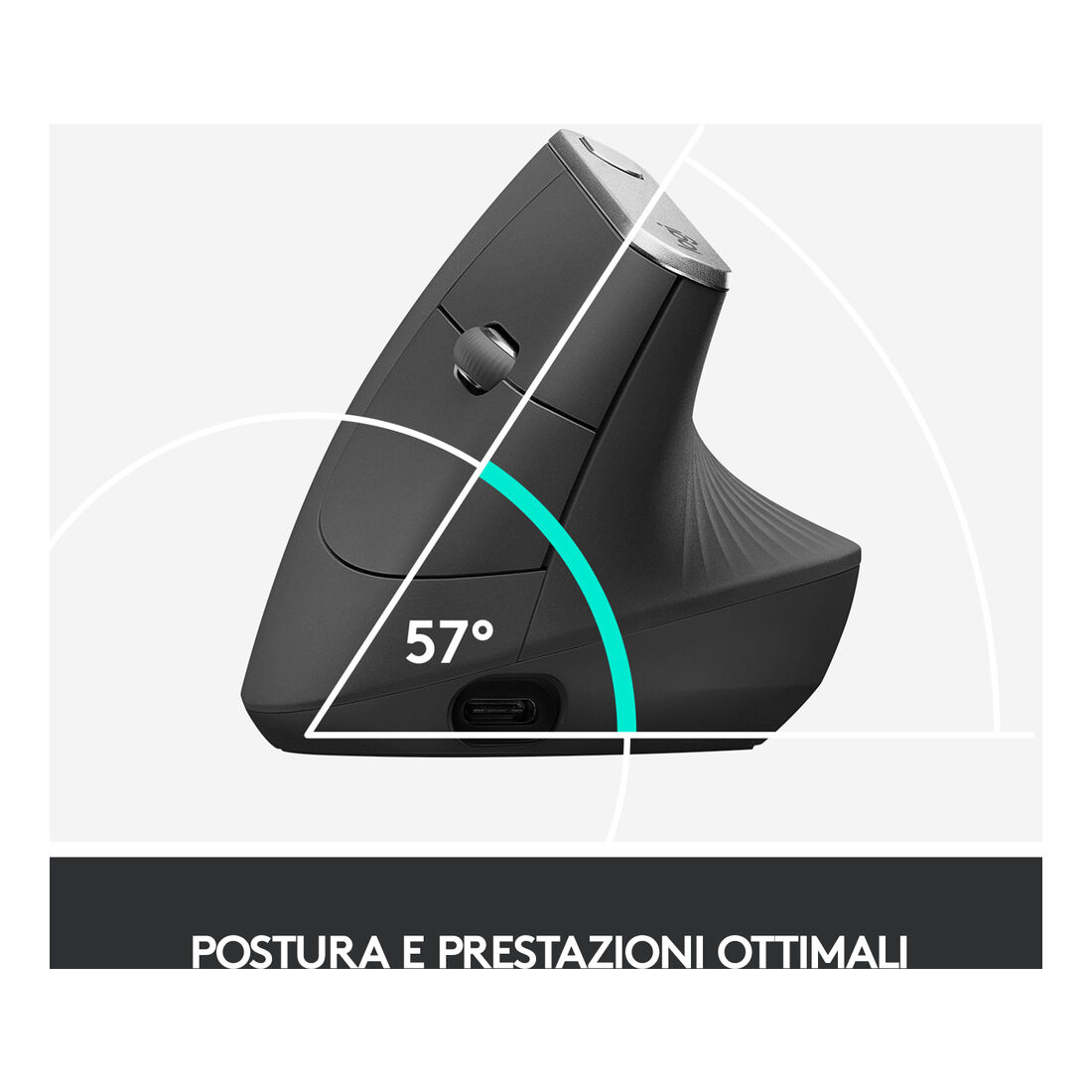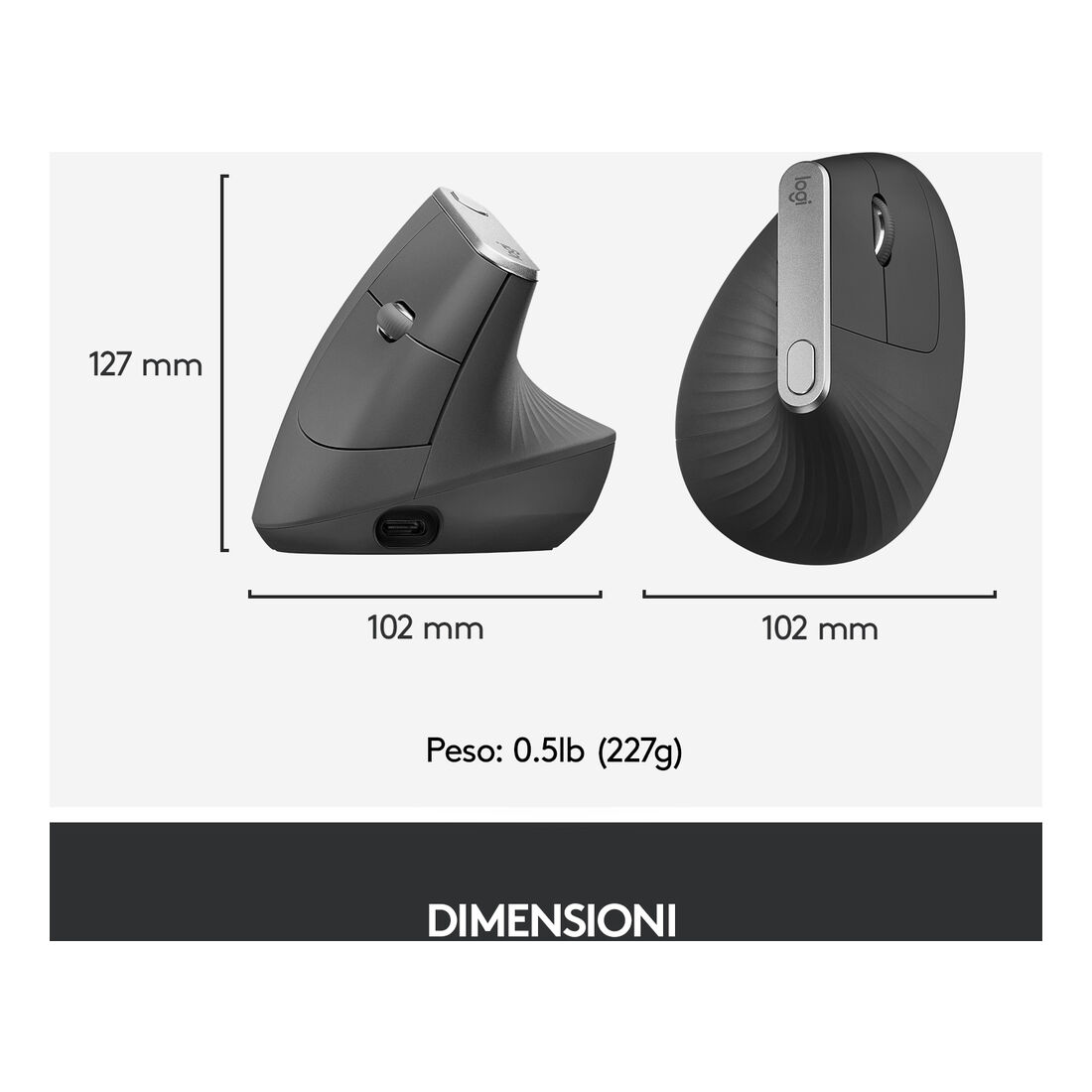 Logitech MX Vertical. Fattore di forma: Mano destra. Tecnologia di rilevamento del movimento: Ottico, Interfaccia dispositivo: RF senza fili + Bluetooth, Risoluzione movimento: 4000 DPI, Tipo di pulsanti: Tasti premuti, Tipo di scorimmento: Rotella. Alimentazione: Batterie. Colore del prodotto: Grafite