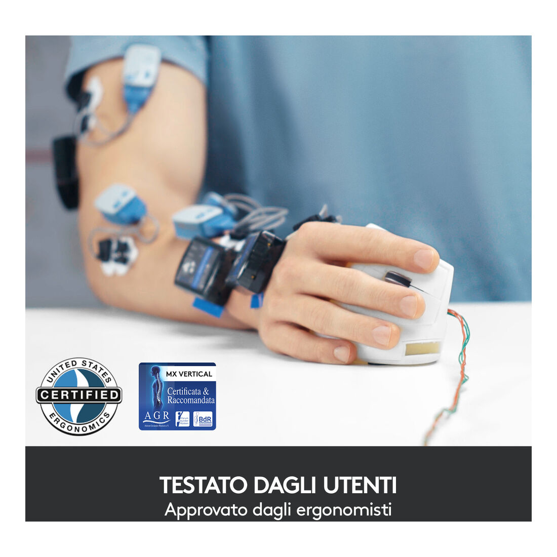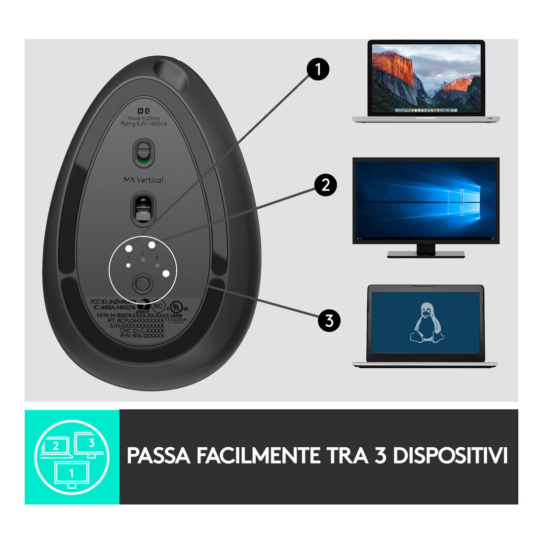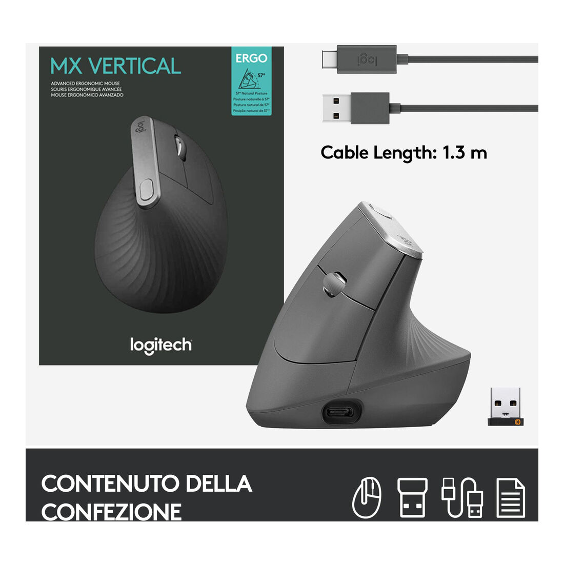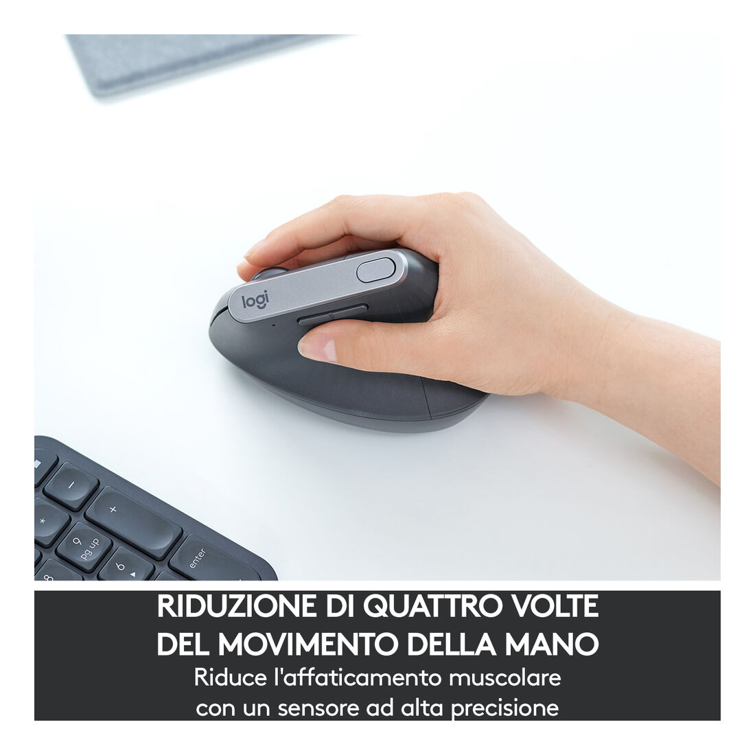 Logitech MX Vertical. Fattore di forma: Mano destra. Tecnologia di rilevamento del movimento: Ottico, Interfaccia dispositivo: RF senza fili + Bluetooth, Risoluzione movimento: 4000 DPI, Tipo di pulsanti: Tasti premuti, Tipo di scorimmento: Rotella. Alimentazione: Batterie. Colore del prodotto: Grafite