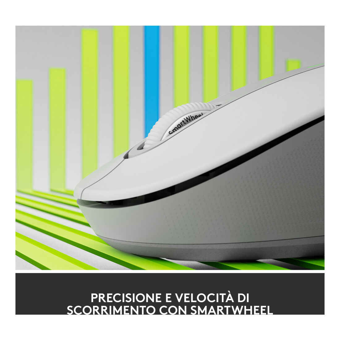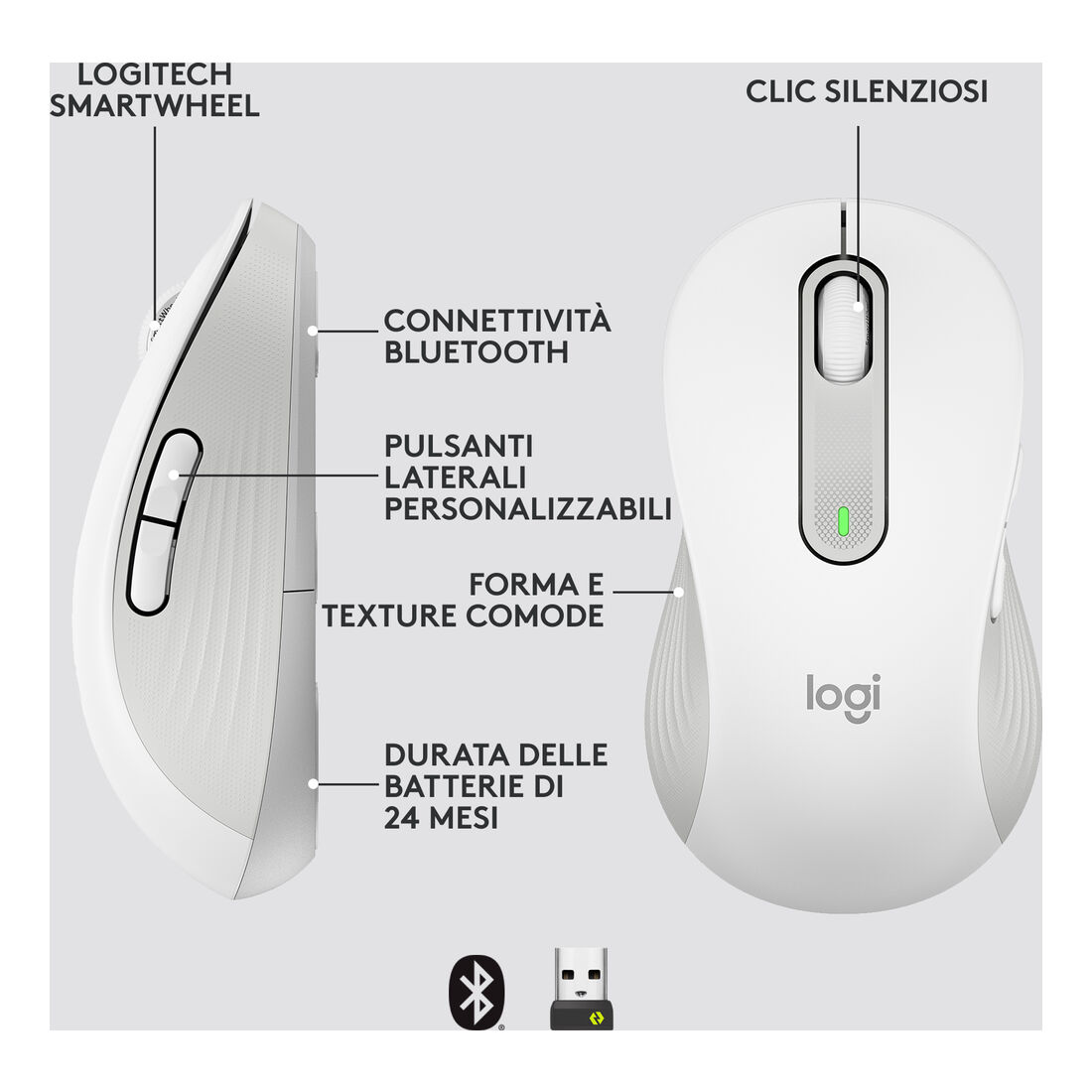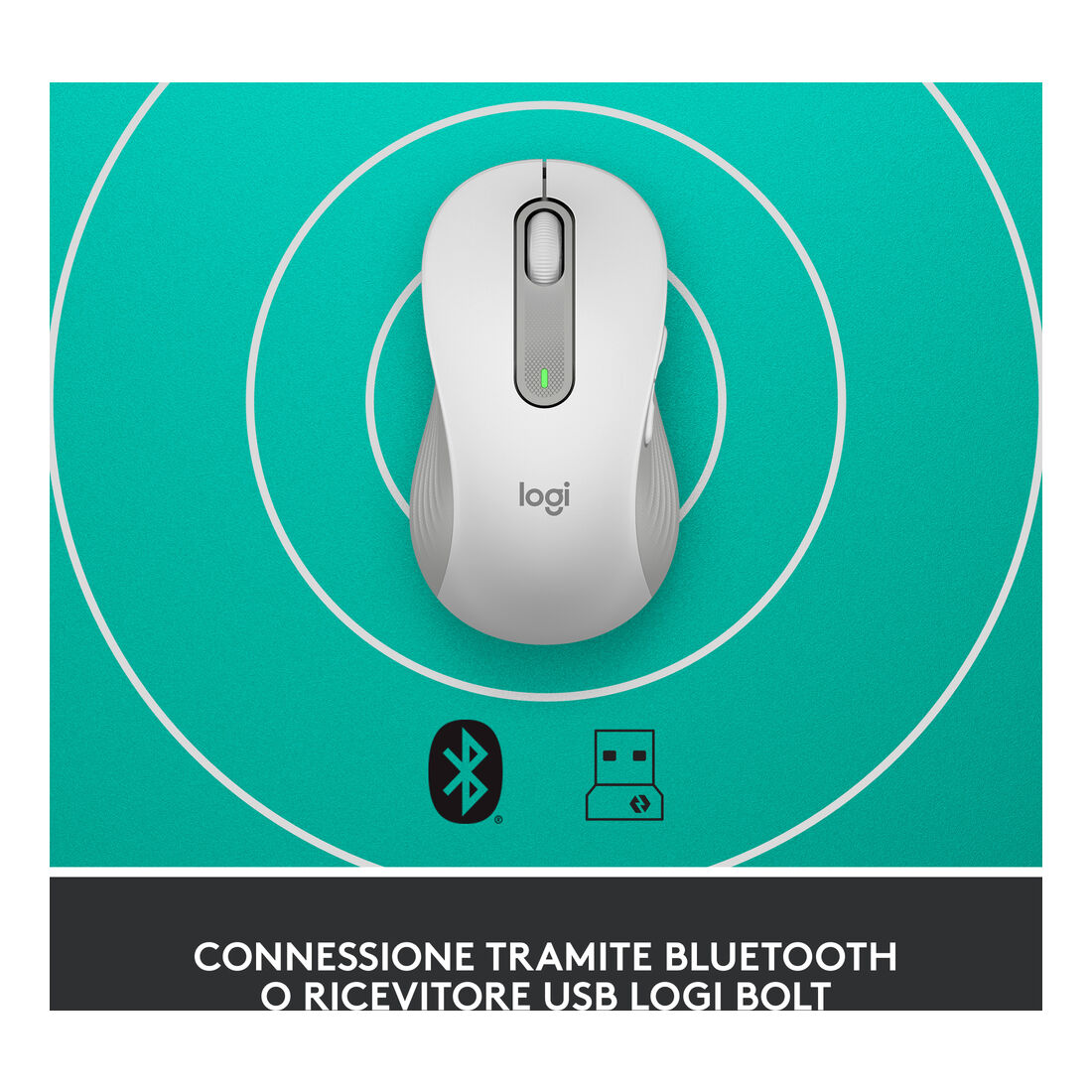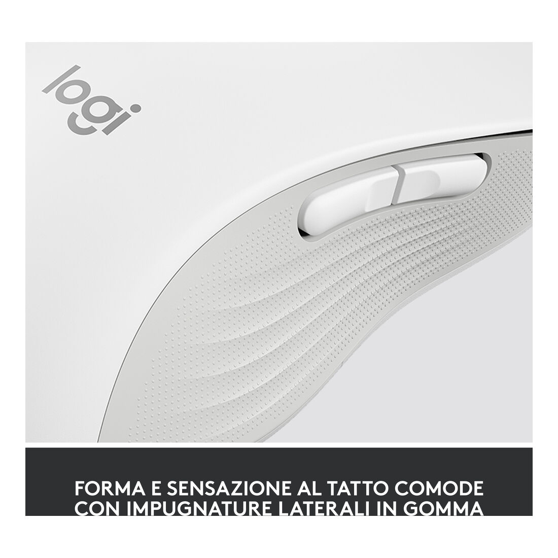 Logitech Signature M650 L. Fattore di forma: Mancino. Tecnologia di rilevamento del movimento: Ottico, Interfaccia dispositivo: Bluetooth, Risoluzione movimento: 4000 DPI, Tipo di pulsanti: Tasti premuti, Numero di tasti: 5, Tipo di scorimmento: Rotella. Alimentazione: Batterie. Colore del prodotto: Bianco