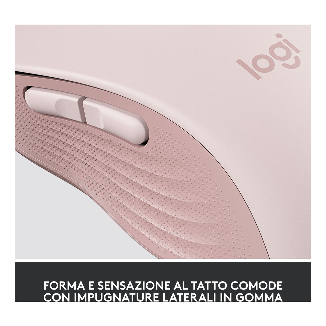 Logitech Signature M650. Fattore di forma: Mano destra. Tecnologia di rilevamento del movimento: Ottico, Interfaccia dispositivo: Bluetooth, Risoluzione movimento: 4000 DPI, Tipo di pulsanti: Tasti premuti, Numero di tasti: 5, Tipo di scorimmento: Rotella. Alimentazione: Batterie. Colore del prodotto: Rosa