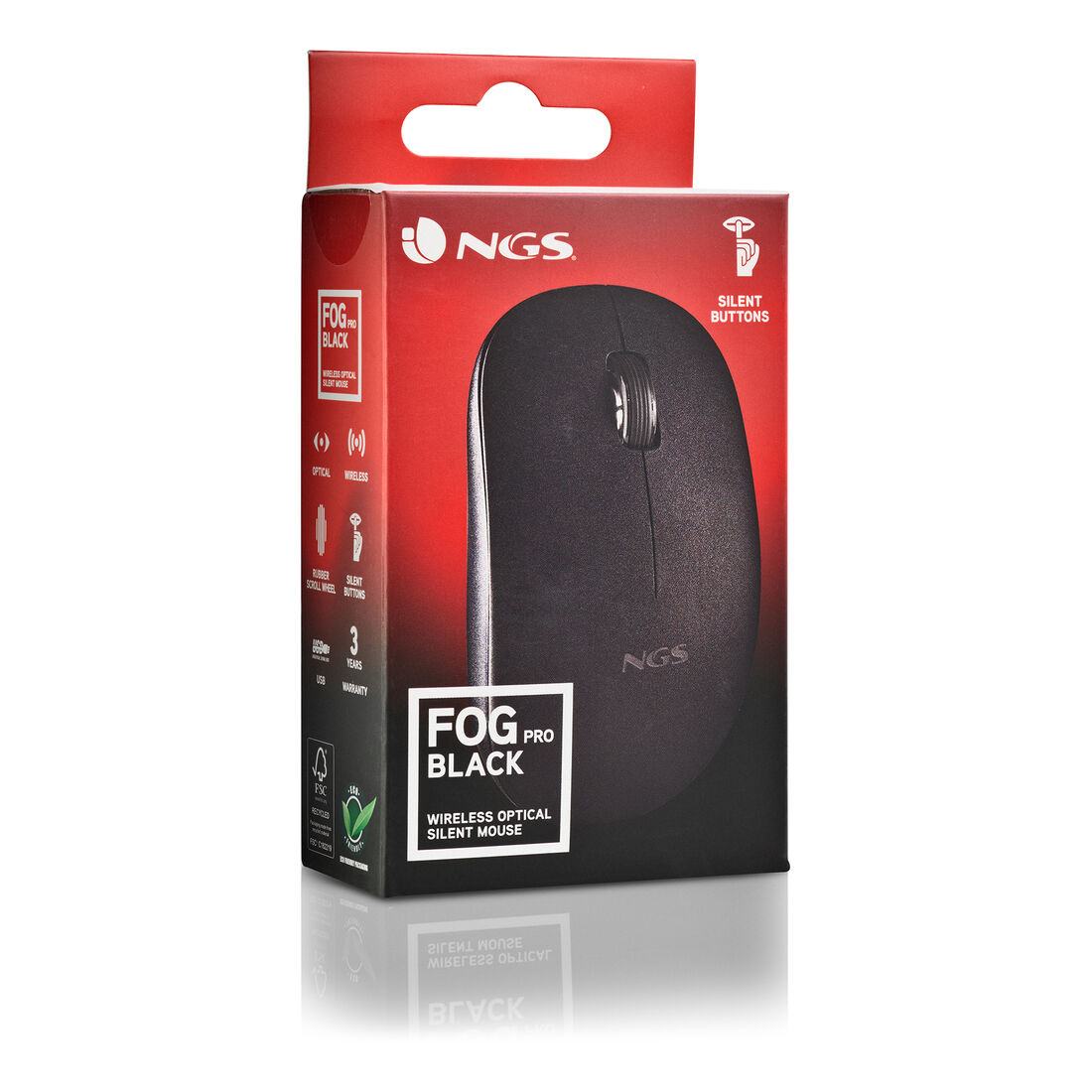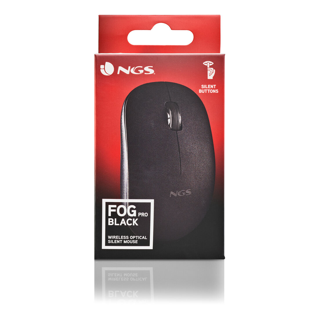 NGS FOG PRO. Fattore di forma: Ambidestro. Tecnologia di rilevamento del movimento: Ottico, Interfaccia dispositivo: RF Wireless, Risoluzione movimento: 1000 DPI, Tipo di pulsanti: Tasti premuti, Numero di tasti: 2, Tipo di scorimmento: Rotella. Alimentazione: Batterie. Funziona su tutte le superfici. Colore del prodotto: Nero