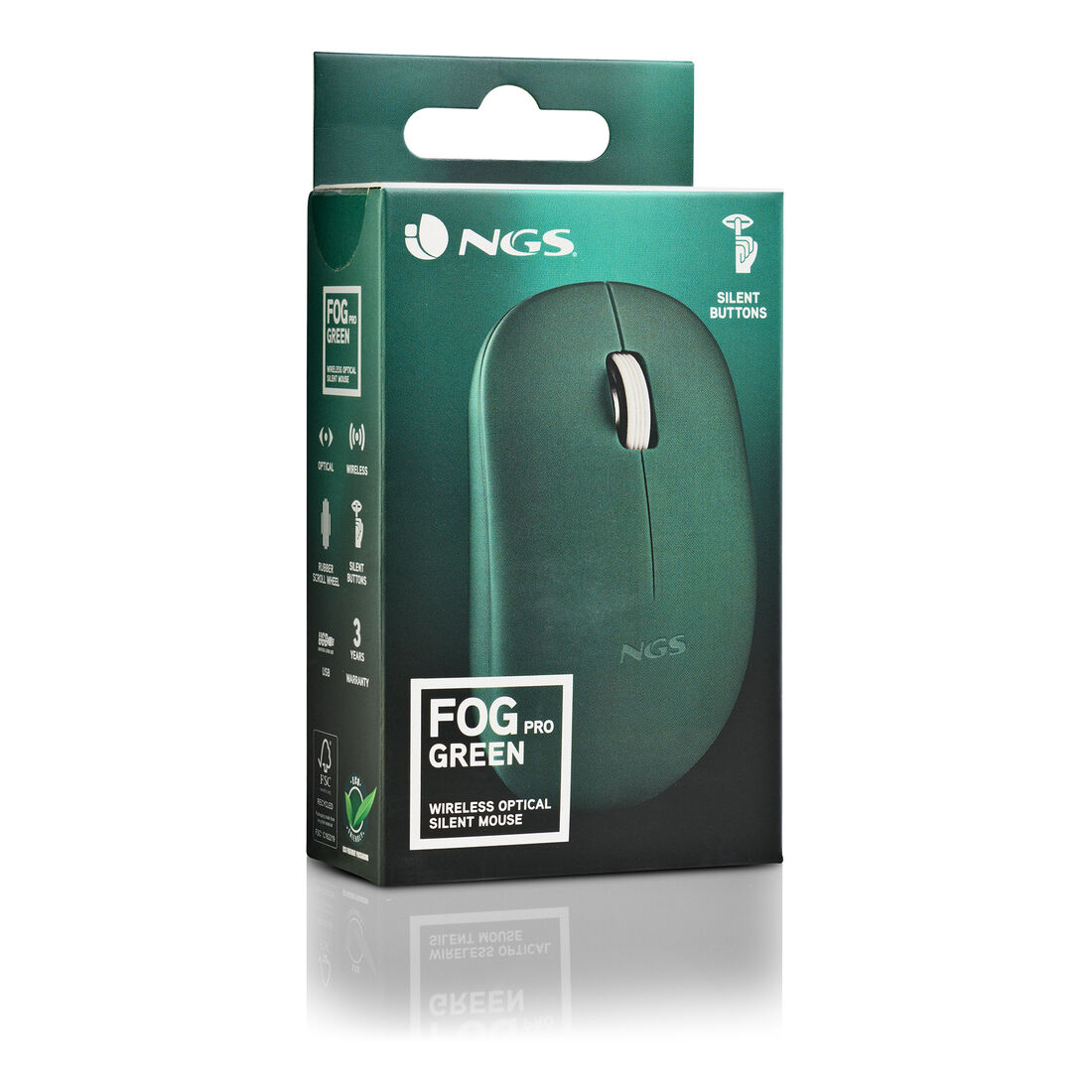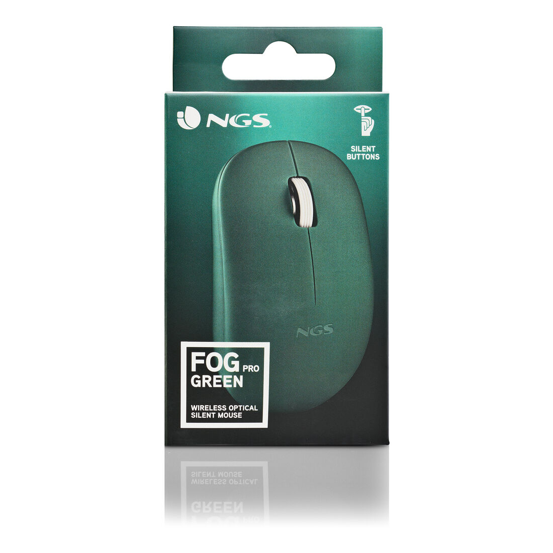 NGS FOG PRO. Fattore di forma: Ambidestro. Tecnologia di rilevamento del movimento: Ottico, Interfaccia dispositivo: RF Wireless, Risoluzione movimento: 1000 DPI, Tipo di pulsanti: Tasti premuti, Numero di tasti: 2, Tipo di scorimmento: Rotella. Alimentazione: Batterie. Funziona su tutte le superfici. Colore del prodotto: Verde