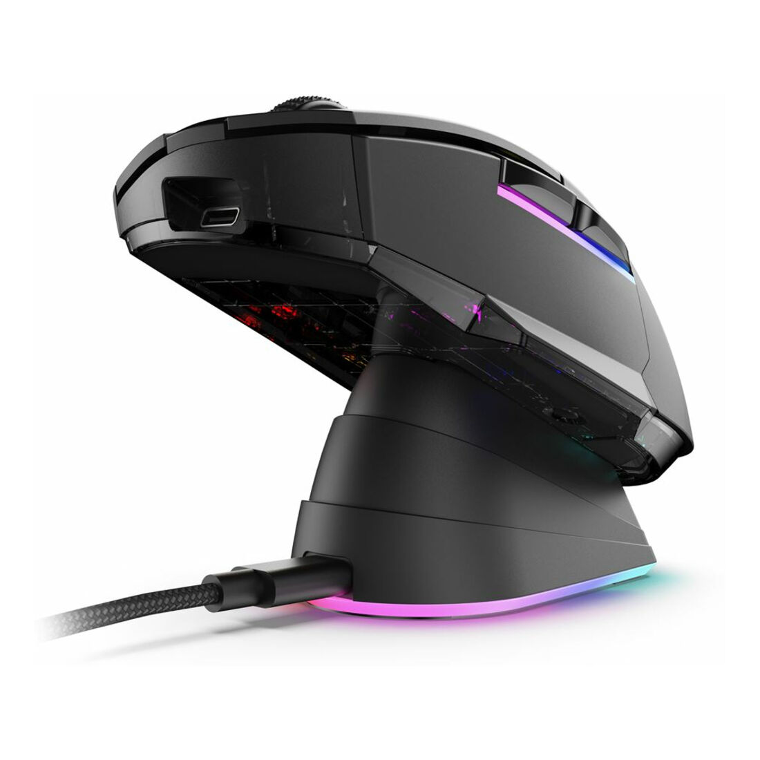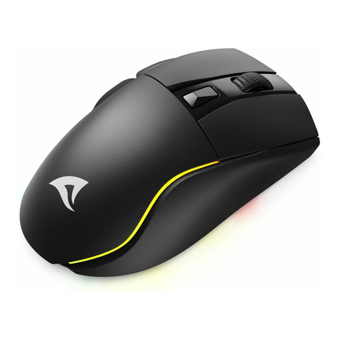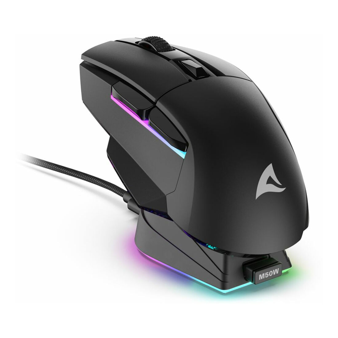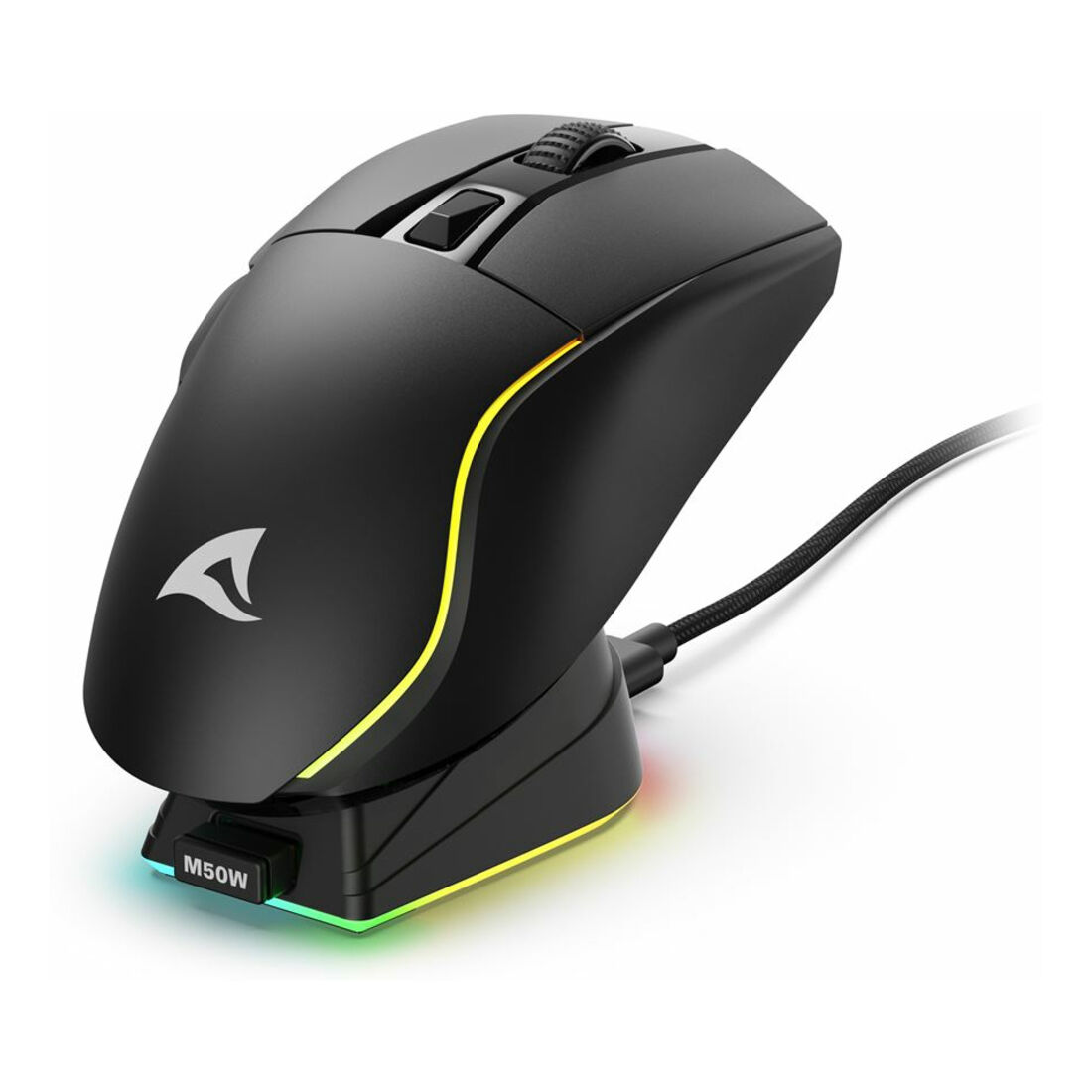 Sharkoon SGM50W. Fattore di forma: Mano destra. Tecnologia di rilevamento del movimento: Ottico, Interfaccia dispositivo: RF Wireless + USB Type-A, Risoluzione movimento: 6400 DPI, Tipo di pulsanti: Tasti premuti, Numero di tasti: 6, Tipo di scorimmento: Rotella, Accelerazione (max): 20 G. colore d’illuminazione: Multi. Alimentazione: Batterie/Cavo. Colore del prodotto: Nero