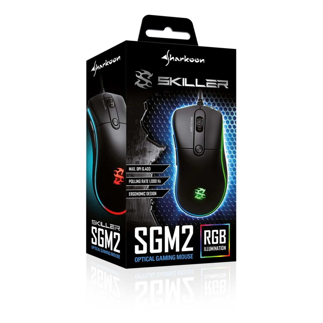 Sharkoon Skiller SGM2. Fattore di forma: Mano destra. Tecnologia di rilevamento del movimento: Ottico, Interfaccia dispositivo: USB tipo A, Risoluzione movimento: 6400 DPI, Tipo di pulsanti: Tasti premuti, Numero di tasti: 6, Tipo di scorimmento: Rotella, Accelerazione (max): 22,5 G. colore d’illuminazione: Blu, Verde, Rosso. Alimentazione: Cavo. Colore del prodotto: Nero