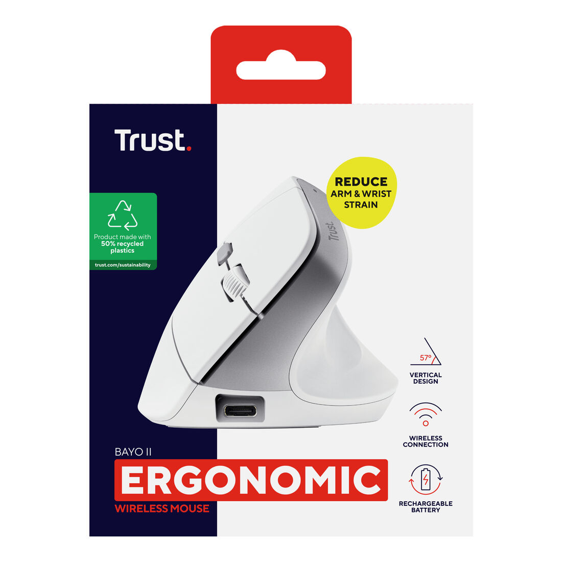 Trust Bayo II. Fattore di forma: Mano destra, Design verticale. Tecnologia di rilevamento del movimento: Ottico, Interfaccia dispositivo: RF Wireless, Risoluzione movimento: 2400 DPI, Tipo di pulsanti: Tasti premuti, Numero di tasti: 6, Tipo di scorimmento: Rotella. Alimentazione: Batterie/Cavo. Colore del prodotto: Bianco