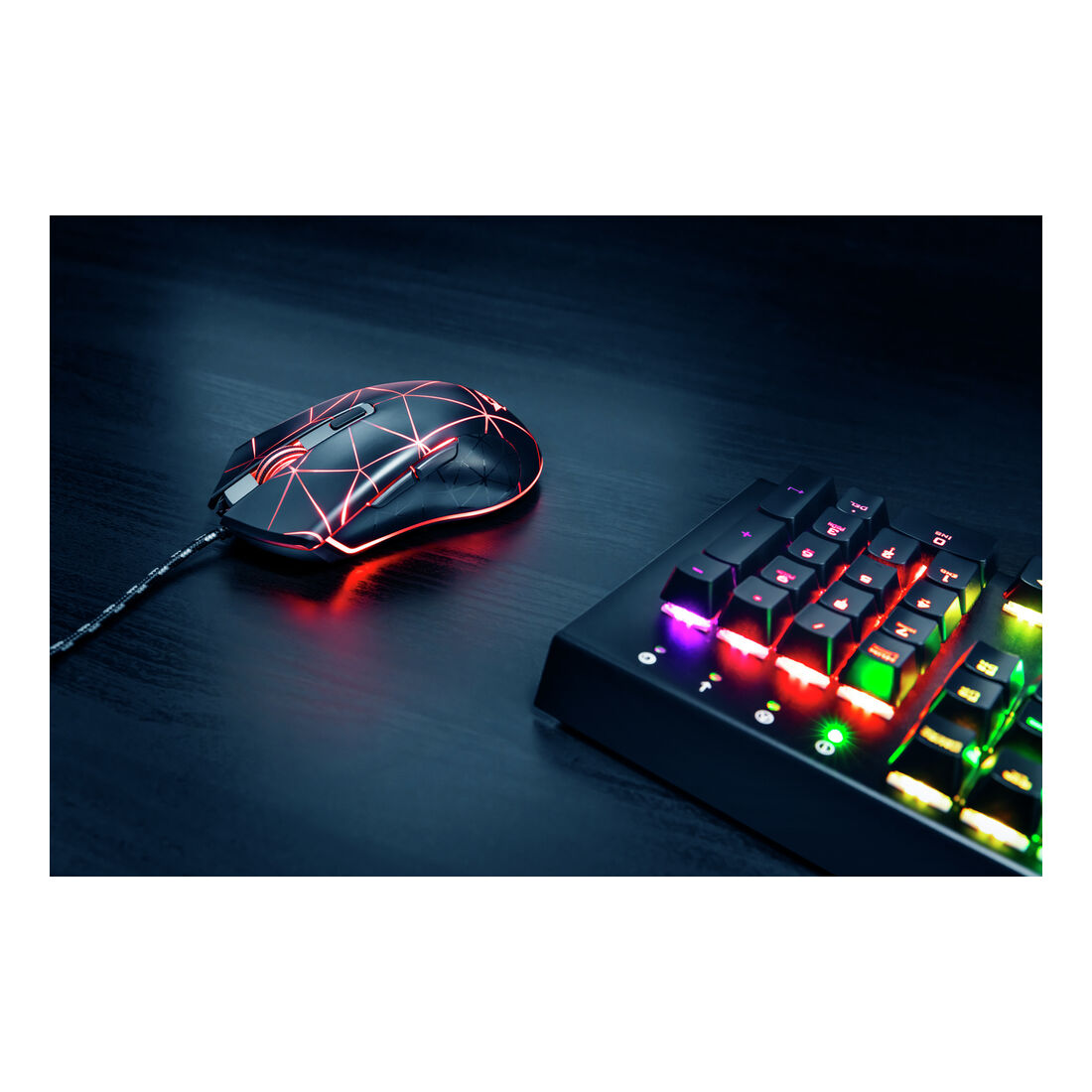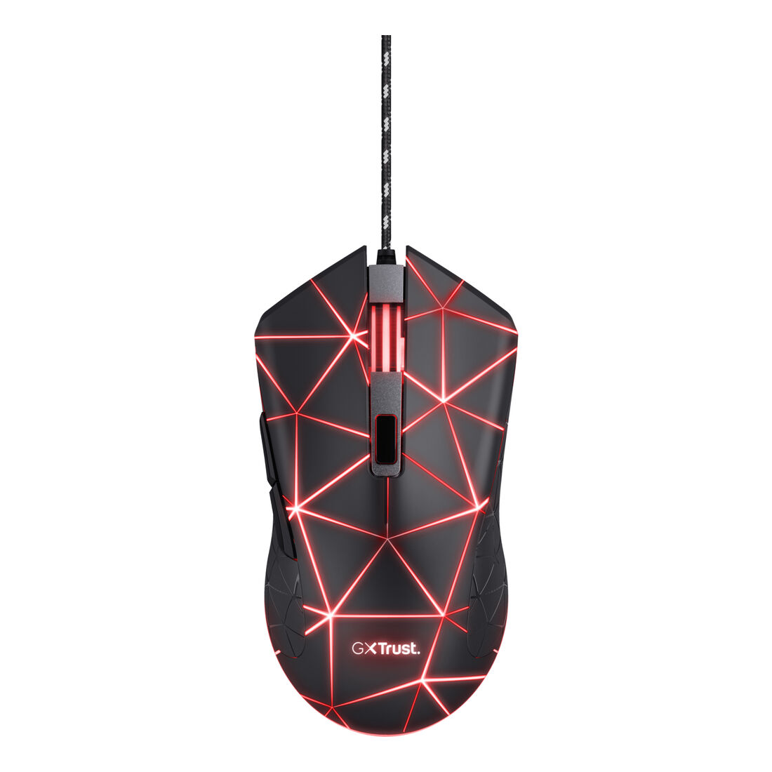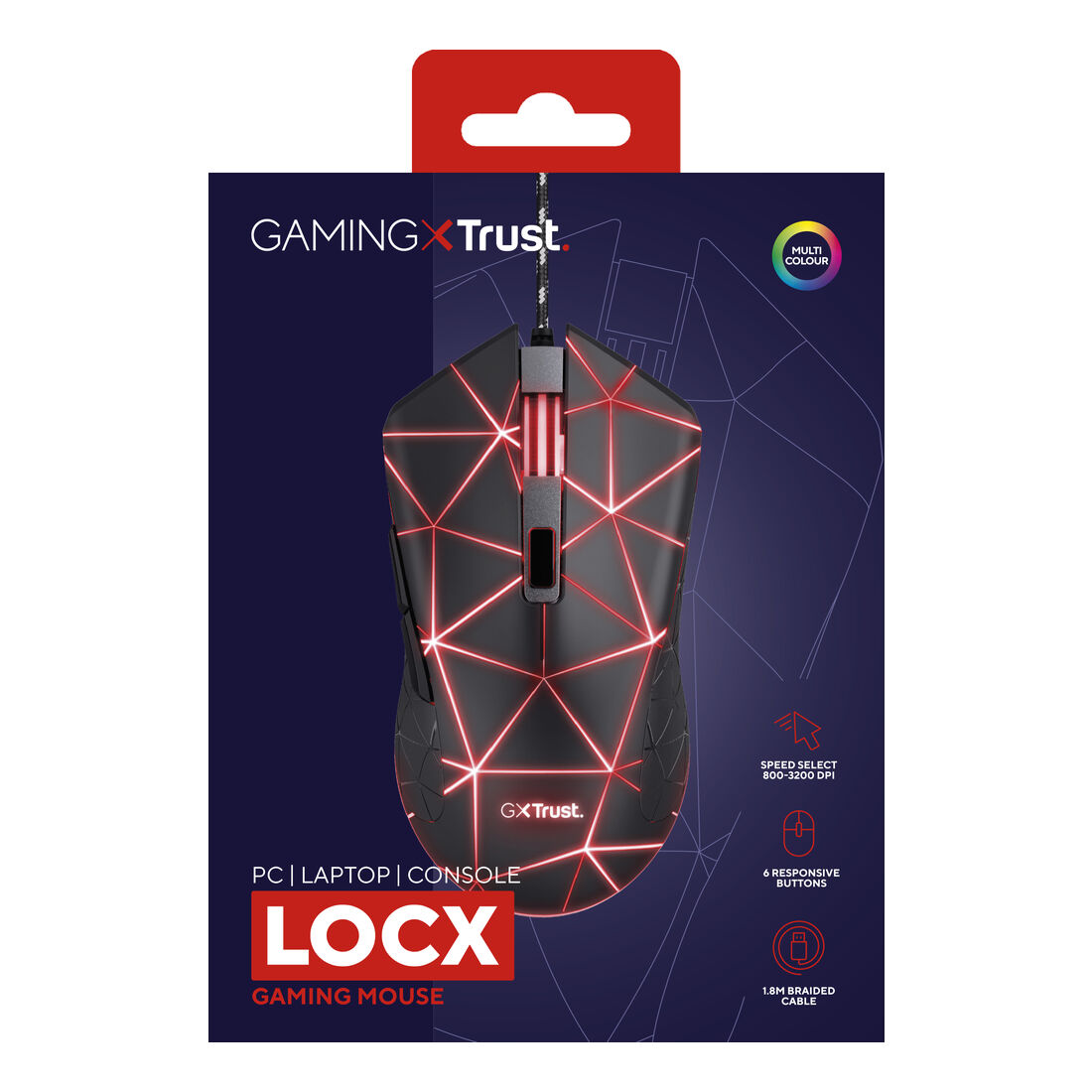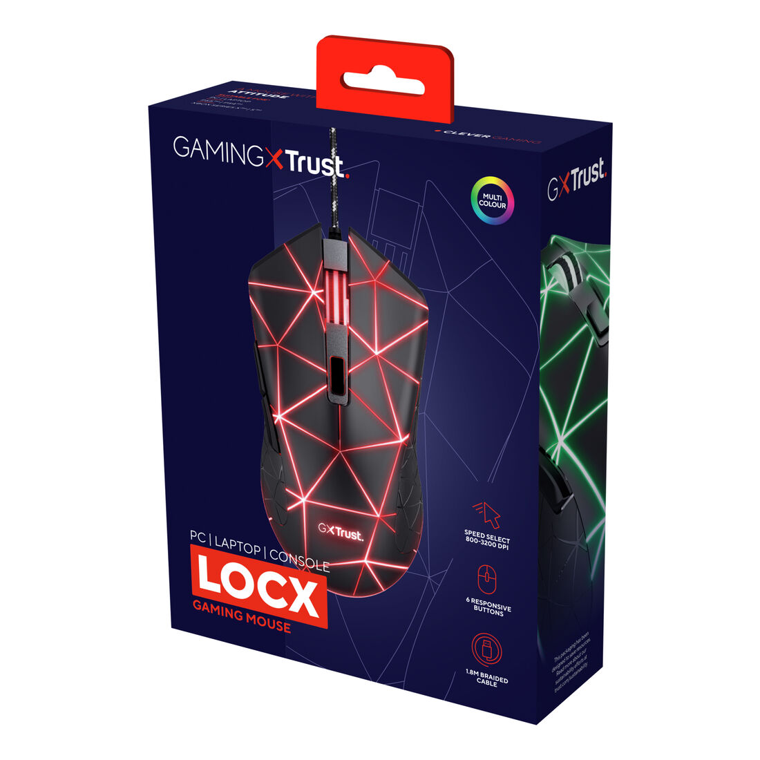Trust GXT 133 Locx. Fattore di forma: Mano destra. Tecnologia di rilevamento del movimento: Ottico, Interfaccia dispositivo: USB tipo A, Risoluzione movimento: 4000 DPI, Tipo di pulsanti: Tasti premuti, Numero di tasti: 6, Tipo di scorimmento: Rotella, Accelerazione (max): 10 G. Colore laser: Rosso, colore d’illuminazione: Multi. Alimentazione: Cavo. Colore del prodotto: Nero