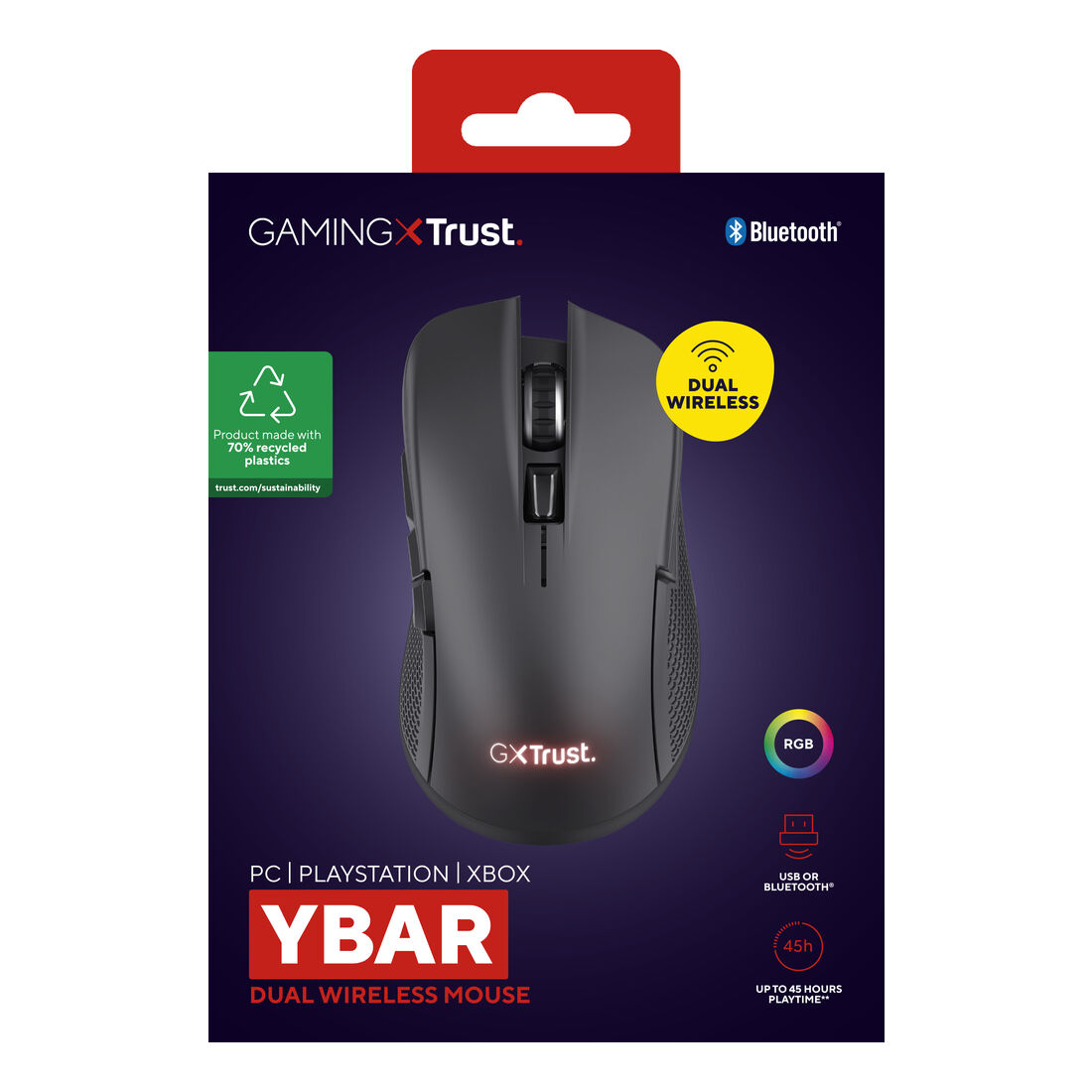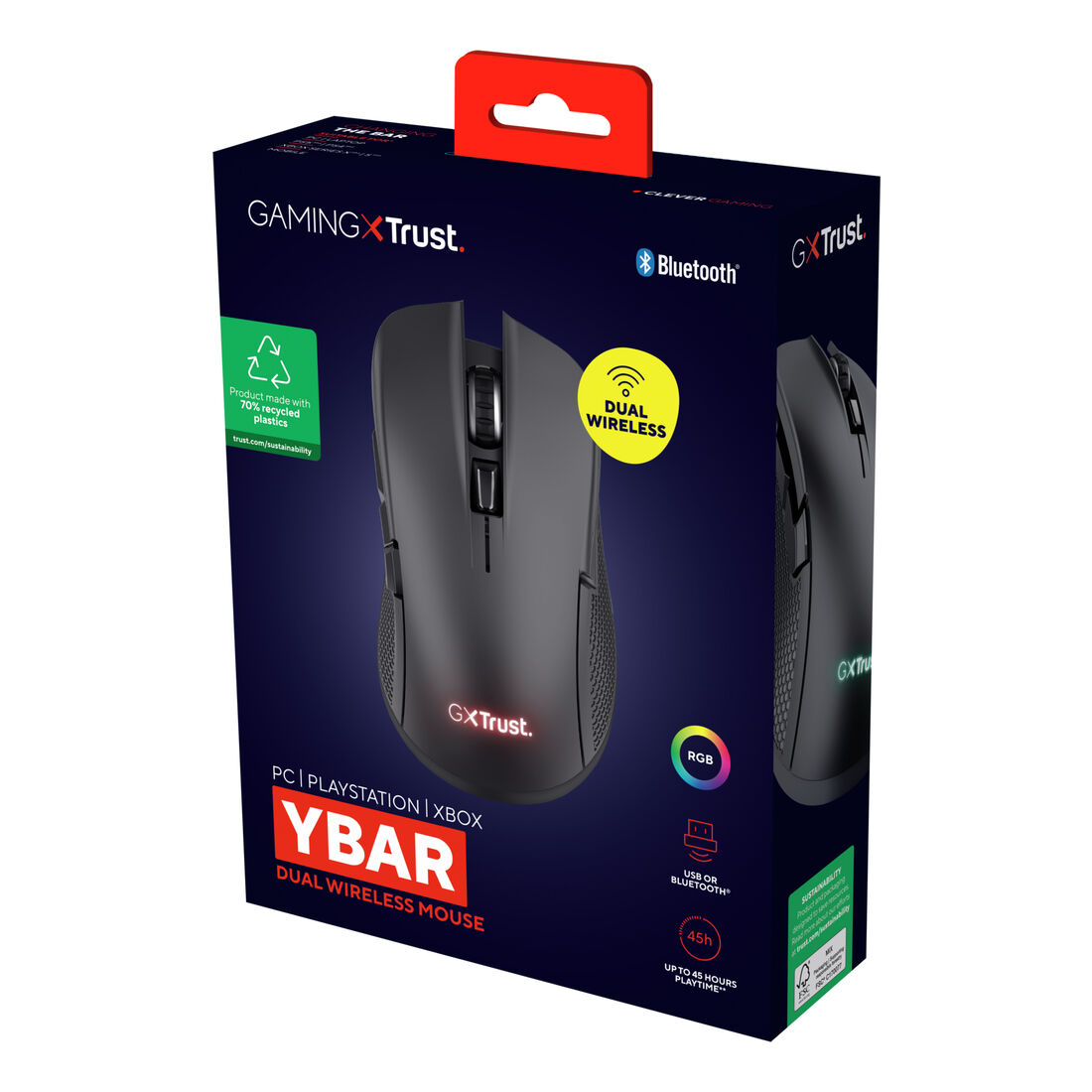 Trust GXT 931 Ybar. Fattore di forma: Mano destra. Tecnologia di rilevamento del movimento: Laser, Interfaccia dispositivo: Bluetooth, Risoluzione movimento: 7200 DPI, Tipo di pulsanti: Tasti premuti, Numero di tasti: 6, Tipo di scorimmento: Rotella. Alimentazione: Batterie/Cavo. Colore del prodotto: Nero