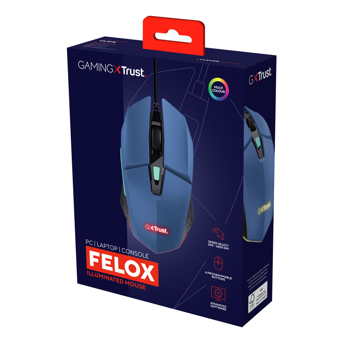 Trust GXT109B FELOX. Fattore di forma: Ambidestro. Interfaccia dispositivo: USB tipo A, Risoluzione movimento: 6400 DPI, Tipo di pulsanti: Tasti premuti, Numero di tasti: 6, Tipo di scorimmento: Rotella, Accelerazione (max): 20 G. colore d’illuminazione: Multi. Alimentazione: Cavo. Colore del prodotto: Blu