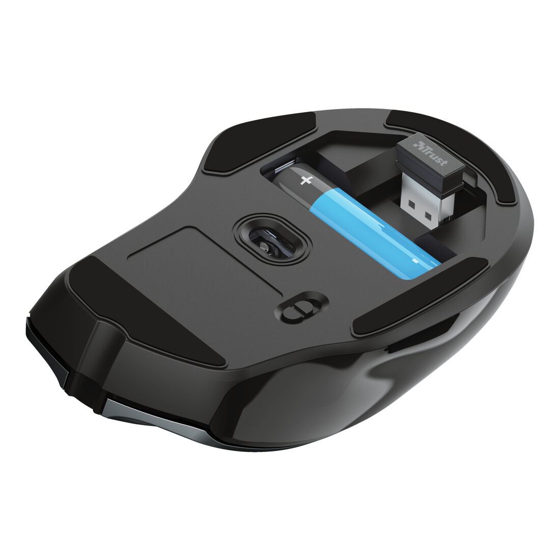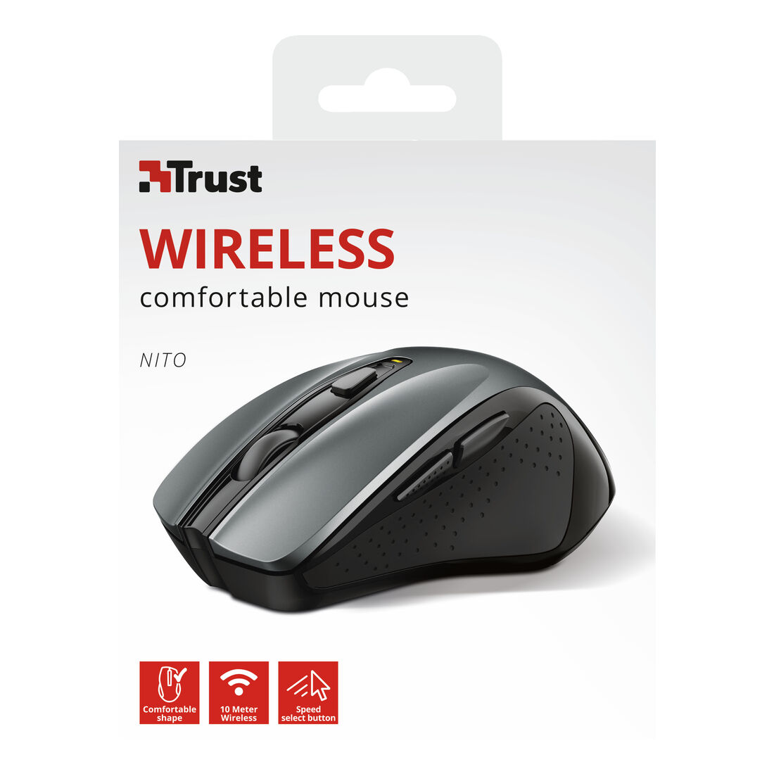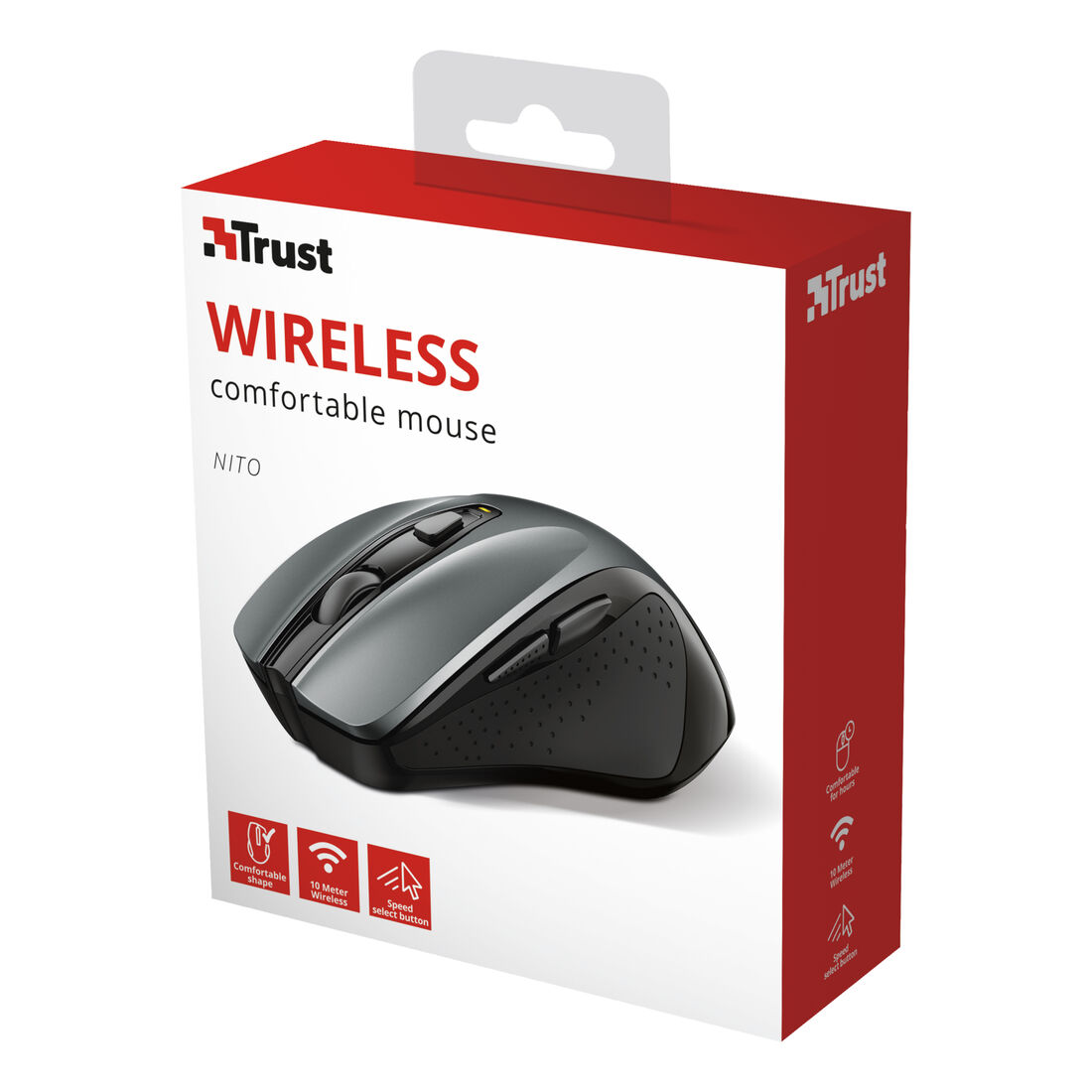 Trust Nito. Fattore di forma: Mano destra. Interfaccia dispositivo: RF Wireless, Risoluzione movimento: 2200 DPI, Tipo di pulsanti: Tasti premuti, Numero di tasti: 6, Tipo di scorimmento: Rotella. Alimentazione: Batterie. Colore del prodotto: Nero