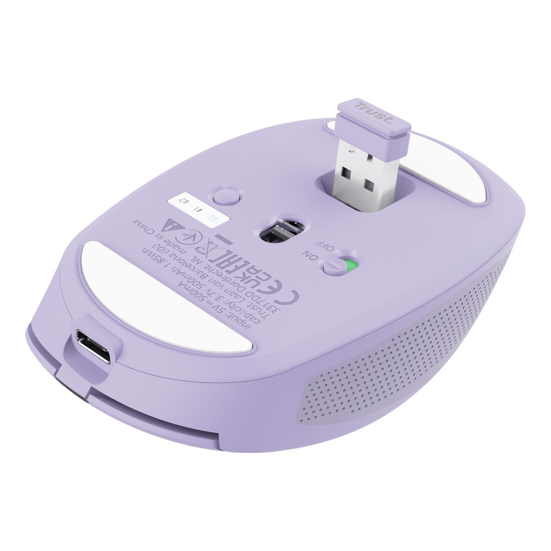 Trust Ozaa. Fattore di forma: Mano destra. Tecnologia di rilevamento del movimento: Ottico, Interfaccia dispositivo: RF senza fili + Bluetooth, Risoluzione movimento: 3200 DPI, Tipo di pulsanti: Tasti premuti, Numero di tasti: 6, Tipo di scorimmento: Rotella. Alimentazione: Batterie. Colore del prodotto: Lillà