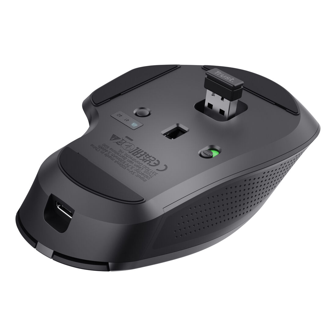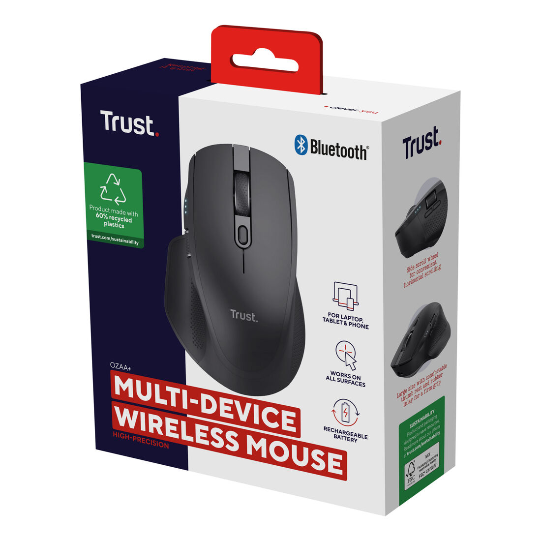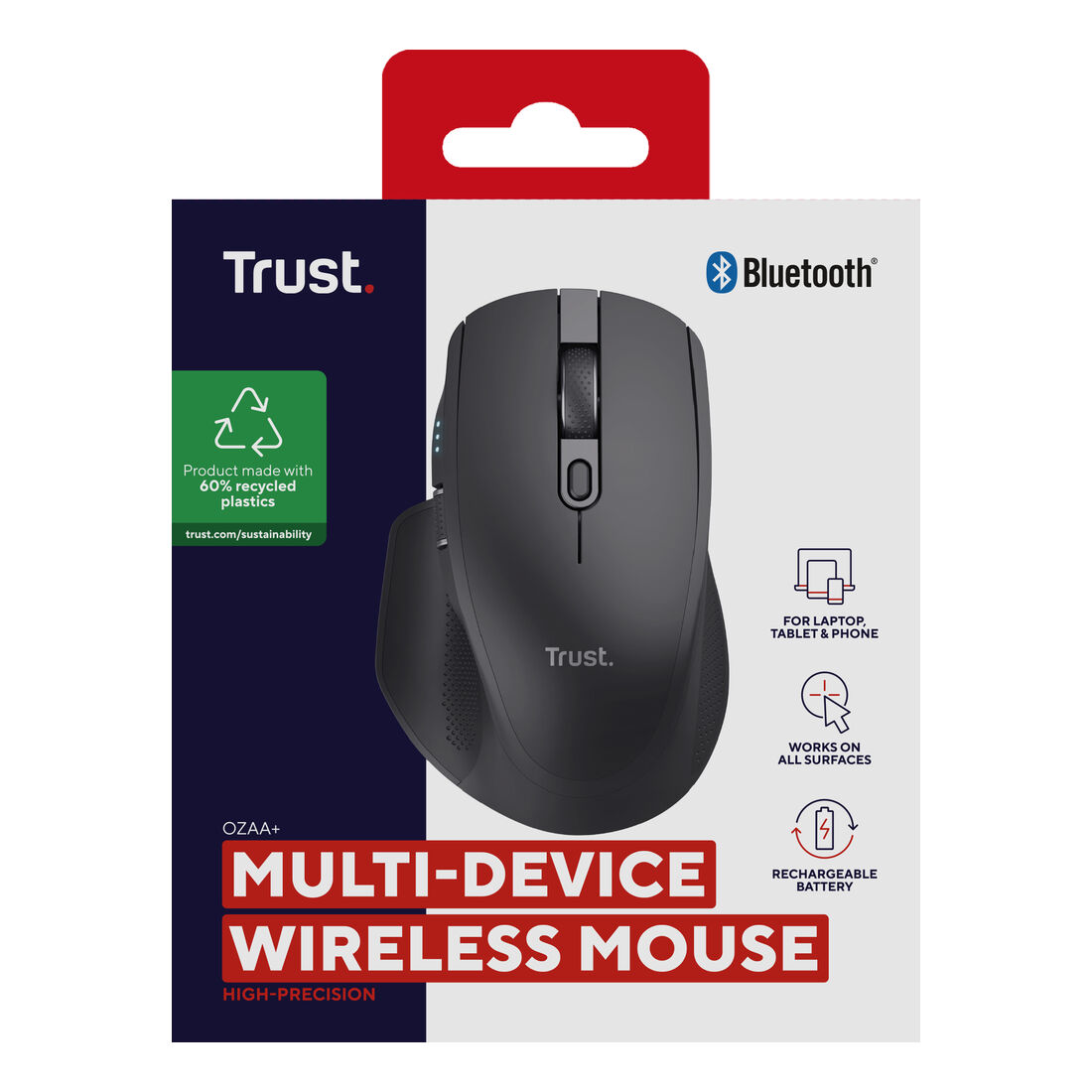 Trust Ozaa+. Fattore di forma: Mano destra. Tecnologia di rilevamento del movimento: Ottico, Interfaccia dispositivo: RF senza fili + Bluetooth, Risoluzione movimento: 3200 DPI, Tipo di pulsanti: Tasti premuti, Numero di tasti: 6, Tipo di scorimmento: Rotella. Alimentazione: Batterie/Cavo. Funziona su tutte le superfici. Colore del prodotto: Nero