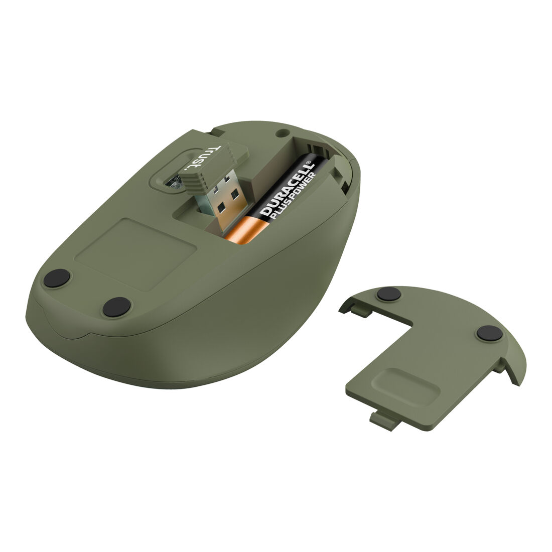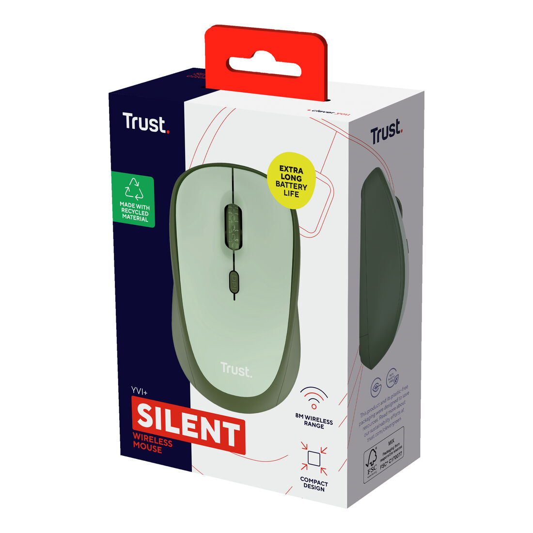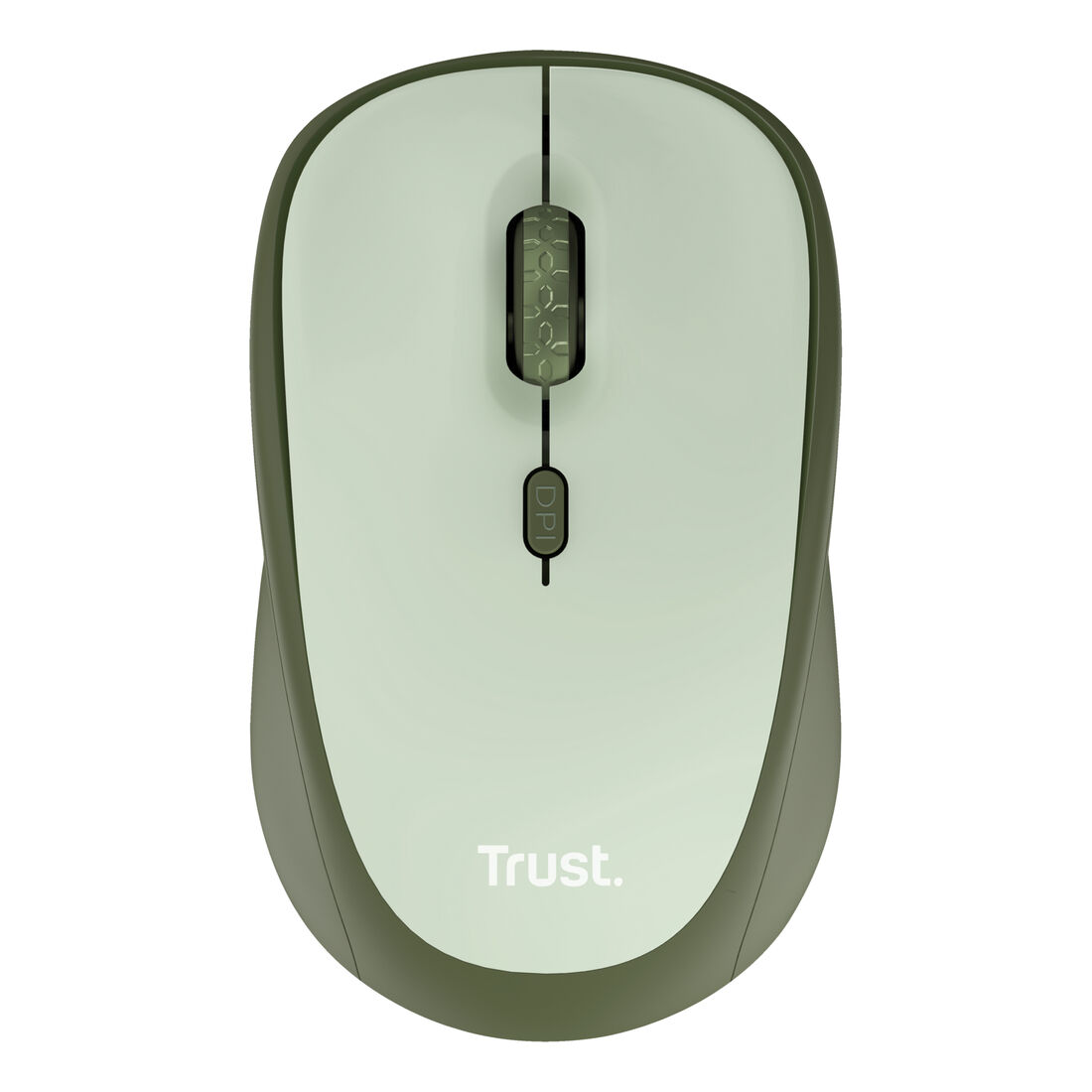 Trust Yvi+. Fattore di forma: Mano destra. Tecnologia di rilevamento del movimento: Ottico, Interfaccia dispositivo: RF Wireless, Risoluzione movimento: 1600 DPI, Tipo di pulsanti: Tasti premuti, Numero di tasti: 4, Tipo di scorimmento: Rotella. Alimentazione: Batterie. Colore del prodotto: Nero, Verde