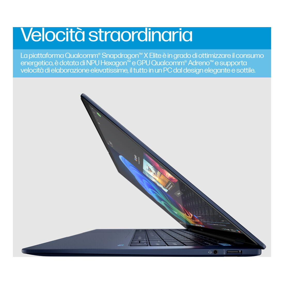 HP EliteBook Ultra G1q AI PC. Tipo di prodotto: Computer portatile, Fattore di forma: Clamshell. Famiglia processore: Qualcomm Snapdragon, Modello del processore: X1E-78-100. Dimensioni diagonale schermo: 35,6 cm (14″), Tipologia HD: 2.2K, Risoluzione del display: 2240 x 1400 Pixel, Touch screen. RAM installata: 16 GB, Tipo di RAM: LPDDR5x-SDRAM. Capacità totale di archiviazione: 512 GB, Supporto di memoria: SSD. Modello scheda grafica integrata: Qualcomm Adreno GPU. Sistema operativo incluso: Windows 11 Pro. Colore del prodotto: Blu