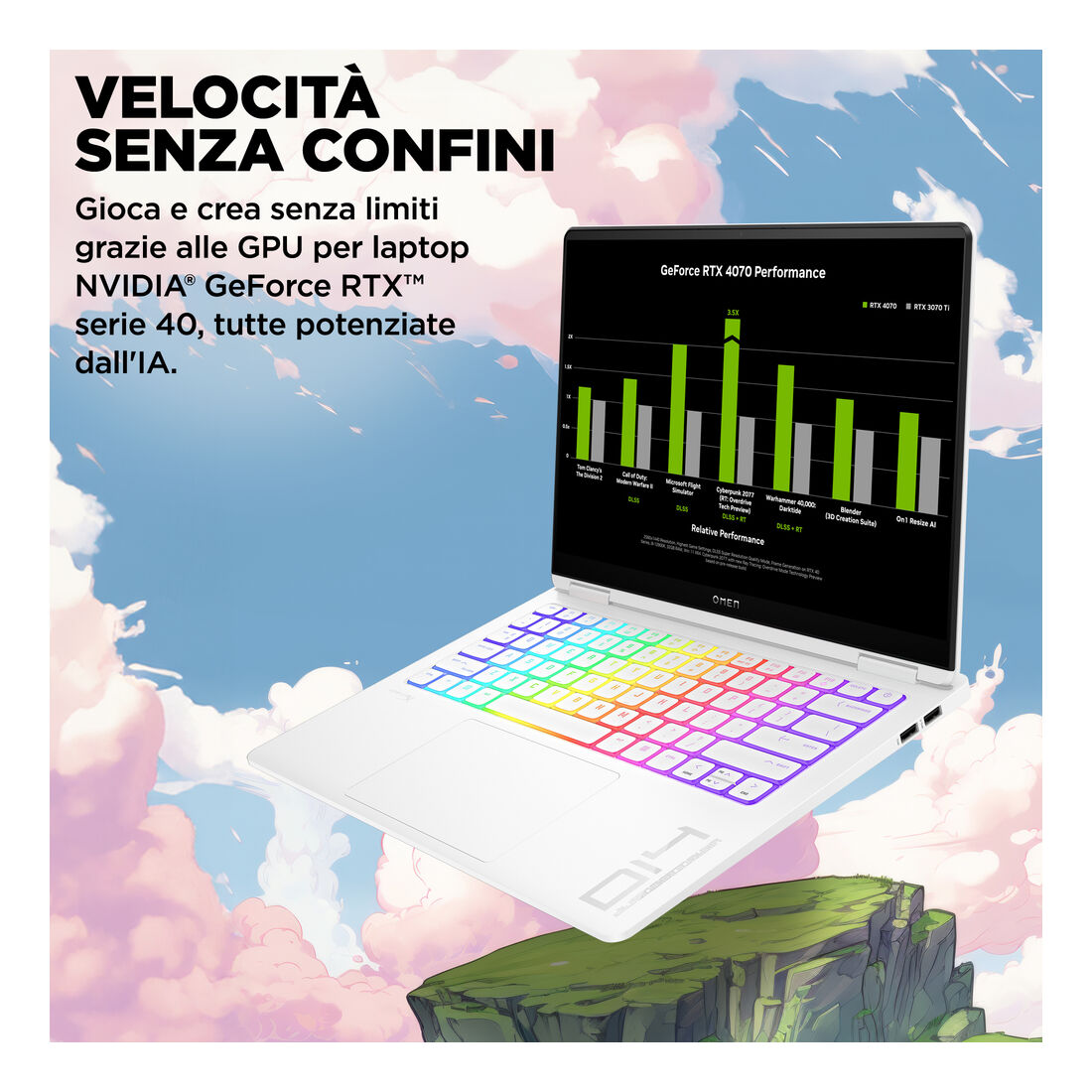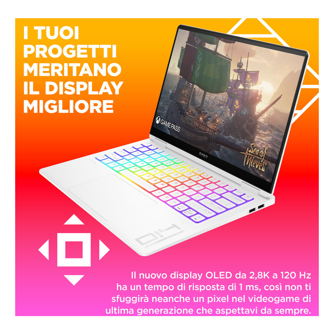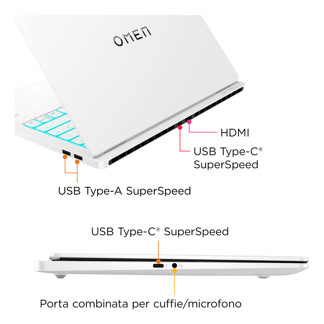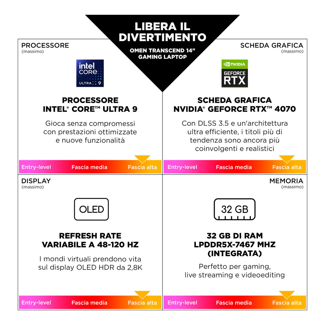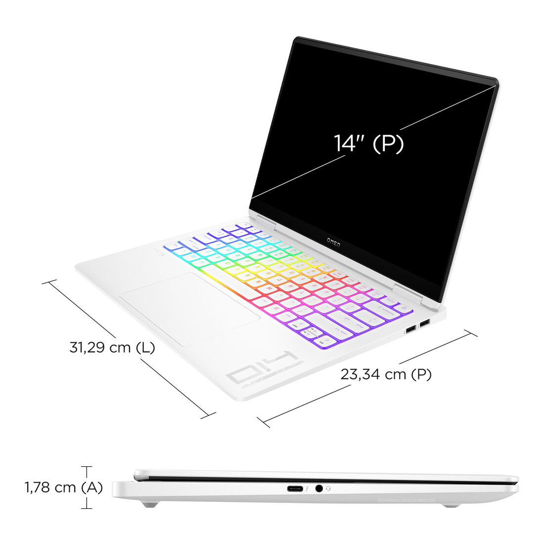 HP OMEN 14-fb0011nl. Tipo di prodotto: Computer portatile, Fattore di forma: Clamshell. Famiglia processore: Intel Core Ultra 7, Modello del processore: 155H. Dimensioni diagonale schermo: 35,6 cm (14″), Tipologia HD: 3K, Risoluzione del display: 2880 x 1800 Pixel. RAM installata: 16 GB, Tipo di RAM: LPDDR5x-SDRAM. Capacità totale di archiviazione: 512 GB, Supporto di memoria: SSD. Modello scheda grafica integrata: Intel Arc Graphics, Scheda grafica dedicata: NVIDIA GeForce RTX 4050. Sistema operativo incluso: Windows 11 Home. Colore del prodotto: Nero