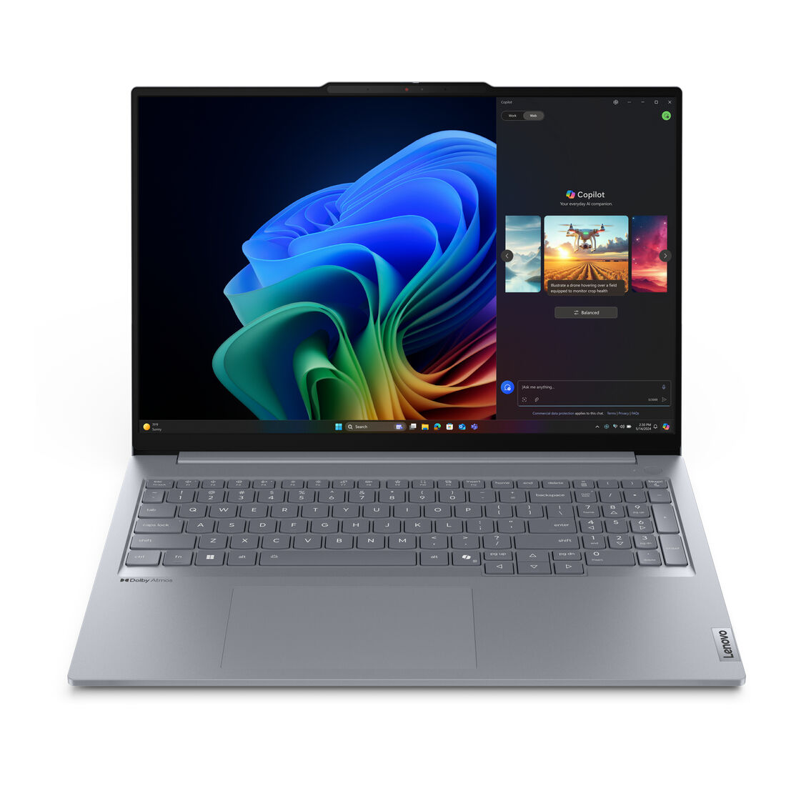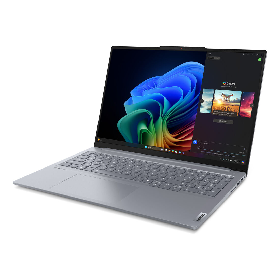 Lenovo ThinkBook 16 G7 QOY Copilot+ PC. Tipo di prodotto: Computer portatile, Fattore di forma: Clamshell. Famiglia processore: Qualcomm Snapdragon, Modello del processore: X1P-42-100, Frequenza del processore: 3,4 GHz. Dimensioni diagonale schermo: 40,6 cm (16″), Tipologia HD: WUXGA, Risoluzione del display: 1920 x 1200 Pixel. RAM installata: 16 GB, Tipo di RAM: LPDDR5x-SDRAM. Capacità totale di archiviazione: 512 GB, Supporto di memoria: SSD. Modello scheda grafica integrata: Qualcomm Adreno GPU. Sistema operativo incluso: Windows 11 Pro. Colore del prodotto: Grigio