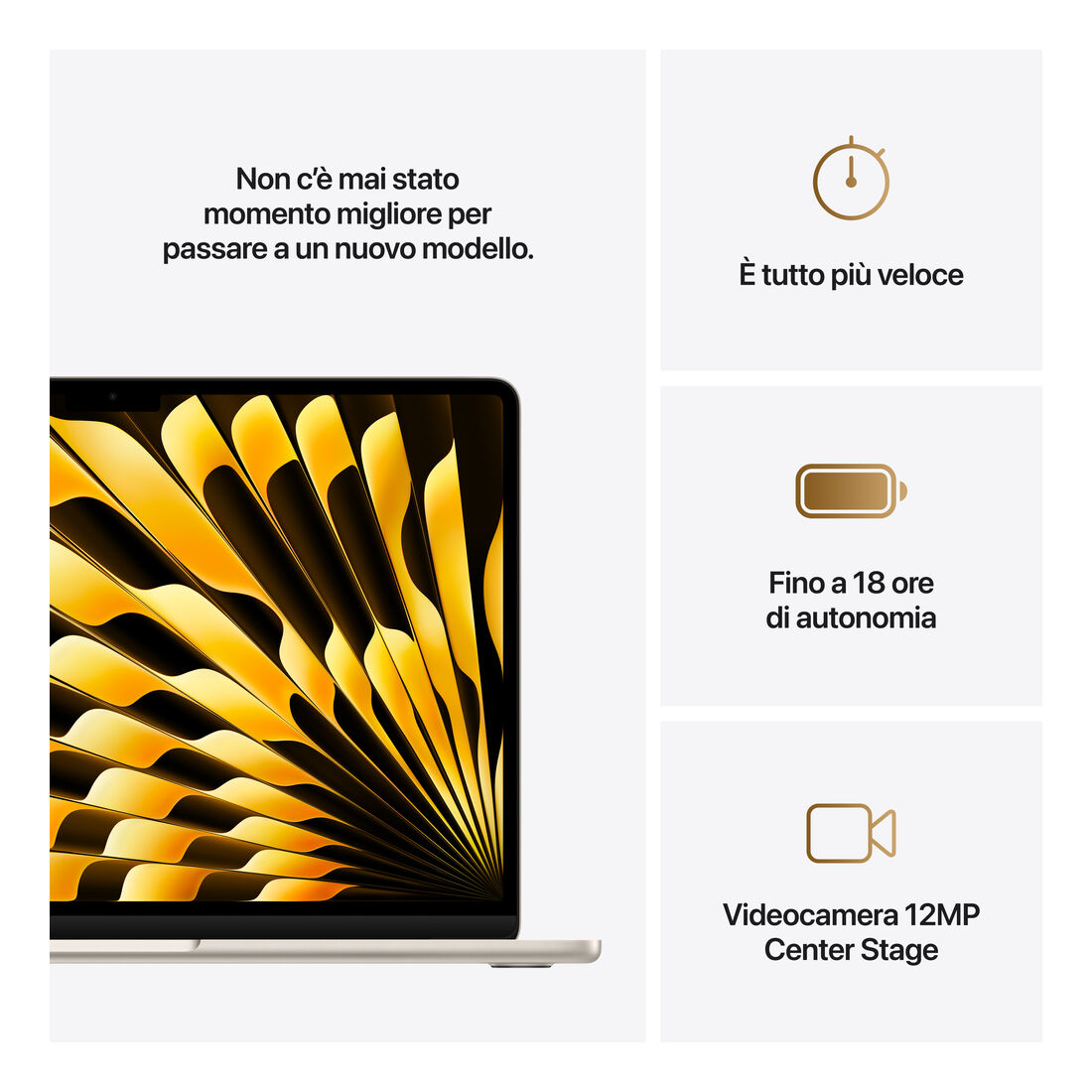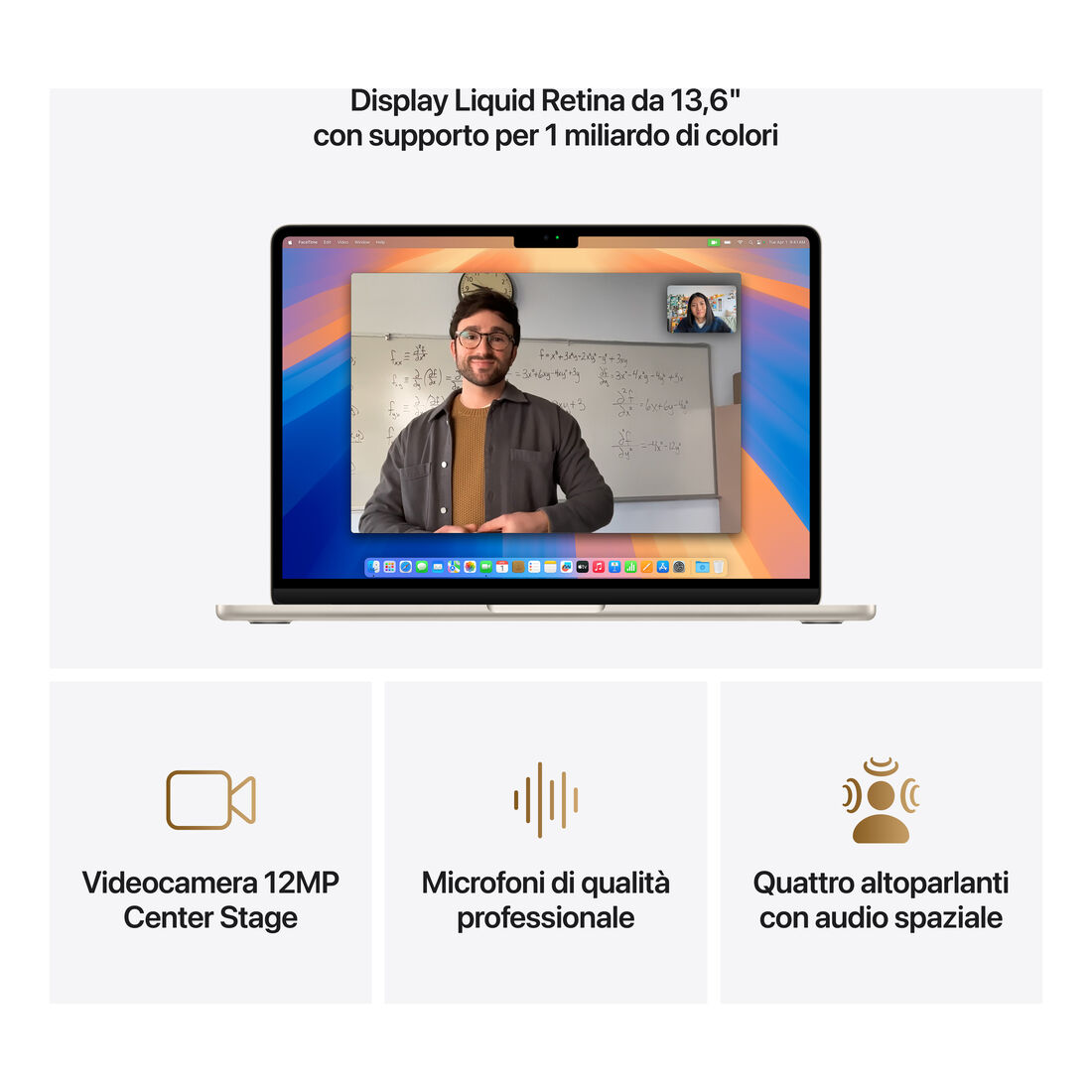Apple MacBook Air 13” M4 chip 10-core CPU 10-core GPU, 16GB, 512GB SSD – Galassia. Tipo di prodotto: Computer portatile, Fattore di forma: Clamshell. Famiglia processore: Apple M, Modello del processore: M4. Dimensioni diagonale schermo: 34,5 cm (13.6″), Risoluzione del display: 2560 x 1664 Pixel. RAM installata: 16 GB. Capacità totale di archiviazione: 512 GB, Supporto di memoria: SSD. Modello scheda grafica integrata: Apple GPU. Sistema operativo incluso: macOS Sequoia. Colore del prodotto: Beige. Peso: 1,24 kg