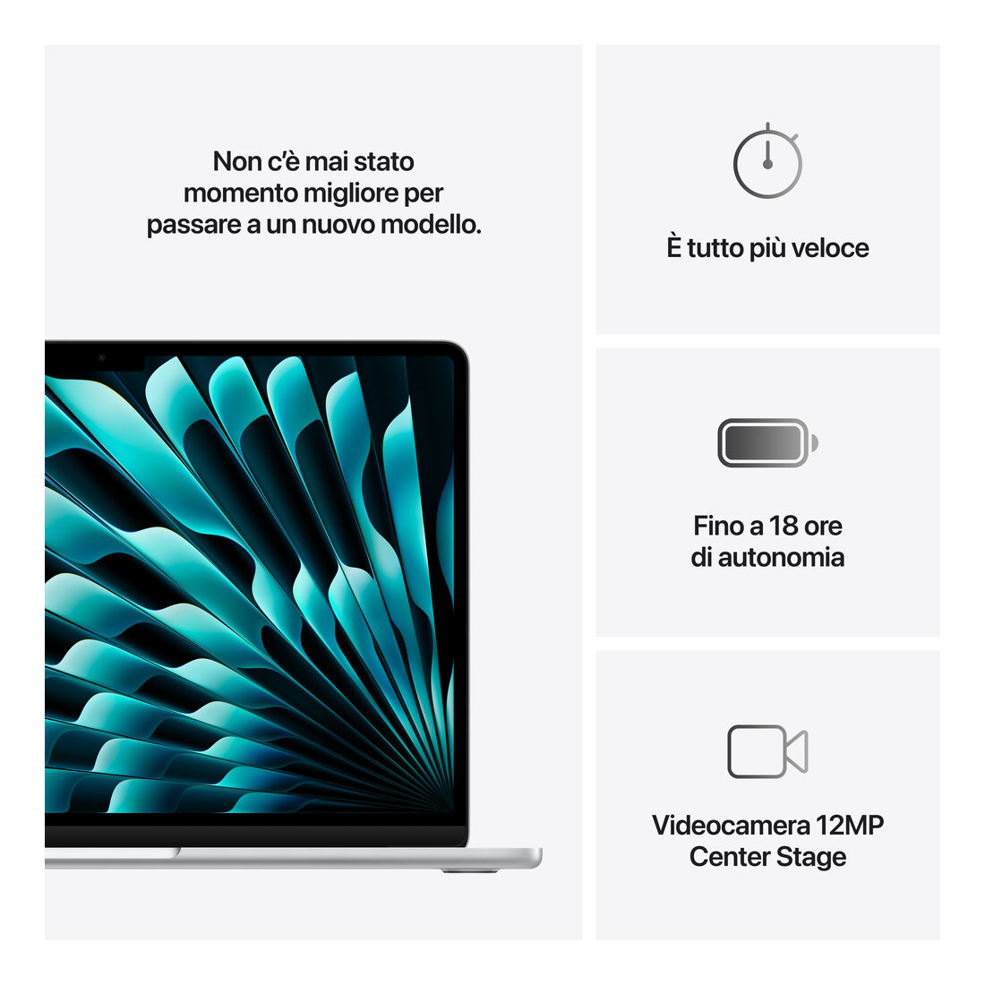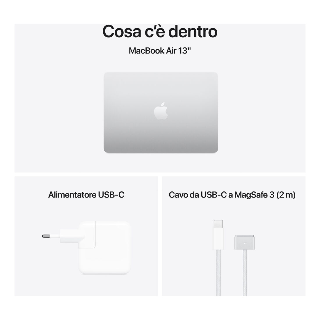 Apple MacBook Air 13” M4 chip 10-core CPU 10-core GPU, 24GB, 512GB SSD – Argento. Tipo di prodotto: Computer portatile, Fattore di forma: Clamshell. Famiglia processore: Apple M, Modello del processore: M4. Dimensioni diagonale schermo: 34,5 cm (13.6″), Risoluzione del display: 2560 x 1664 Pixel. RAM installata: 24 GB. Capacità totale di archiviazione: 512 GB, Supporto di memoria: SSD. Modello scheda grafica integrata: Apple GPU. Sistema operativo incluso: macOS Sequoia. Colore del prodotto: Argento. Peso: 1,24 kg