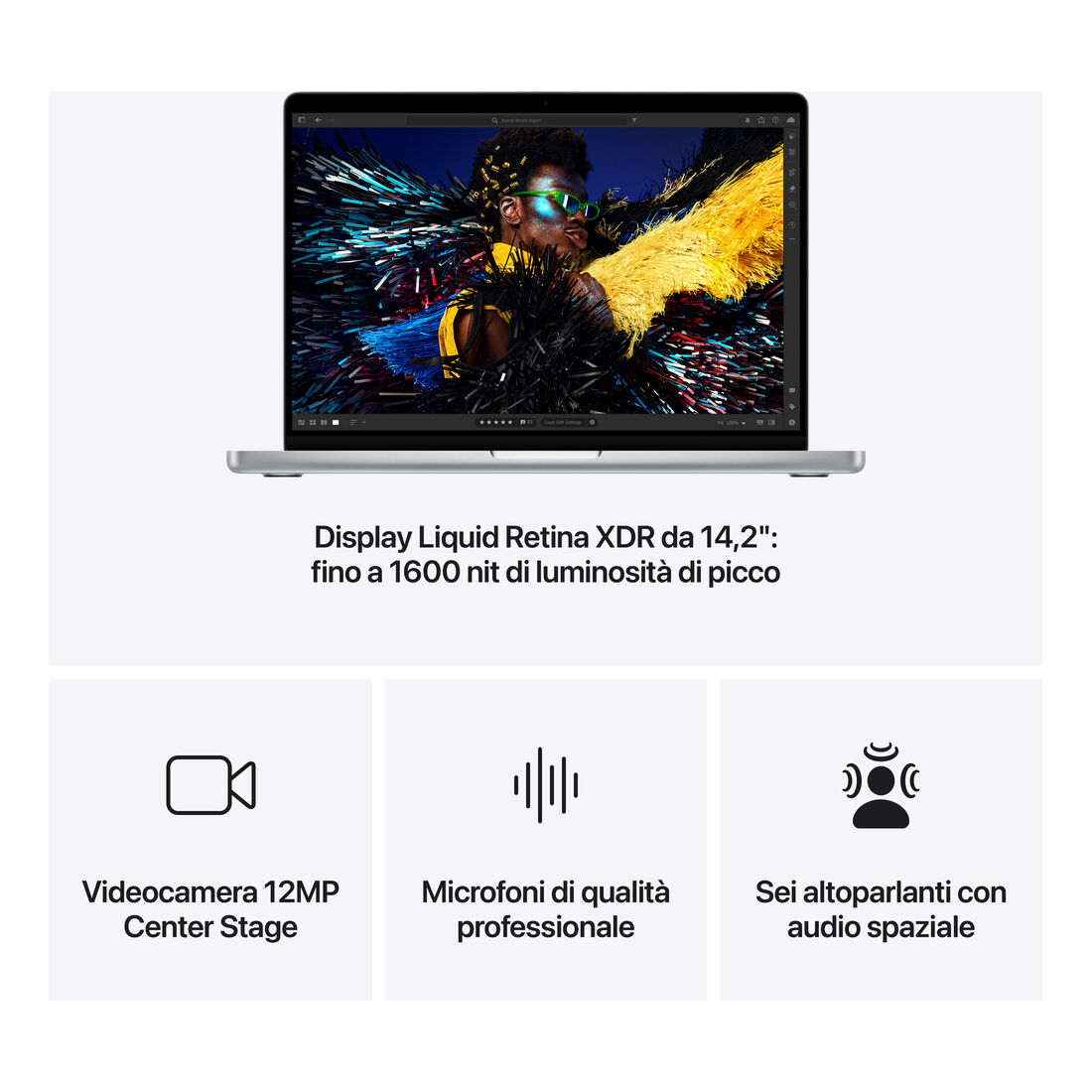 Apple MacBook Pro 14″: Chip M4 Pro con cpu 14 core e gpu 20 core, 1TB SSD – Argento. Tipo di prodotto: Computer portatile, Fattore di forma: Clamshell. Famiglia processore: Apple M, Modello del processore: M4 Pro. Dimensioni diagonale schermo: 36,1 cm (14.2″), Risoluzione del display: 3024 x 1964 Pixel. RAM installata: 24 GB. Capacità totale di archiviazione: 1 TB, Supporto di memoria: SSD. Modello scheda grafica integrata: Apple GPU. Sistema operativo incluso: macOS Sequoia. Colore del prodotto: Argento. Peso: 1,6 kg