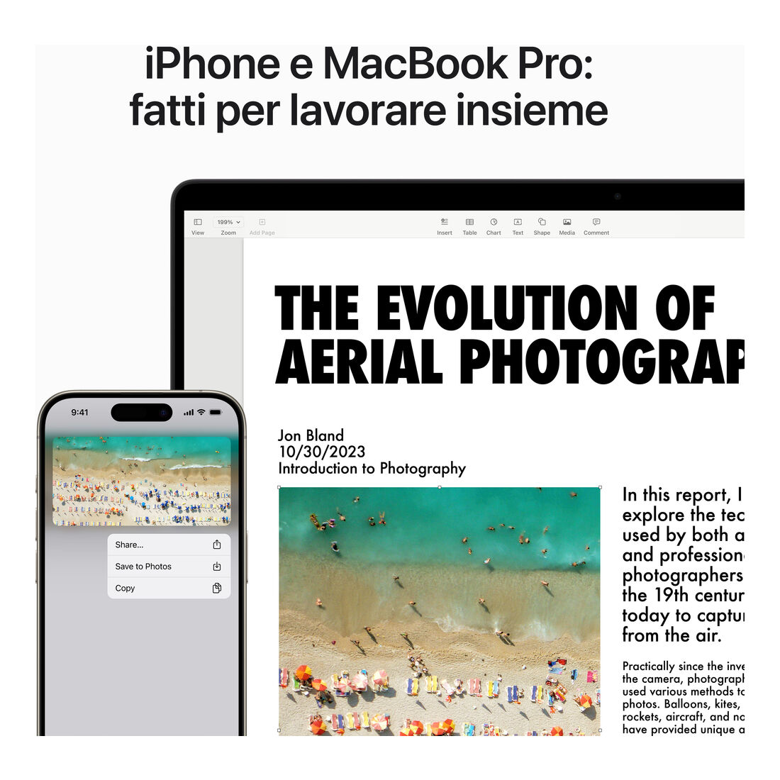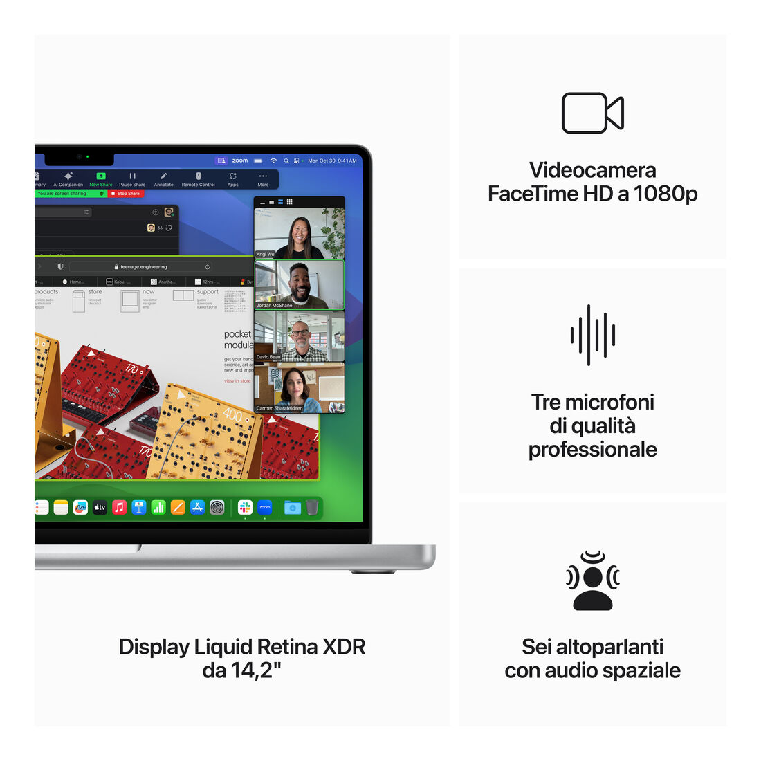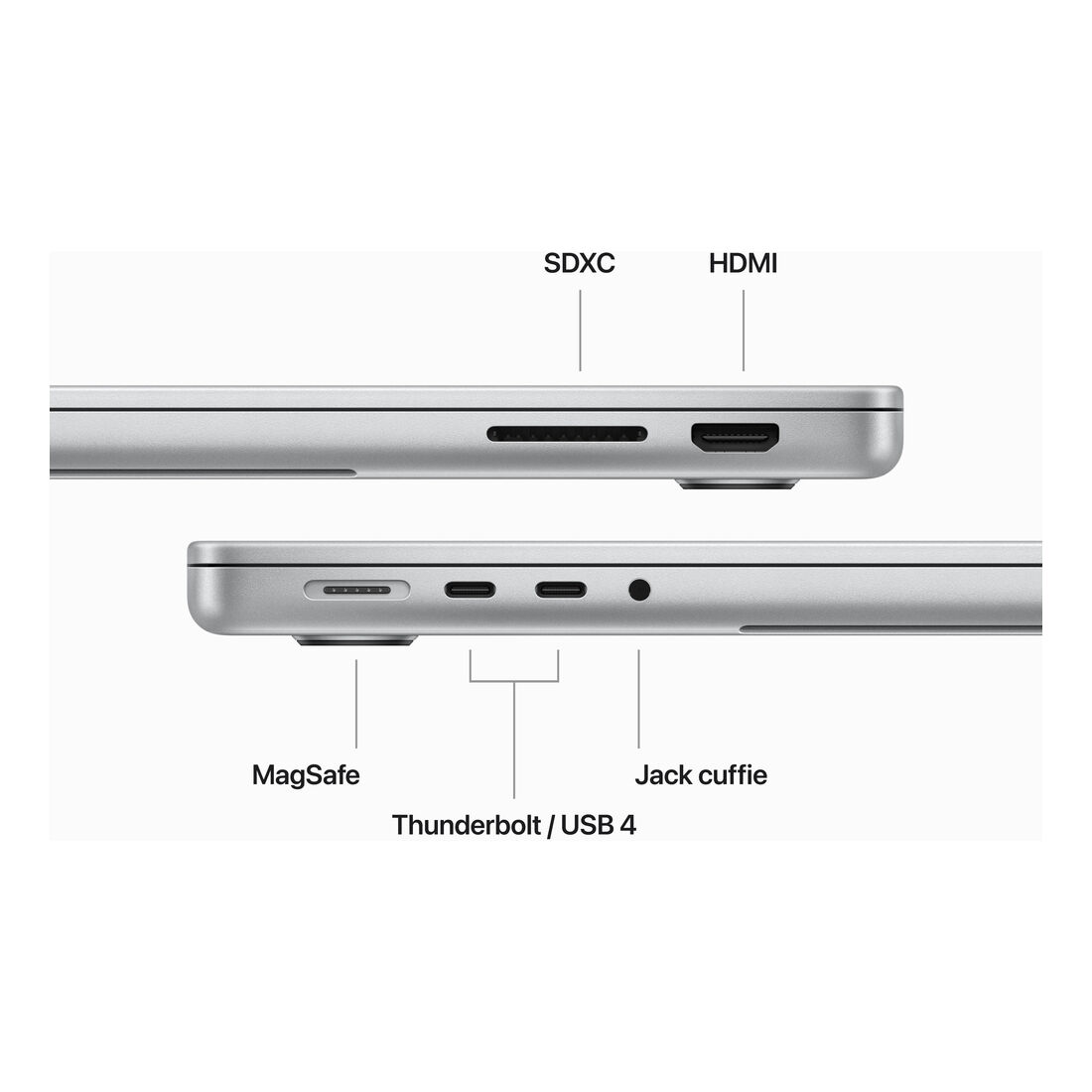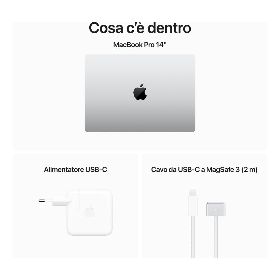 Apple MacBook Pro 14” M3 chip con 8‑core CPU e 10‑core GPU, 512GB SSD – Argento. Tipo di prodotto: Computer portatile, Fattore di forma: Clamshell. Famiglia processore: Apple M, Modello del processore: M3. Dimensioni diagonale schermo: 36,1 cm (14.2″), Risoluzione del display: 3024 x 1964 Pixel. RAM installata: 8 GB. Capacità totale di archiviazione: 512 GB, Supporto di memoria: SSD. Modello scheda grafica integrata: Apple GPU. Sistema operativo incluso: macOS Sonoma. Colore del prodotto: Argento. Peso: 1,55 kg