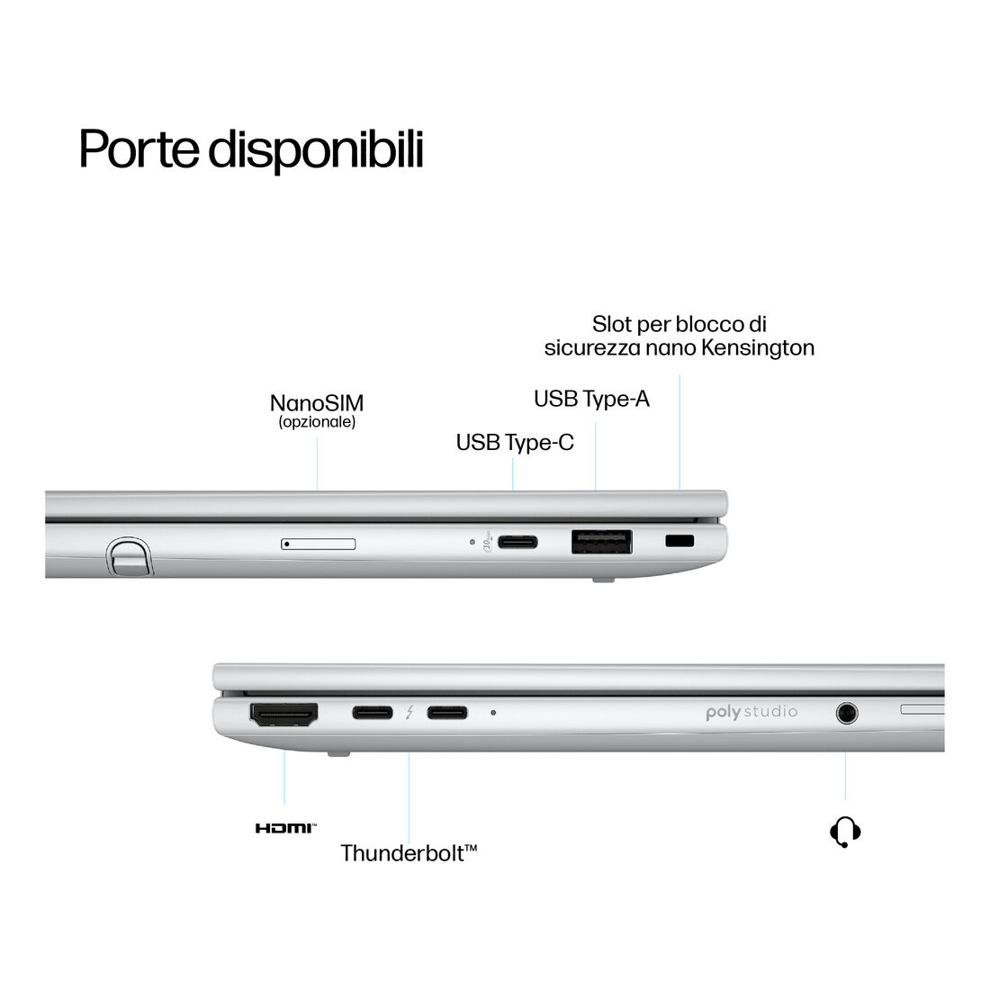 HP EliteBook 8 Flip G1i AI. Tipo di prodotto: Ibrido (2 in 1), Fattore di forma: Convertibile (a cartella). Famiglia processore: Intel Core Ultra 7, Modello del processore: 255U. Dimensioni diagonale schermo: 33,8 cm (13.3″), Tipologia HD: WUXGA, Risoluzione del display: 1920 x 1200 Pixel, Touch screen. RAM installata: 32 GB, Tipo di RAM: LPDDR5x-SDRAM. Capacità totale di archiviazione: 1 TB, Supporto di memoria: SSD. Modello scheda grafica integrata: Intel Graphics. Sistema operativo incluso: Windows 11 Pro. Colore del prodotto: Argento