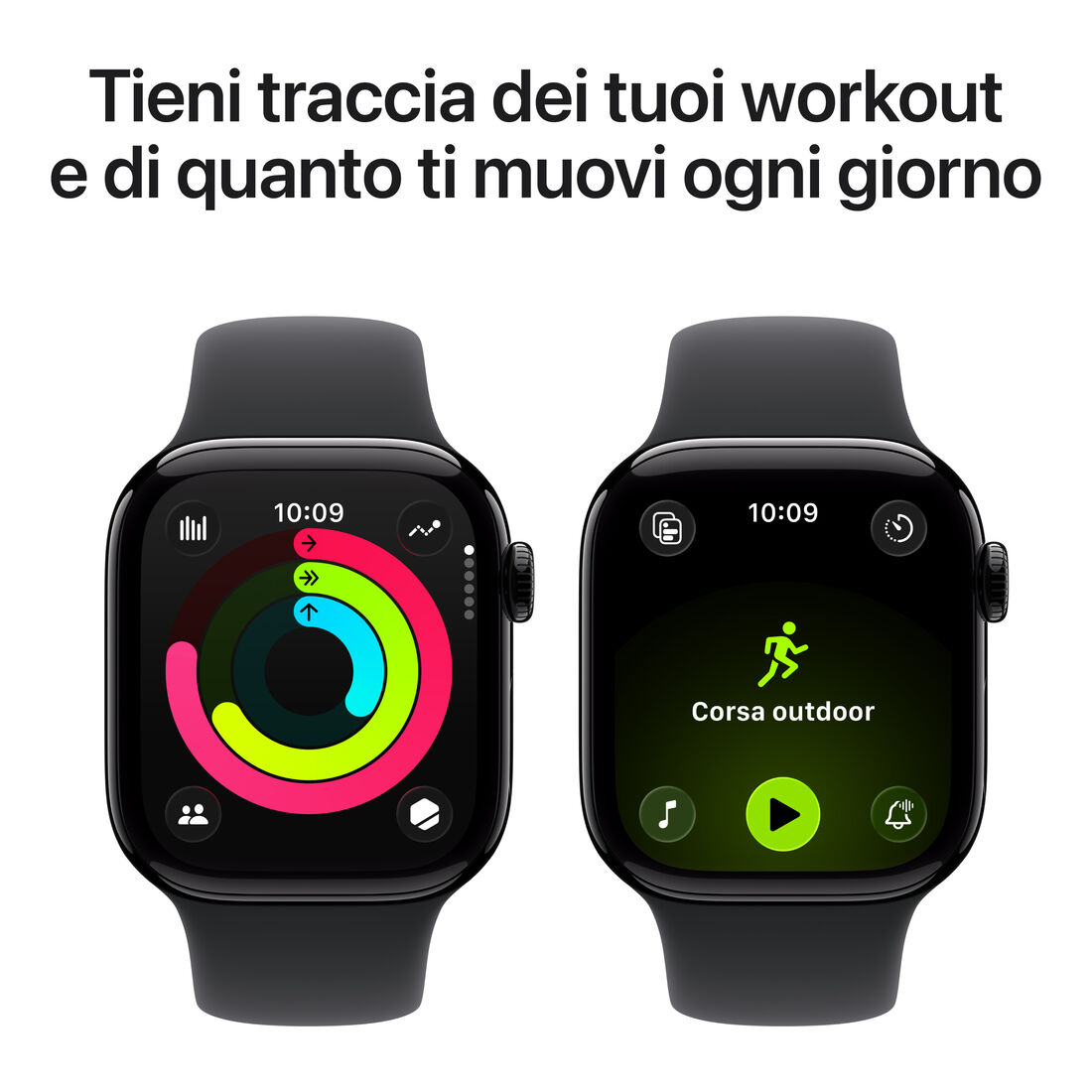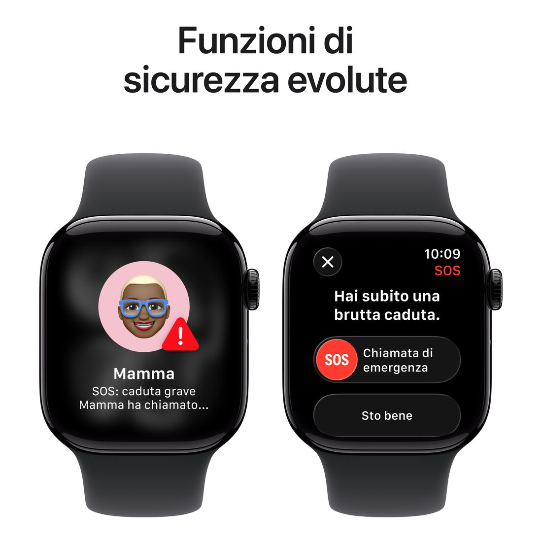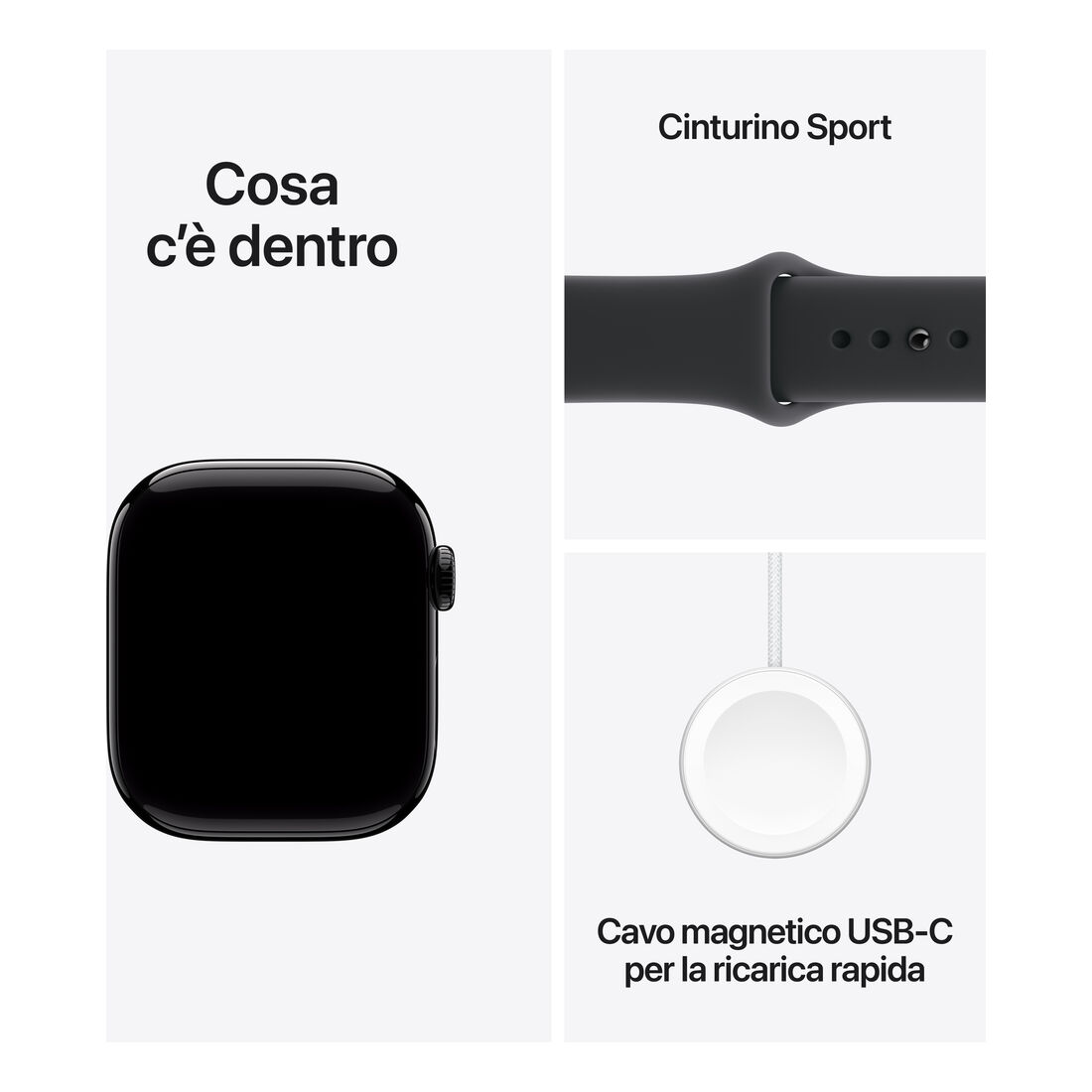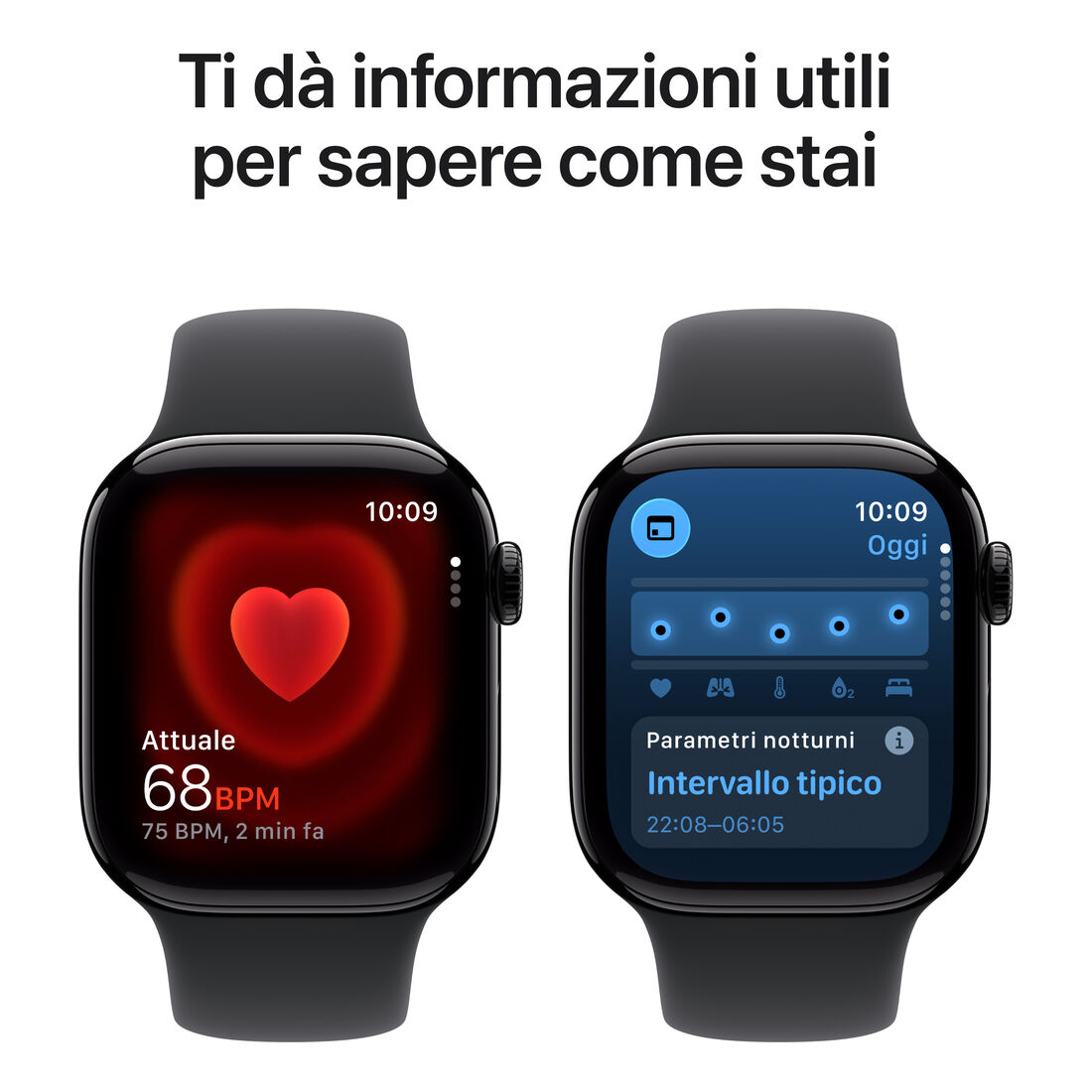 Apple Watch Series 11 GPS + Cellular 42mm Cassa Alluminio Jet Black con Sport Band Nero – M/L. Tecnologia display: OLED, Risoluzione del display: 374 x 446 Pixel, Touch screen. Memoria flash: 64 GB. Wi-Fi. GPS (satellitare). Peso: 29,7 g. Impermeabile fino a: 50 m, Materiale cinturino: Gomma, Colore cinturino: Nero, Dimensione del cinturino: M/L. Sistema operativo incluso: watchOS 11