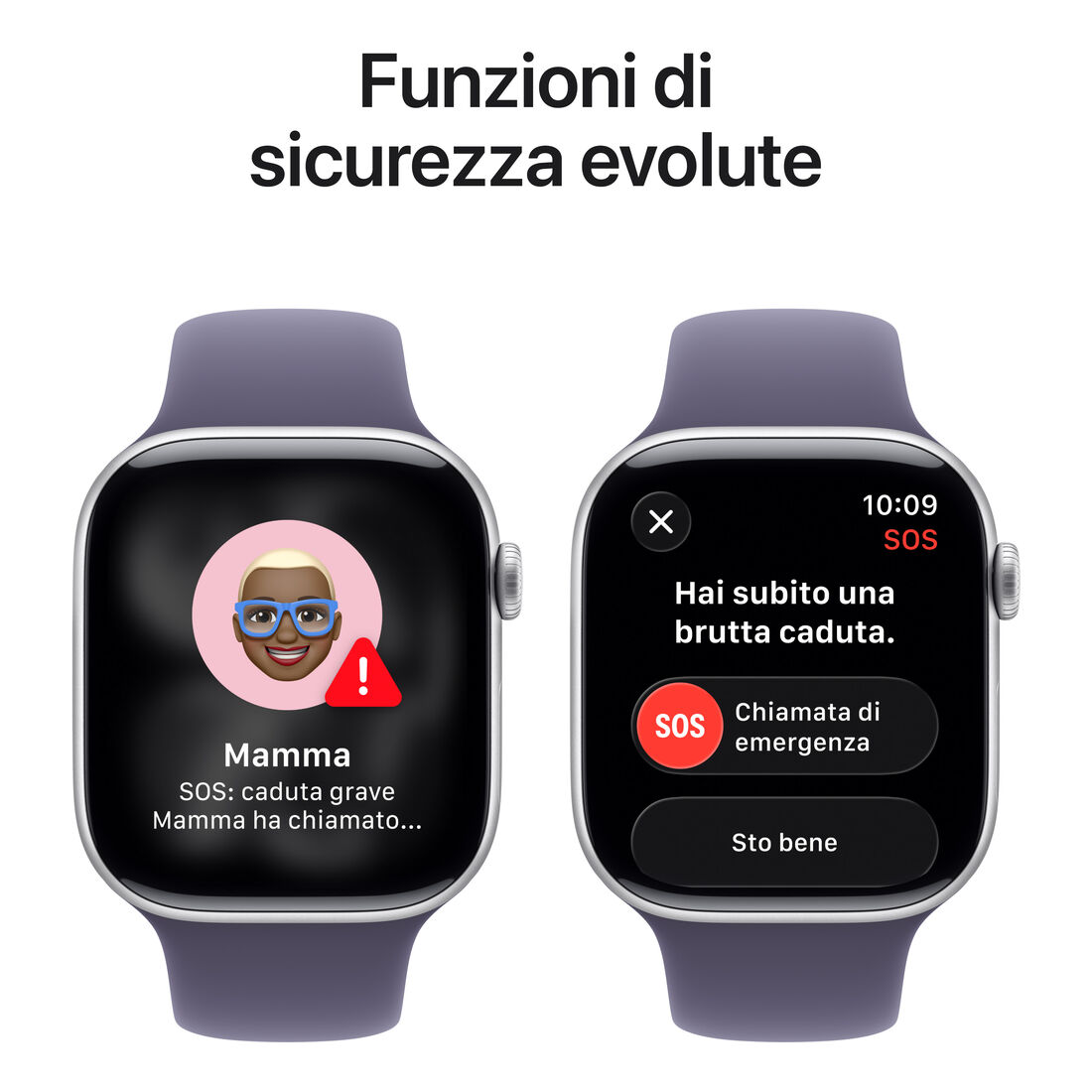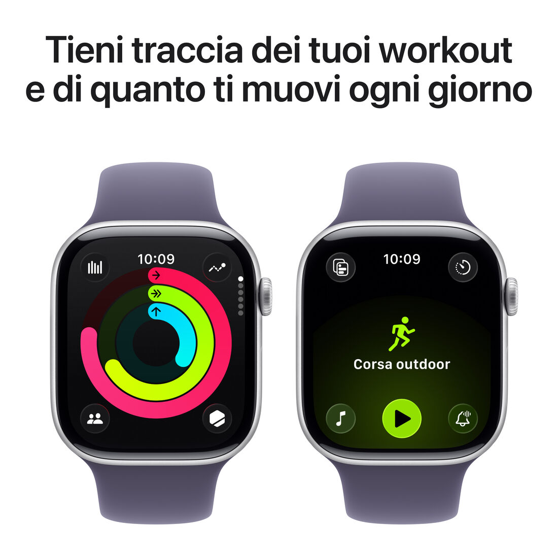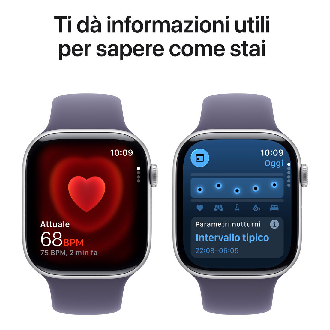 Apple Watch Series 11 GPS + Cellular 46mm Cassa Alluminio Argento con Sport Band Viola Nebbia – M/L. Tecnologia display: OLED, Risoluzione del display: 416 x 496 Pixel, Touch screen. Memoria flash: 64 GB. Wi-Fi. GPS (satellitare). Peso: 36,9 g. Impermeabile fino a: 50 m, Materiale cinturino: Gomma, Colore cinturino: Viola, Dimensione del cinturino: M/L. Sistema operativo incluso: watchOS 11