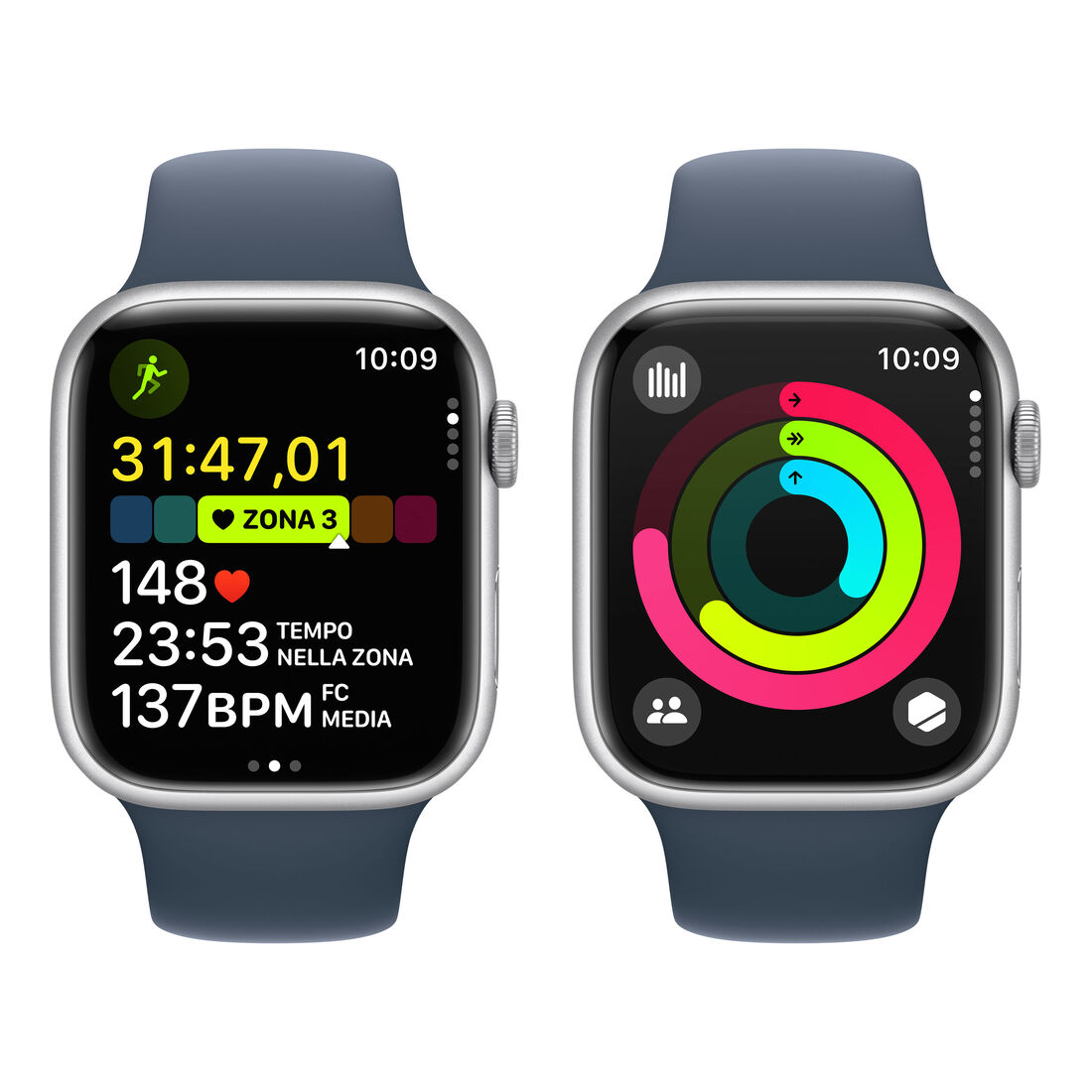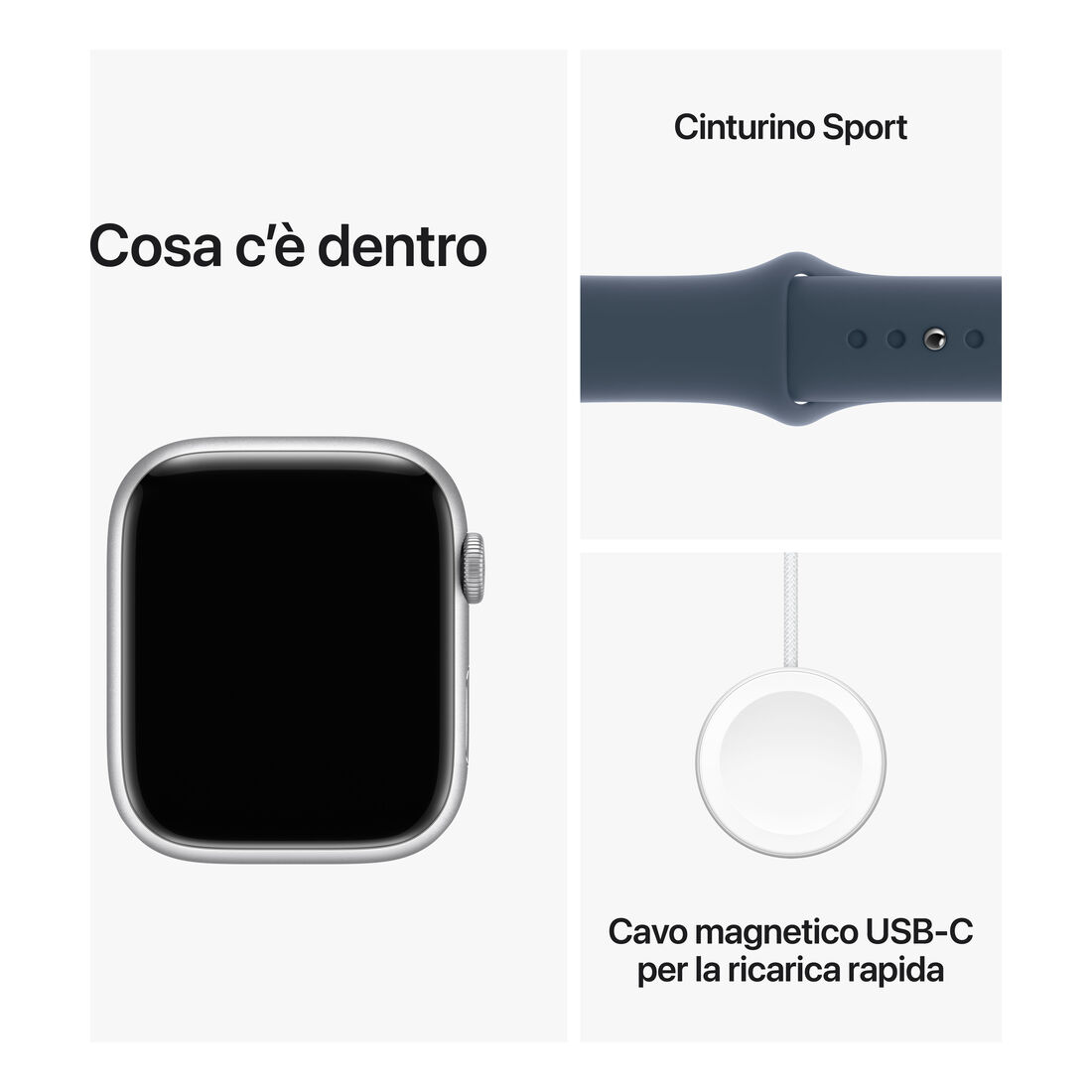 Apple Watch Series 9 GPS Cassa 45mm in Alluminio Argento con Cinturino Sport Blu Tempesta – M/L