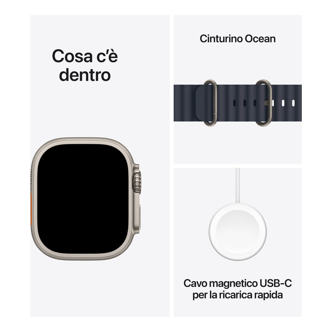 Apple Watch Ultra 2 GPS + Cellular 49mm Cassa in Titanio con Navy Ocean Band. Tecnologia display: OLED, Risoluzione del display: 410 x 502 Pixel, Touch screen. Memoria flash: 64 GB. Wi-Fi. GPS (satellitare). Peso: 61,4 g. Impermeabile fino a: 100 m, Colore cinturino: Blu marino. Sistema operativo incluso: watchOS 11